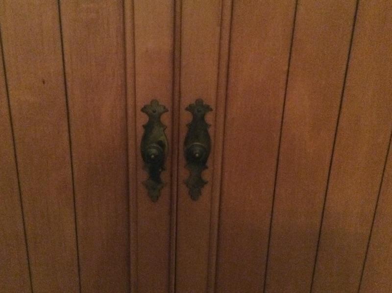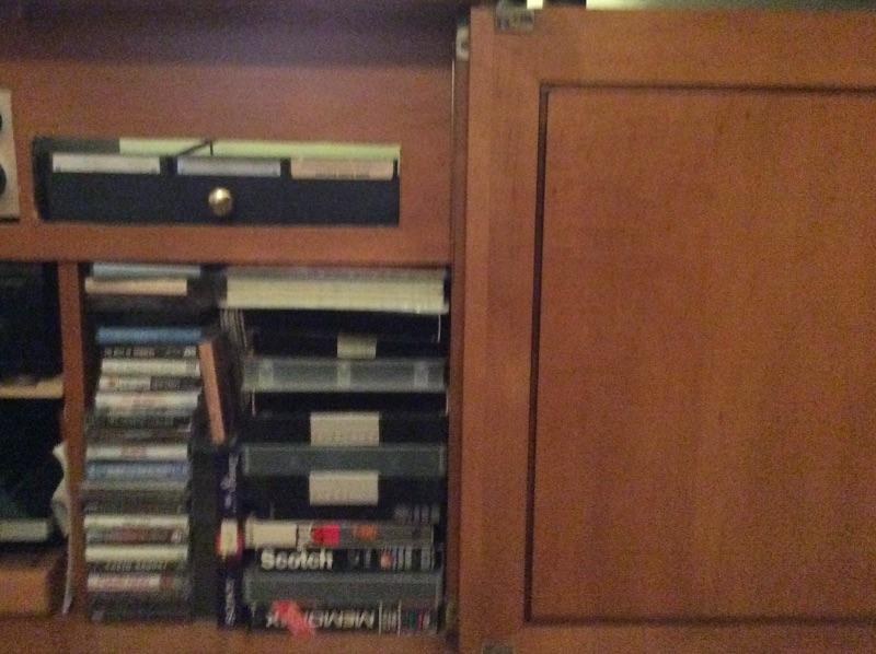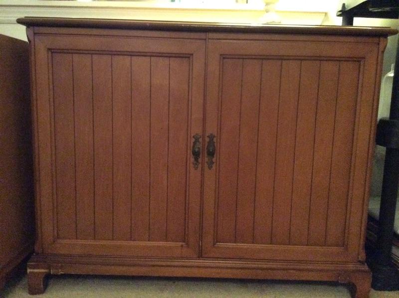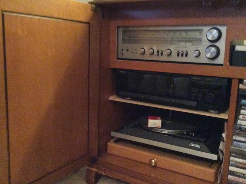 Vintage, wooden cabinet holds your electronics and has storage room for cassettes, vinyls and more. Wear noted, but solid piece. Cabinet only, nothing inside is included. Bring help to move.