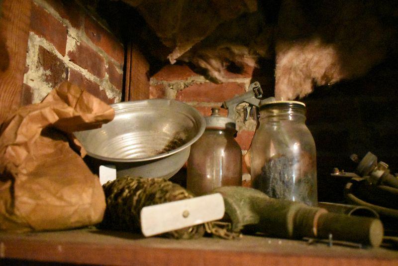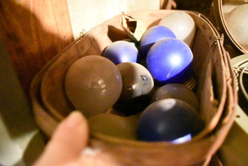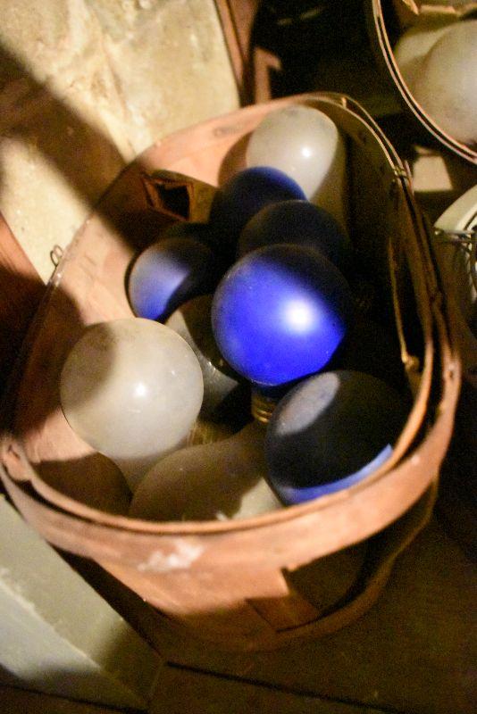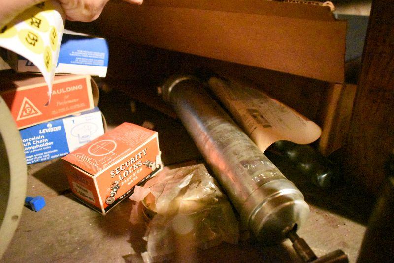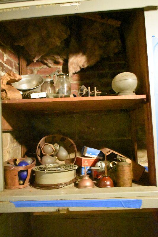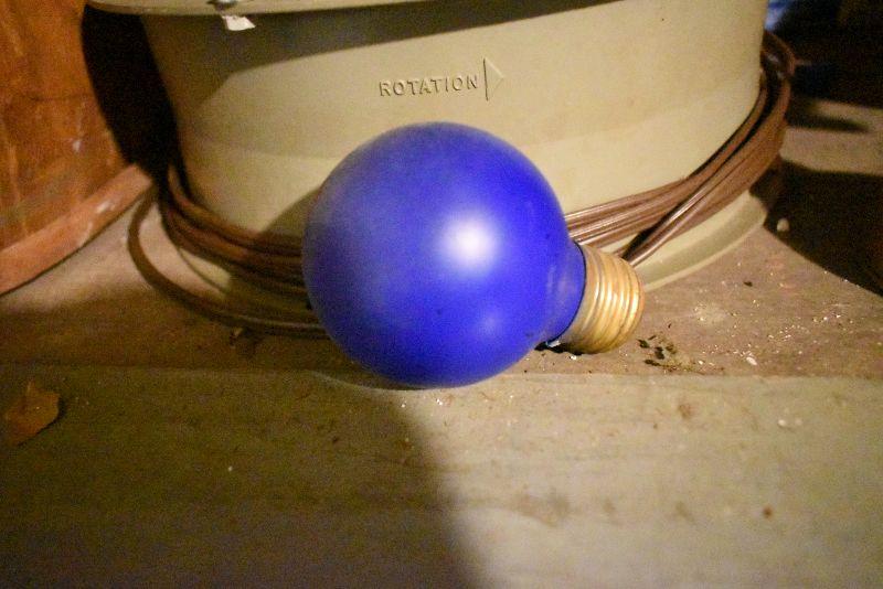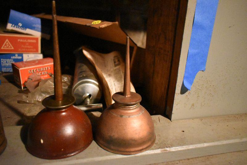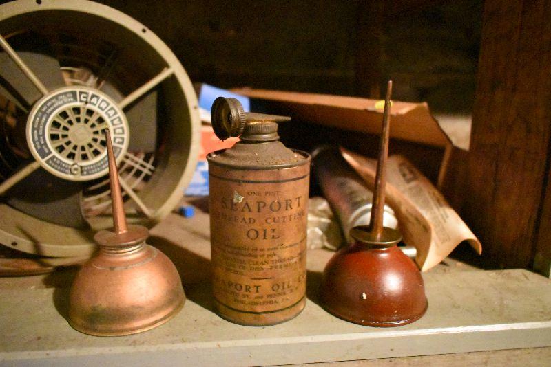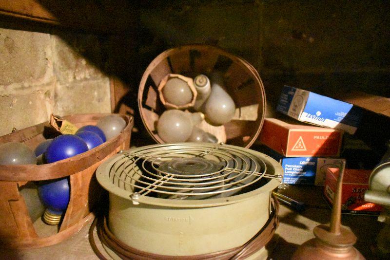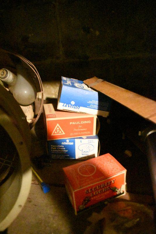Colored light bulbs, untested, oil cans, light fixtures, mason jars, one has metal spray attachment, chains, fan, Dual Ratio Lever Gun, new in box, and more. Bring box and help to move from basement.