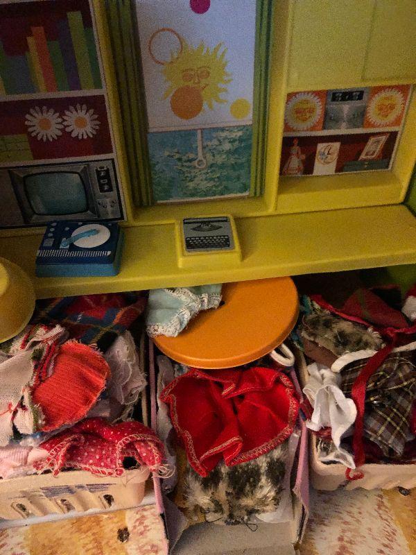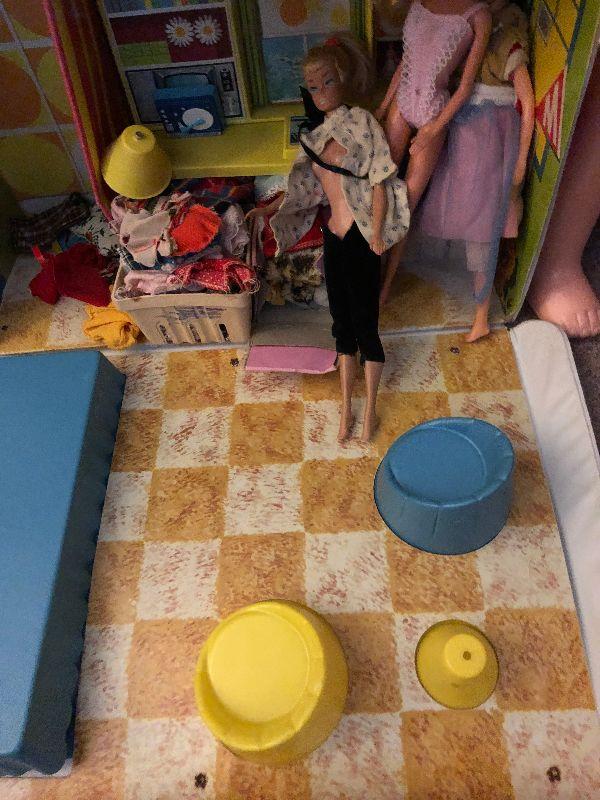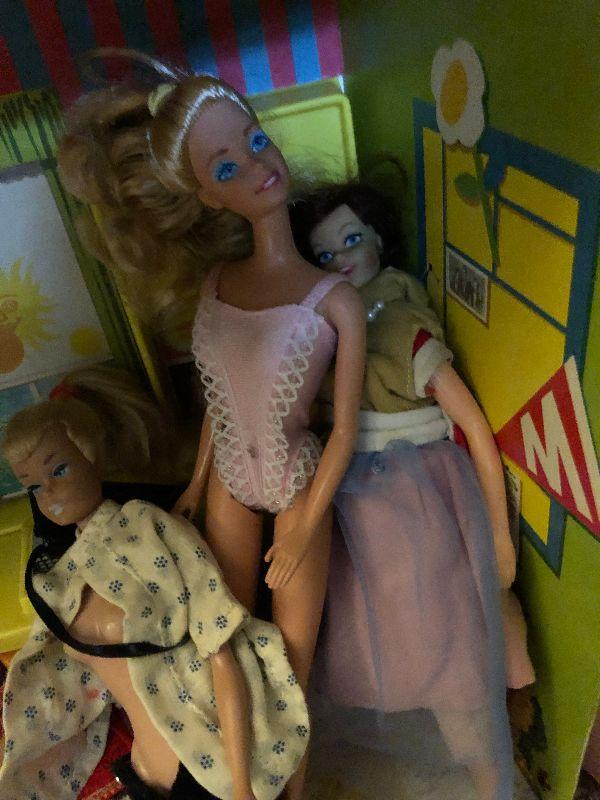 Vintage Barbie's with house (includes clothing), 1 Large Barbie, 2 TY Beanie Babies, dolls of all sizes and extra doll clothing.