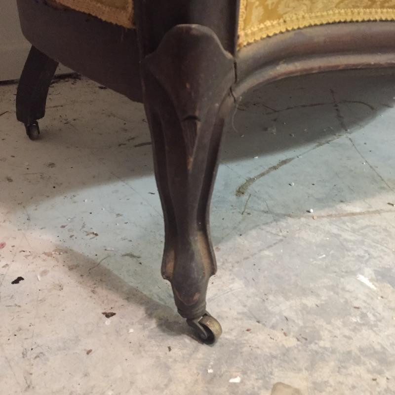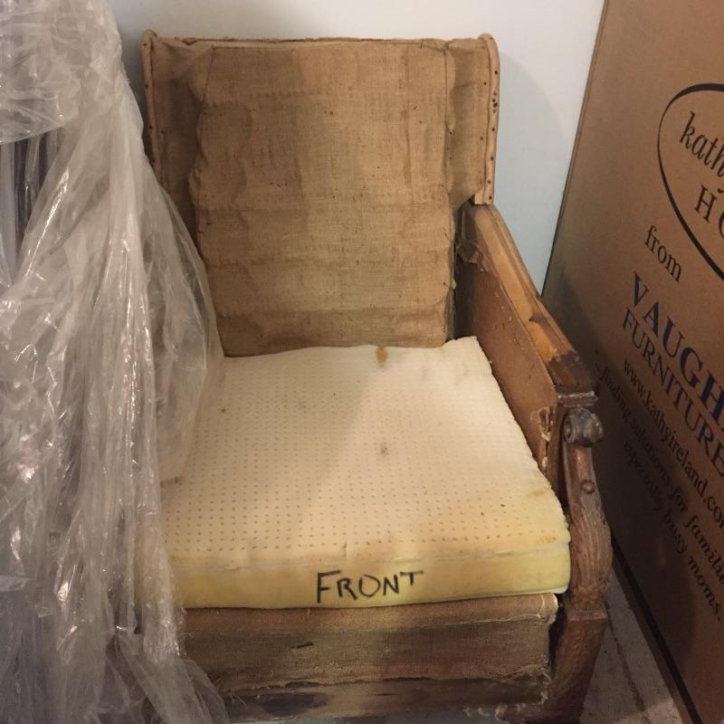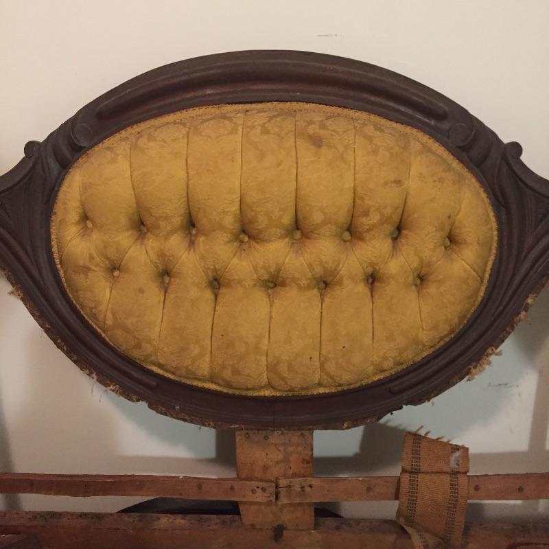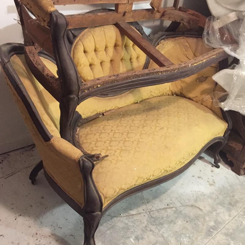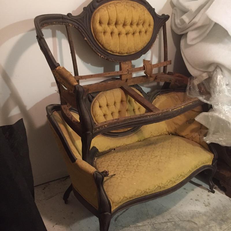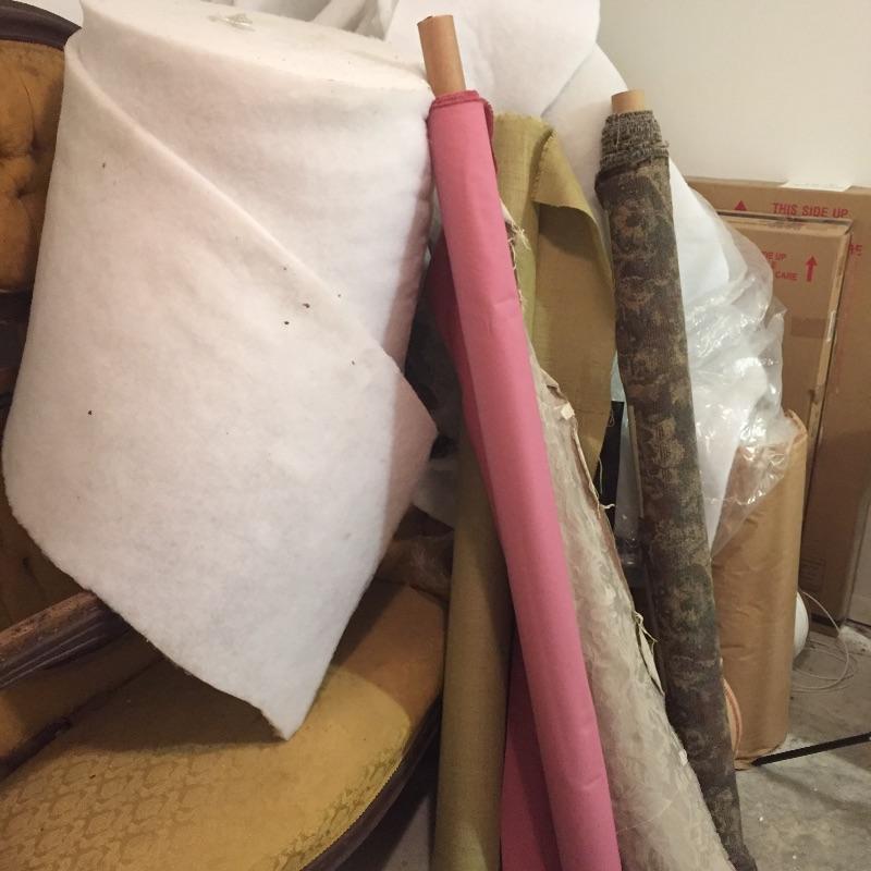 A trio of vintage pieces awaits an upholsterer to restore them to their former glory, see images. This lot also includes an assortment of fabric and batting.