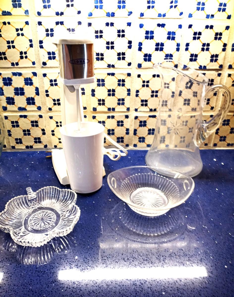 VINTAGE IONA DAIRY-BAR MIXER MODEL DM-1, GLASS CANDY DISHES AND GLASS PITCHER