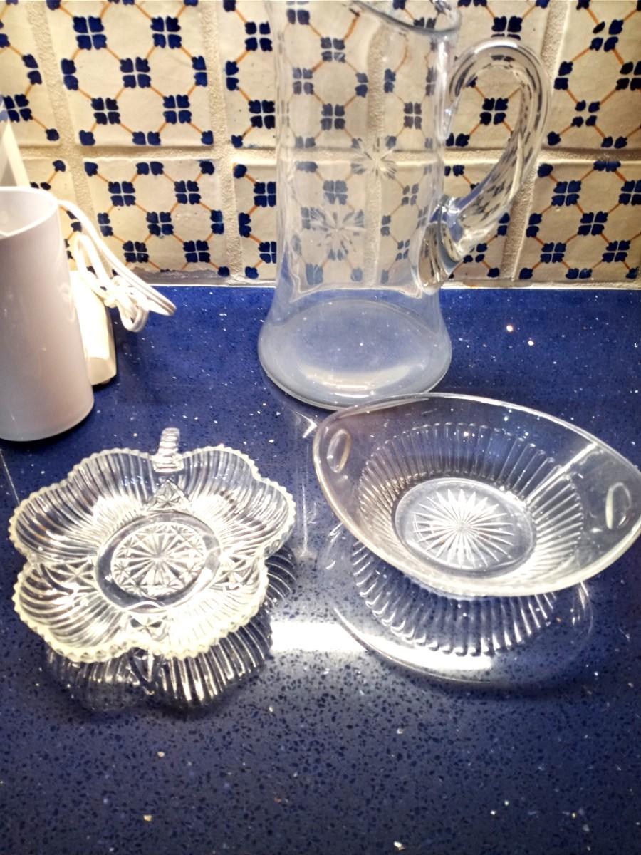 LOT 129 VINTAGE IONA DAIRY-BAR MIXER-GLASS CANDY DISHES AND PITCHER