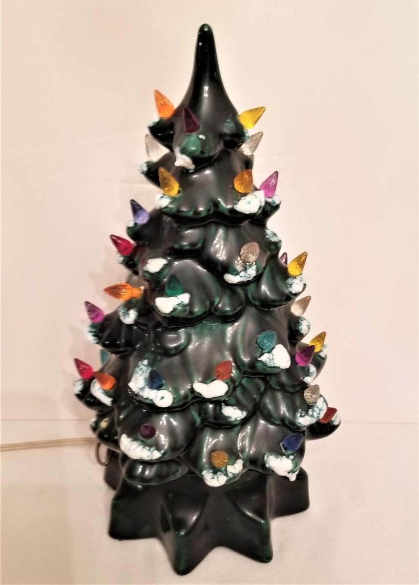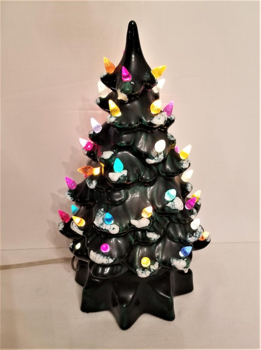 Vintage Ceramic Christmas Tree, Complete with all lights, musical base plays Jingle Bells. Stands 12.5" tall, switch on cord. Good condition - the smaller ones are harder to find.