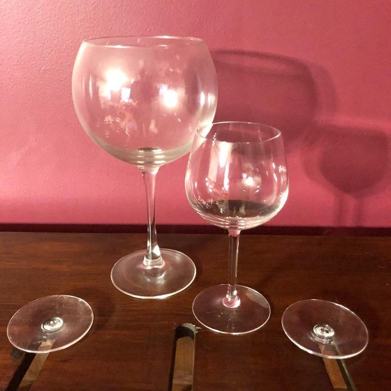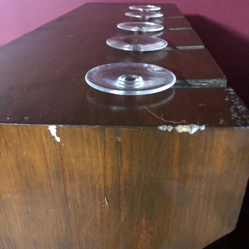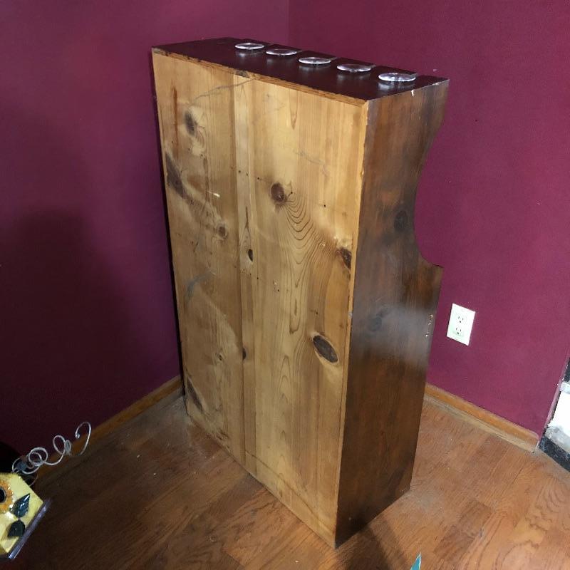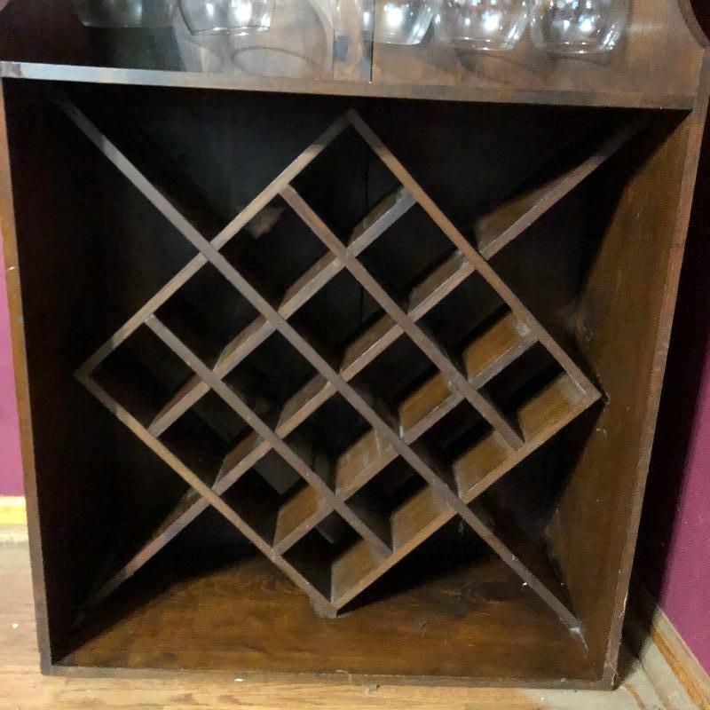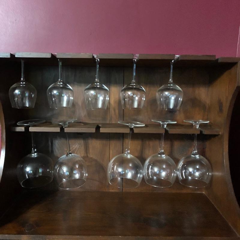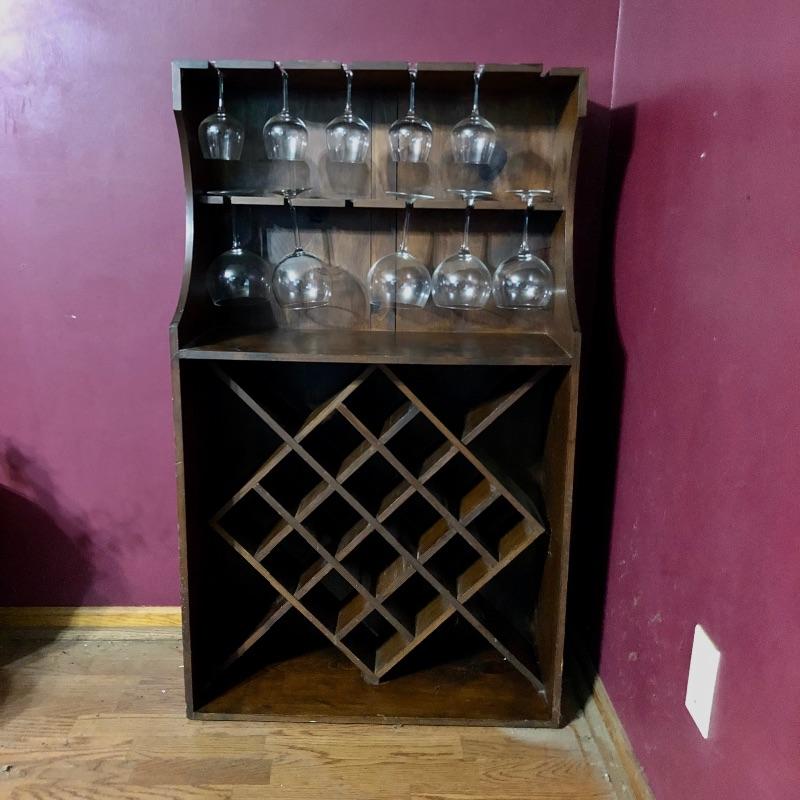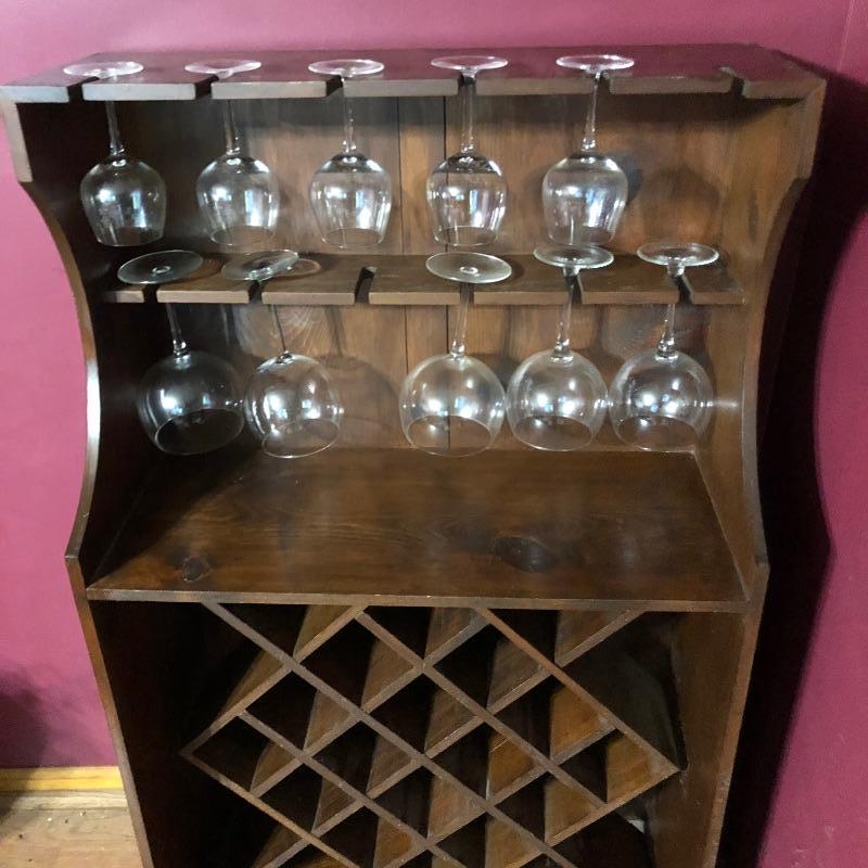 Two for one in this lovely wooden wine bottle and glass holder. Function and beauty all in one elegant piece. Wood is undetermined, but it appears to be a darker wood. It holds at least 12 bottles and 12 glasses, this lot includes five smaller stemmed glasses and five larger ones. There are a few blemishes on this piece that need refinishing that are shown on the latter images.