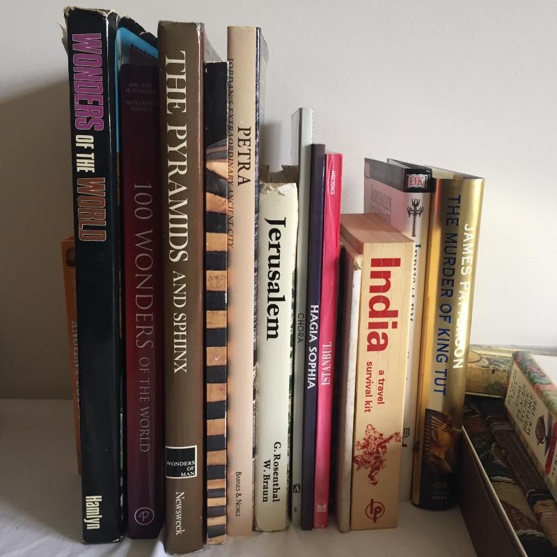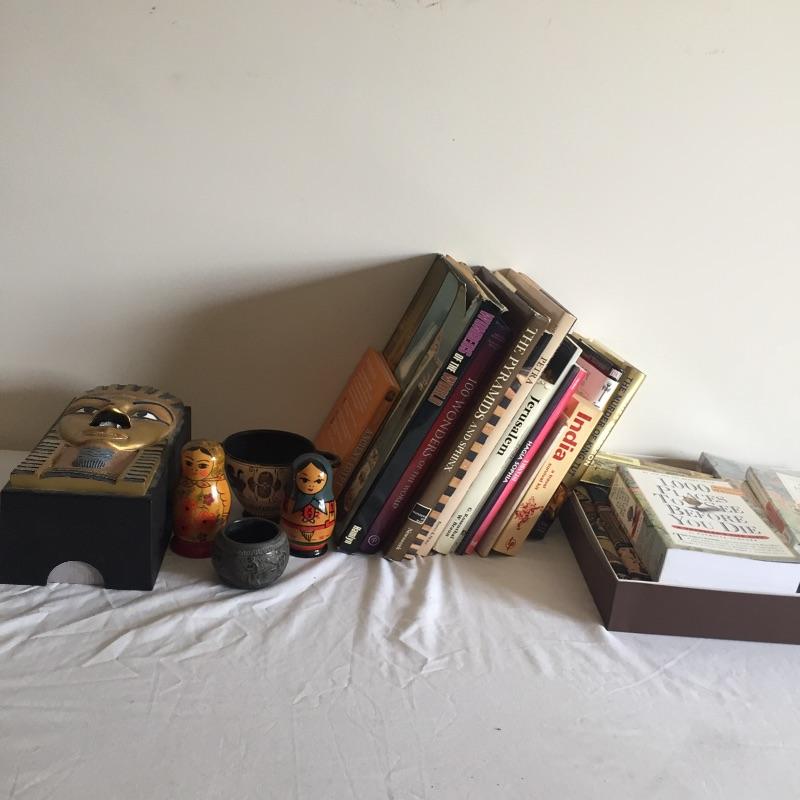 Nice assortment of travel books , photo albums , souvenirs and more. Read all about the places you want to travel to and then save the memories in the photo albums.