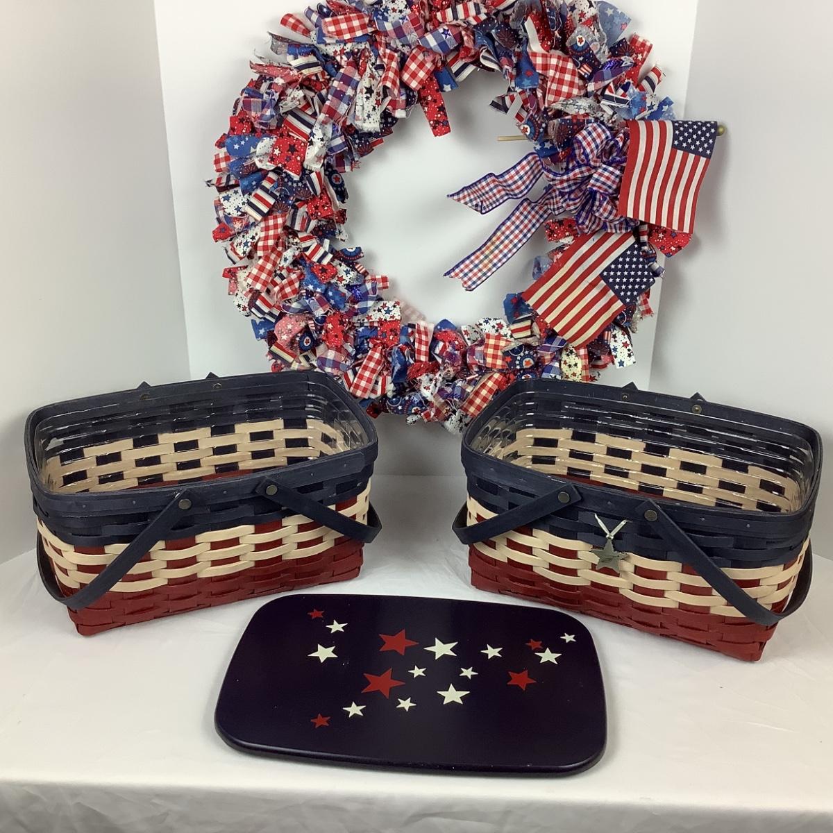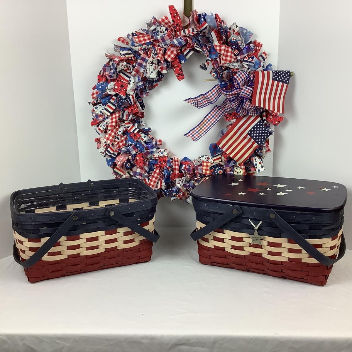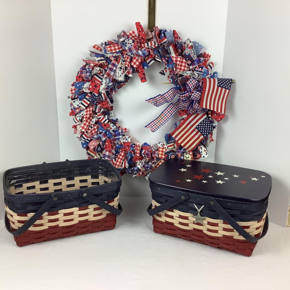 Lot # 1293 Pair of Longaberger 2011 Americana Medium Market Baskets, One Lid & Red, White & Blue Wreath