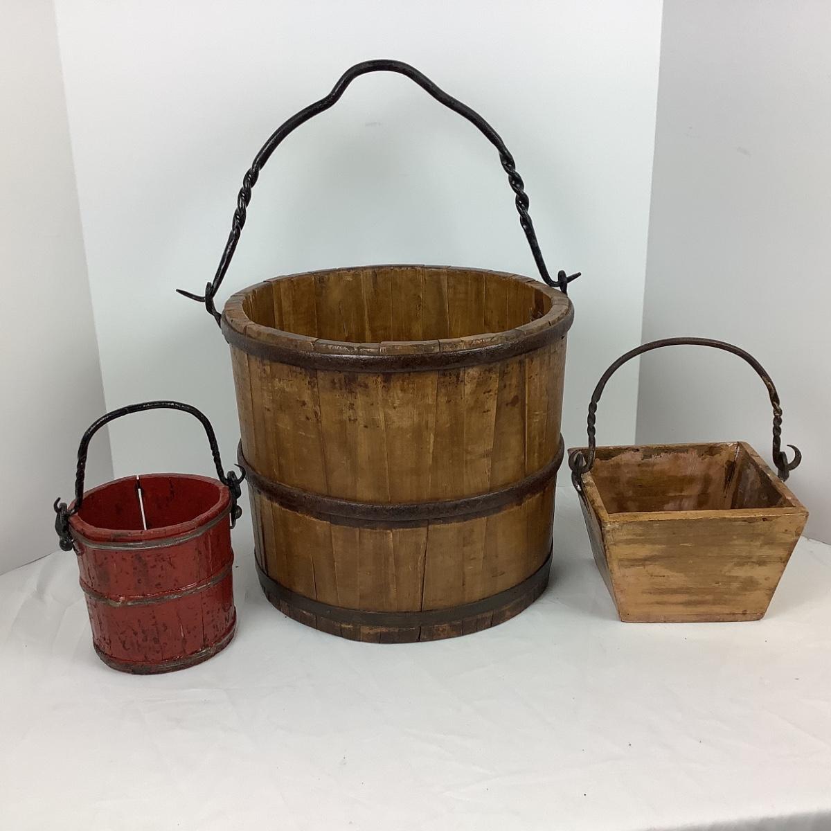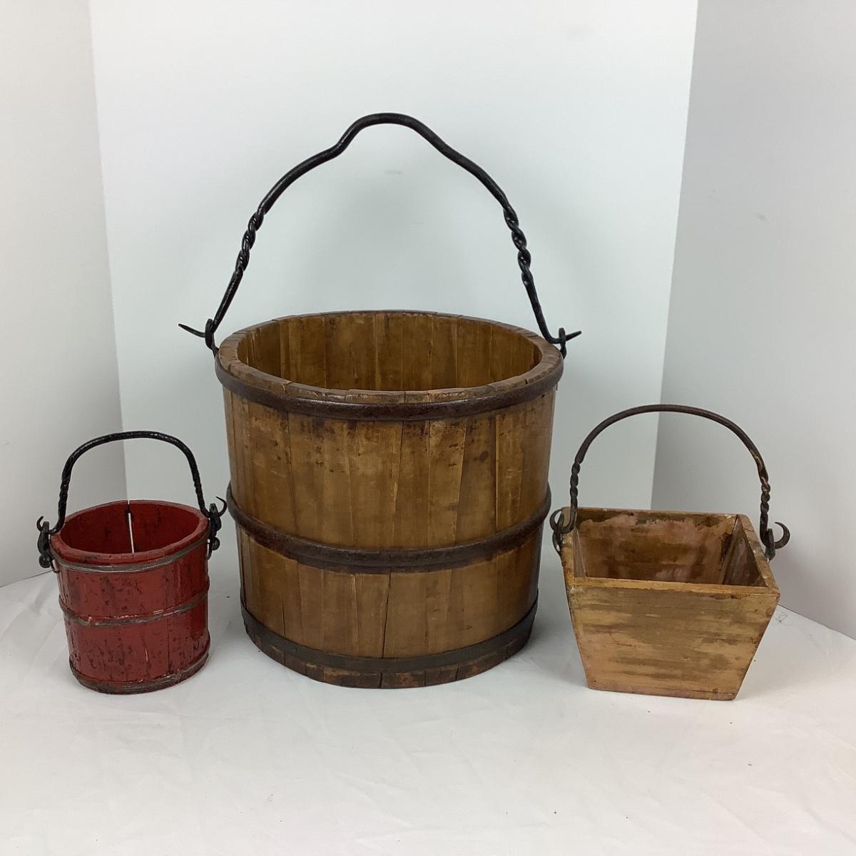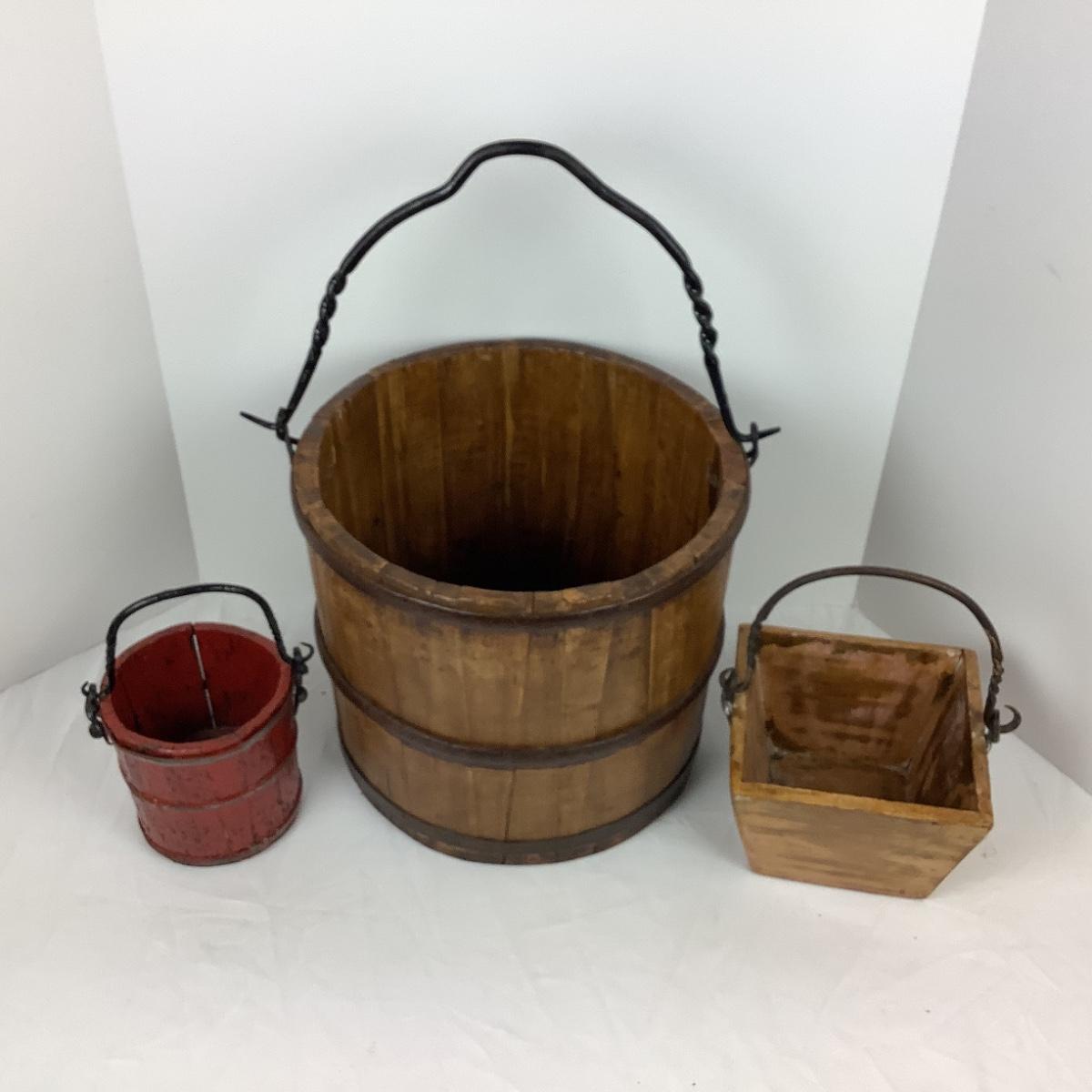Lot # 1298 Lot of Weathered Wooden Buckets with Wrought Iron Handles