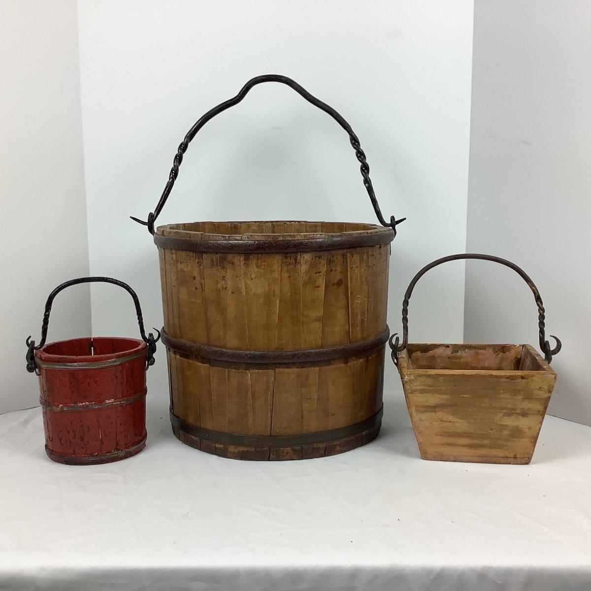 Lot of Weathered Wooden Buckets with Wrought Iron Handles
