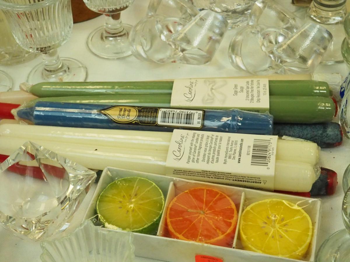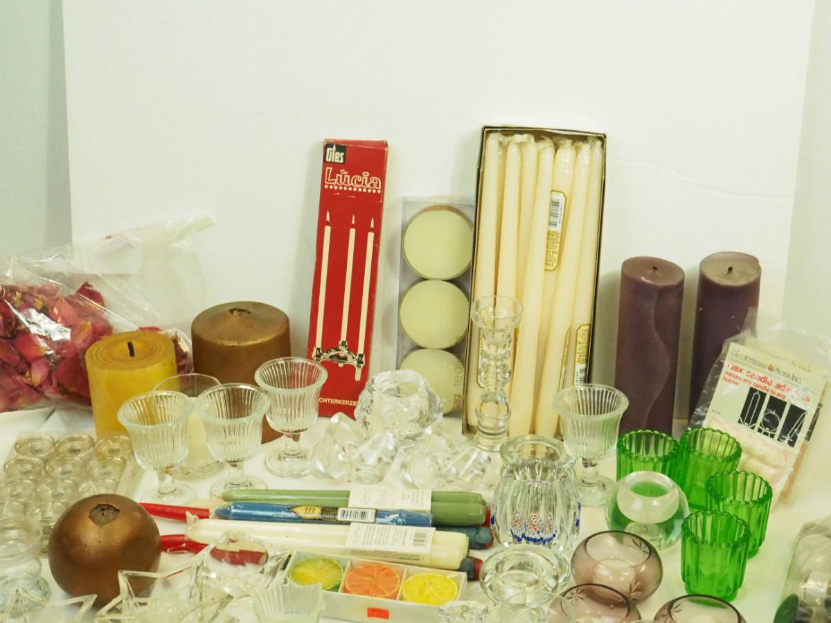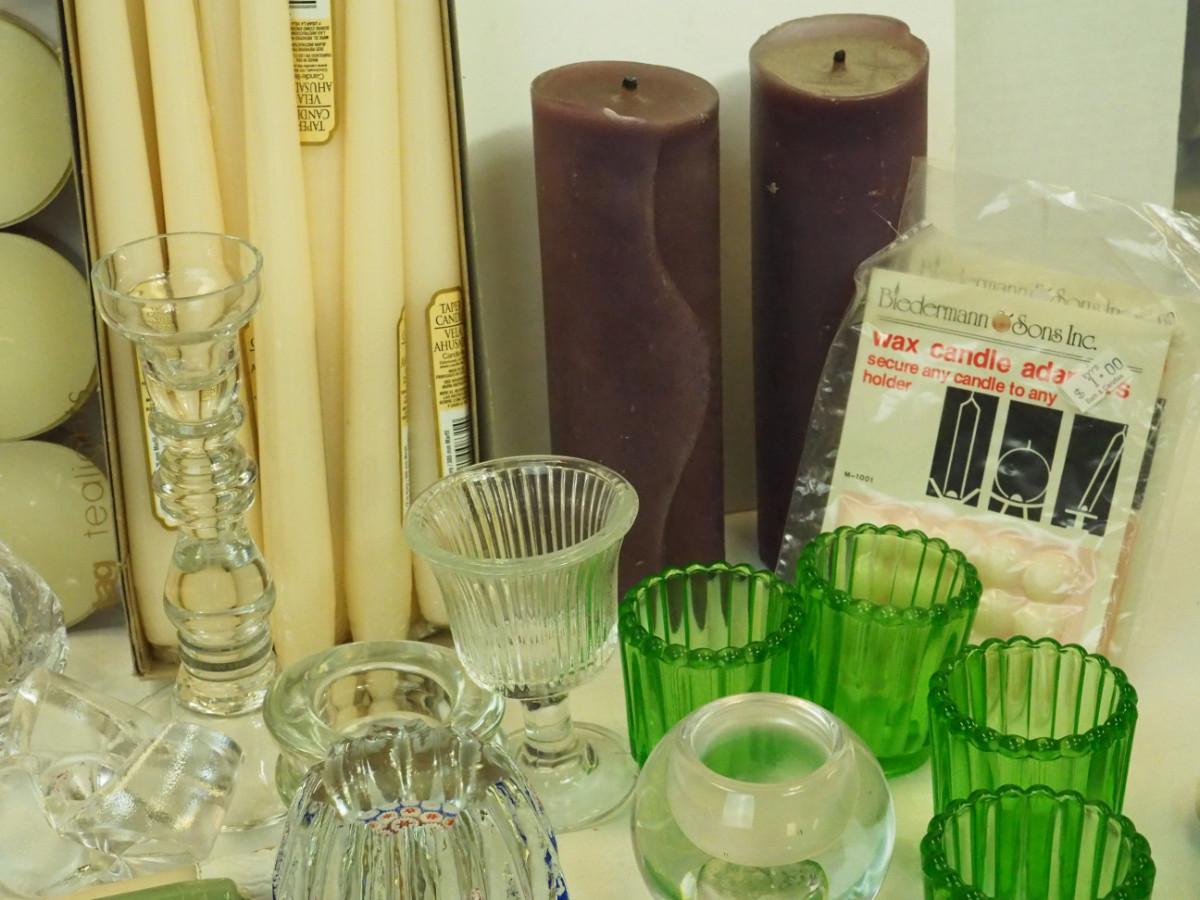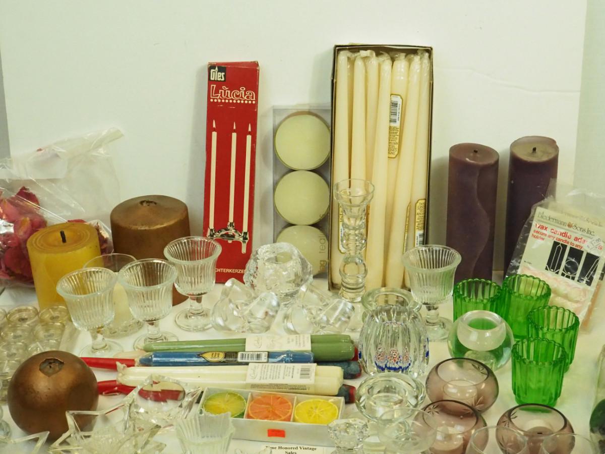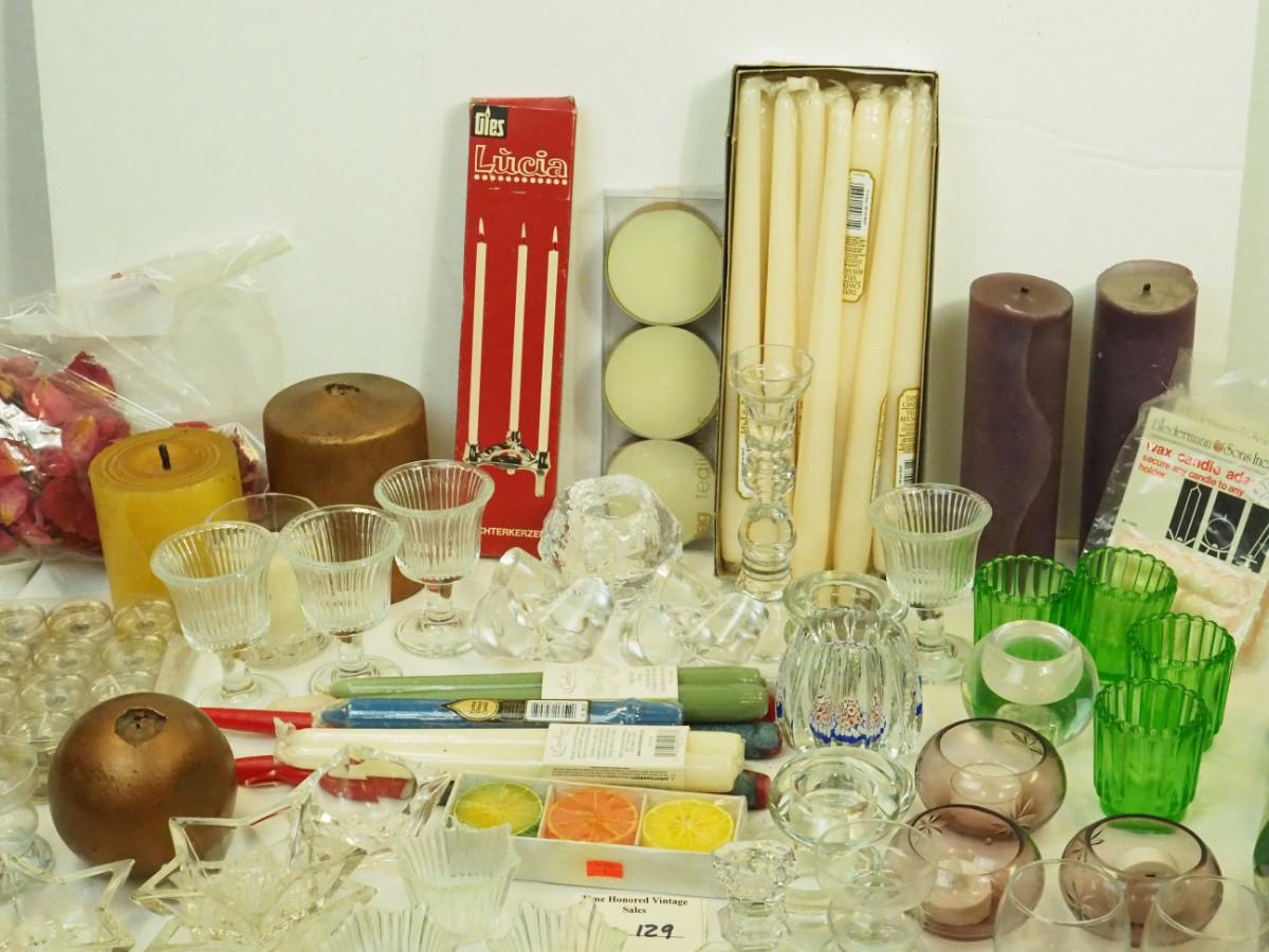 Lot 129-Large lot of candles, candle holders, tea lights . Potpourri, Rolled beeswax candles, vintage metal in box, 12 unused tapers, Vintage purple glass holders, Millefiori glass paperweight, fruit candles .