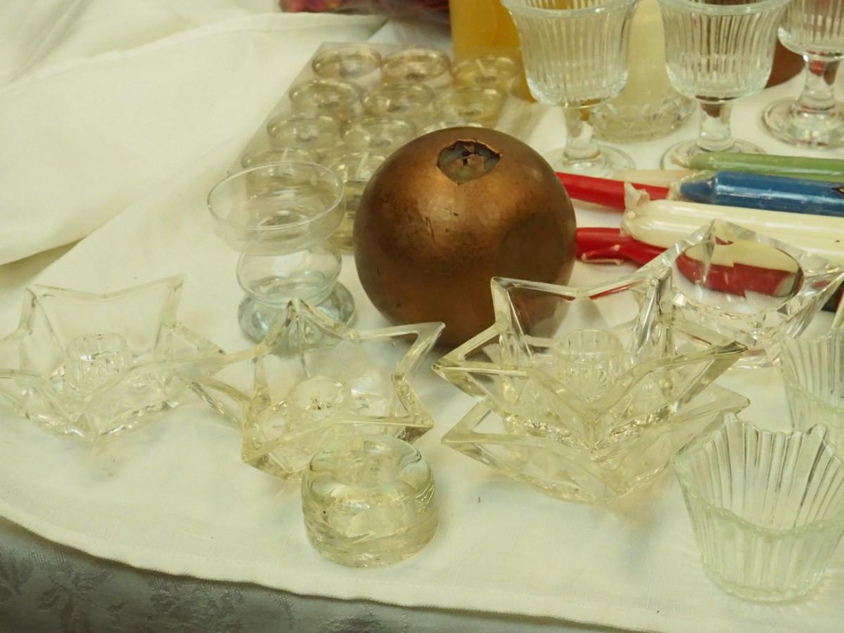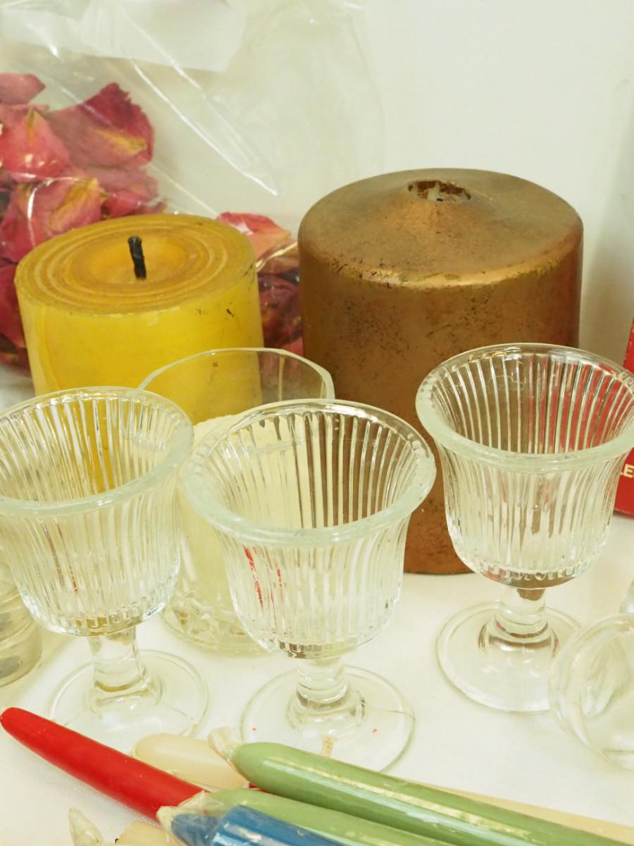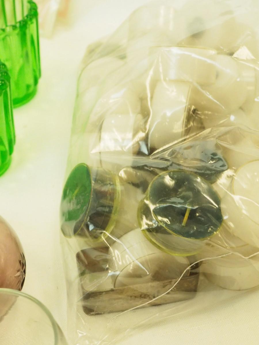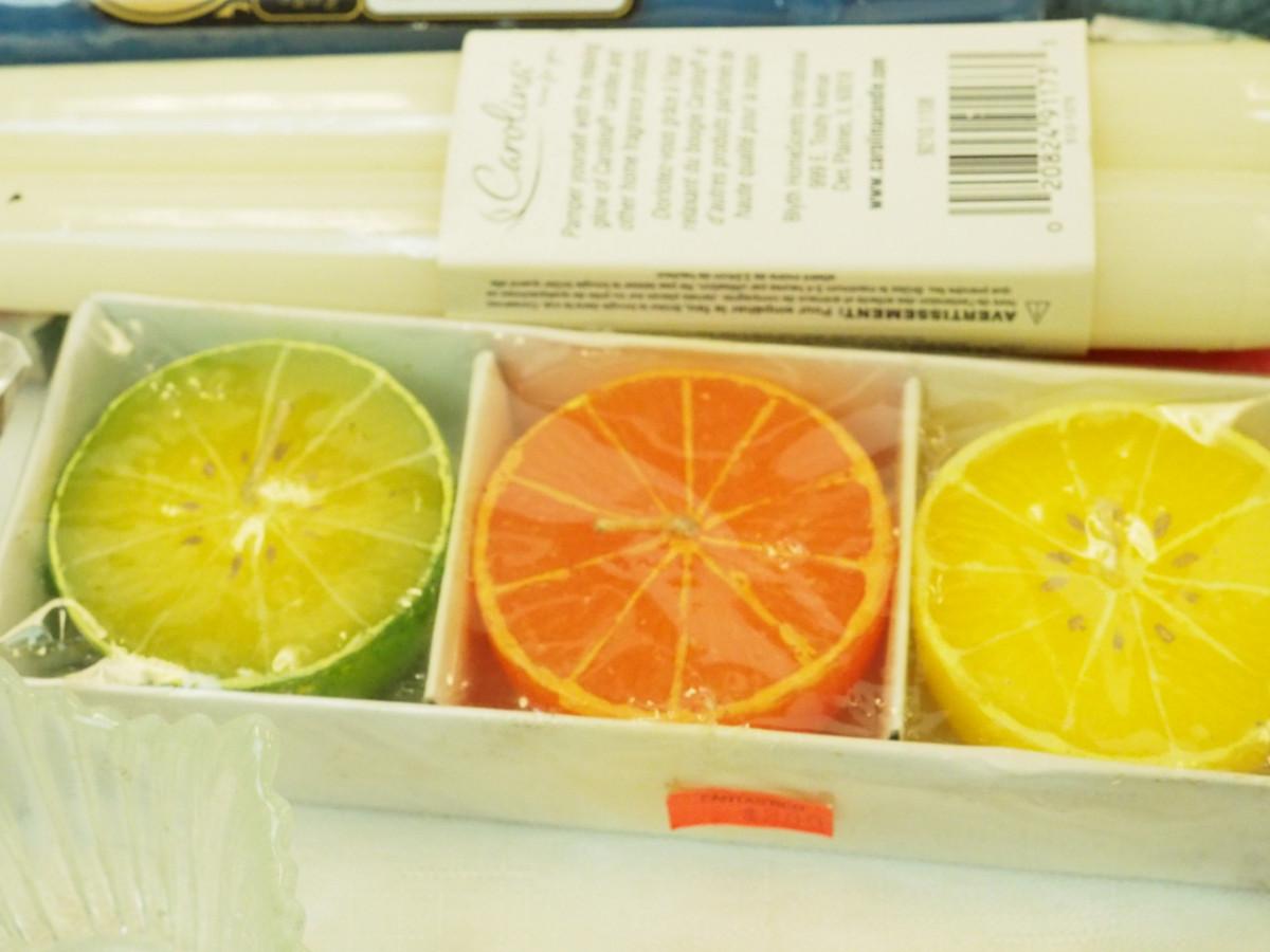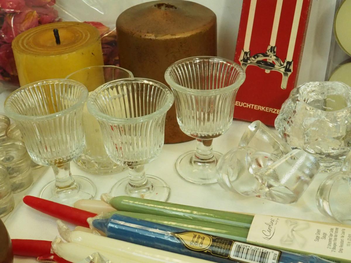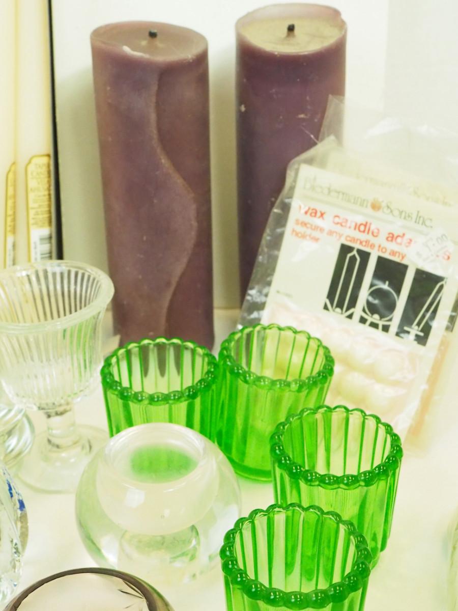 Lot 129-Large lot of candles, candle holders, tea lights . Potpourri, Rolled beeswax candles, vintage metal in box, 12 unused tapers, Vintage purple glass holders, Millefiori glass paperweight, fruit candles .