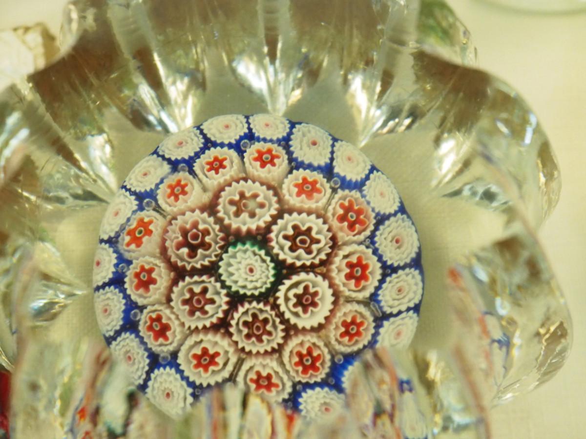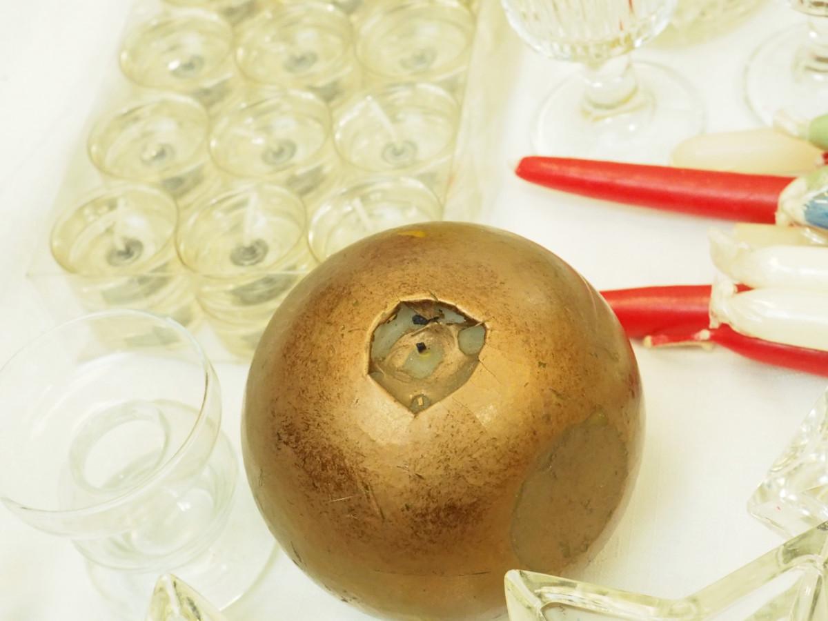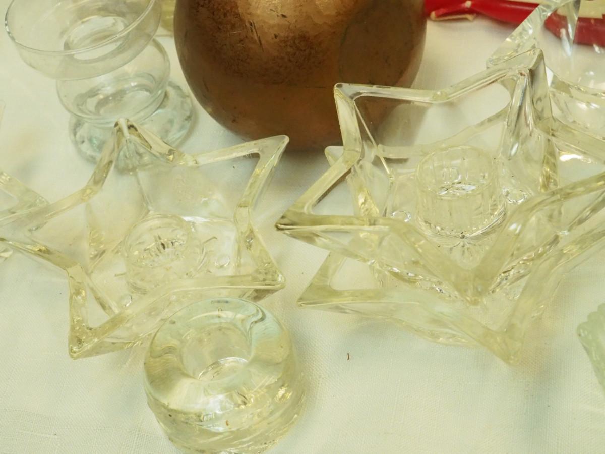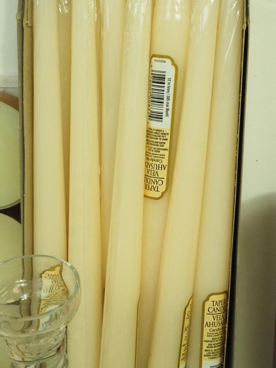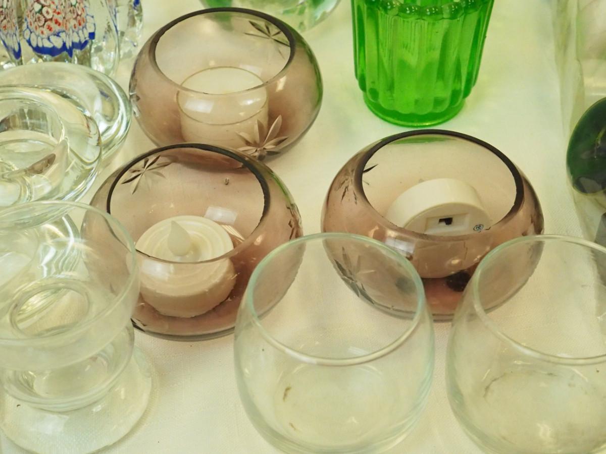 Lot 129-Large lot of candles, candle holders, tea lights . Potpourri, Rolled beeswax candles, vintage metal in box, 12 unused tapers, Vintage purple glass holders, Millefiori glass paperweight, fruit candles .