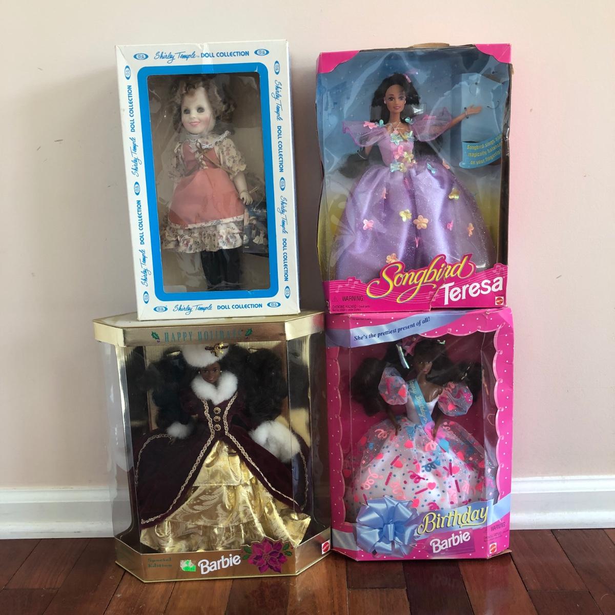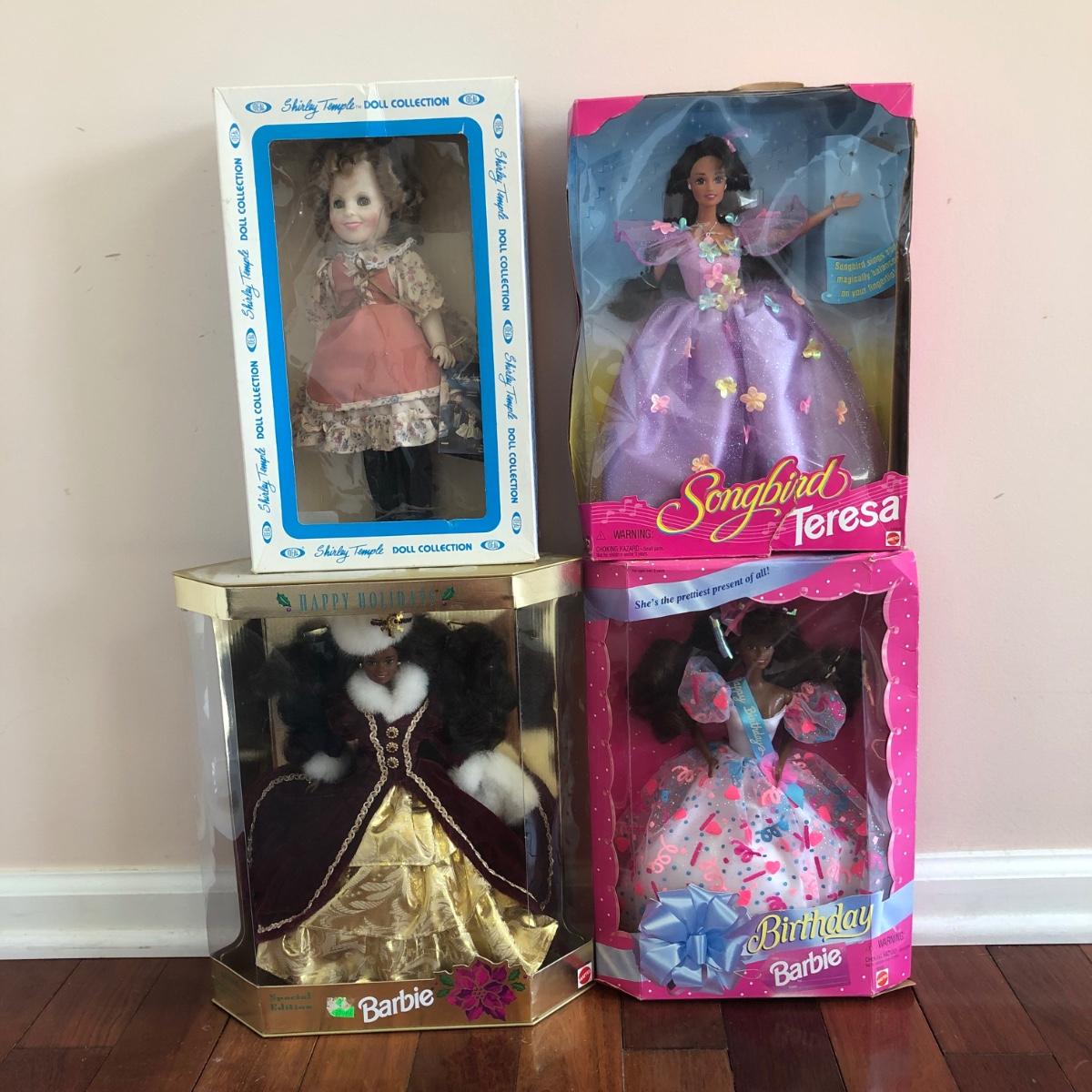 LOT 12G: Vintage Boxed Dolls - 1983 Ideal Shirley Temple, 1996 Happy Holidays Barbie, 1994 Birthday Barbie & 1995 Songbird Teresa