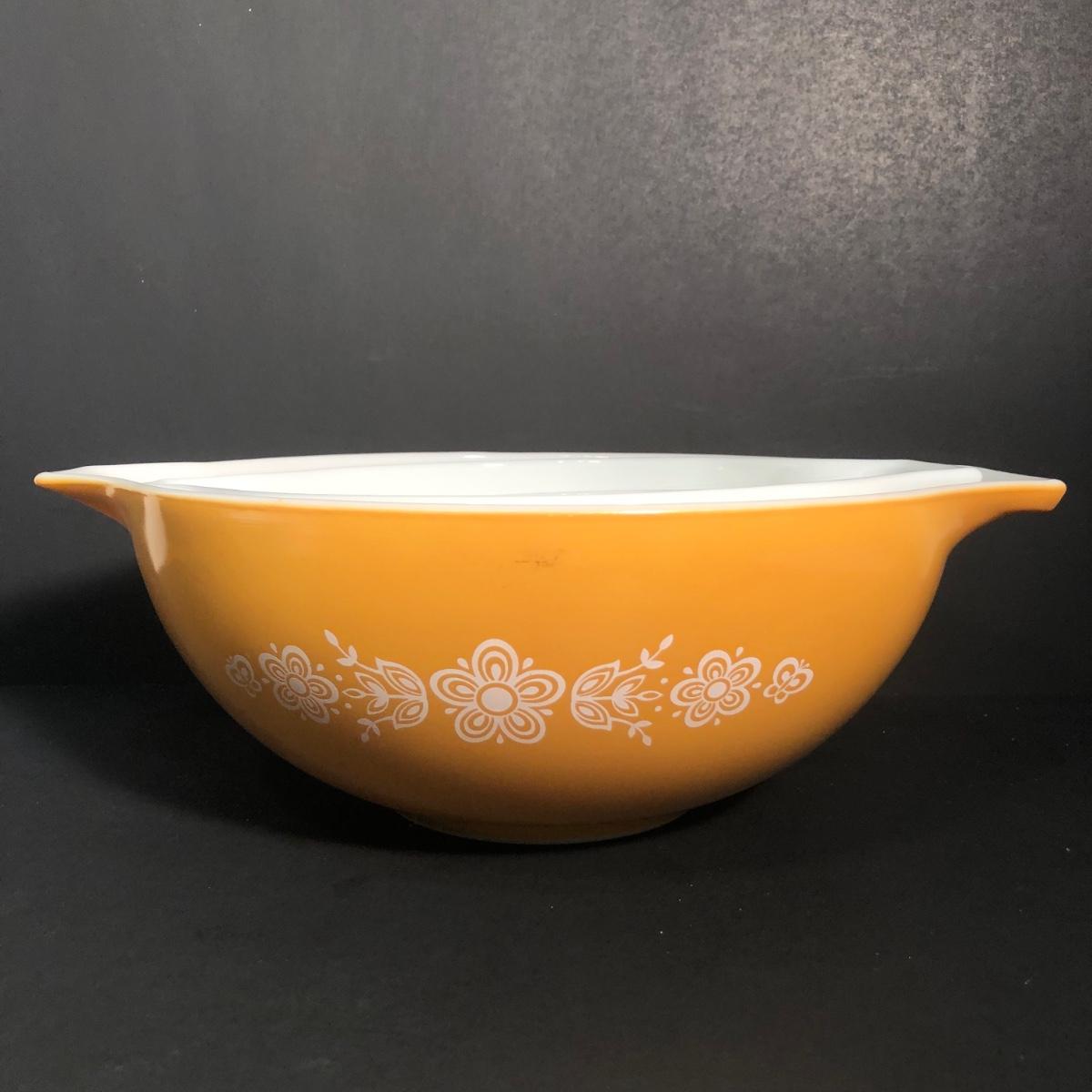 LOT 12L: Vintage Pyrex Butterfly Gold Pattern Cinderella Nesting Mixing Bowls (3) w/ Matching Corelle Bowl