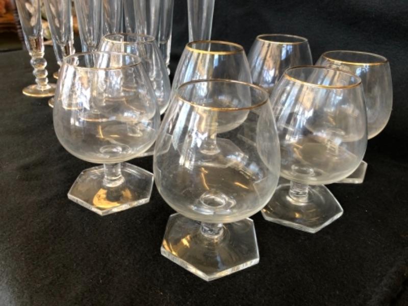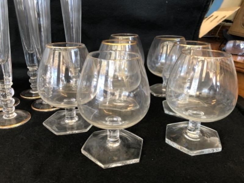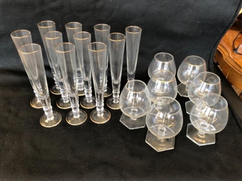 Lot 12P. Stemware: Venetian Murano Glass with gold rims, 7 brandy, 11 champagne “”