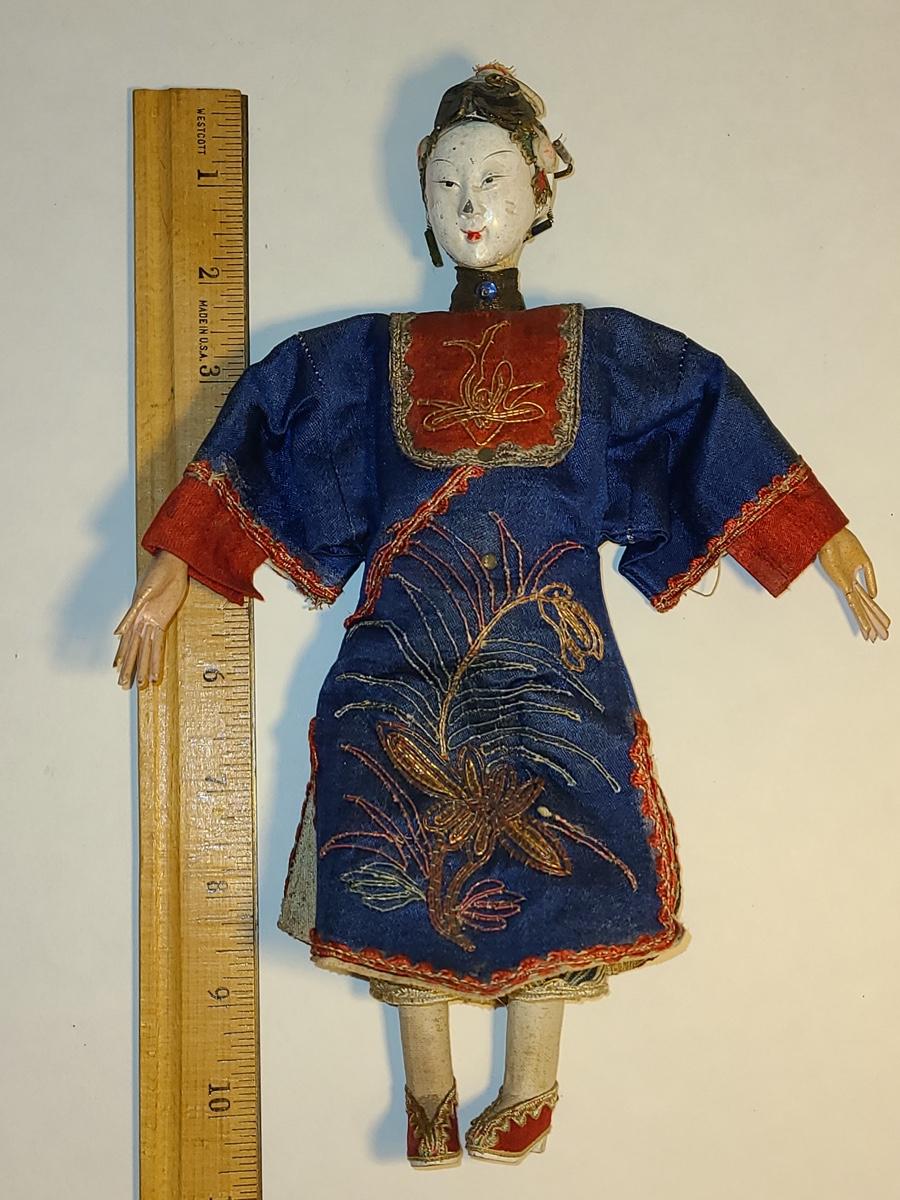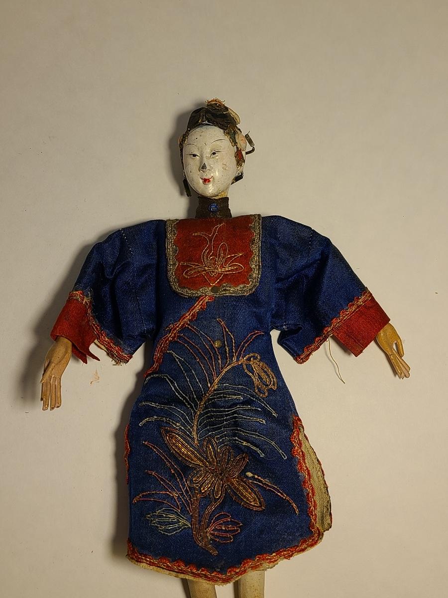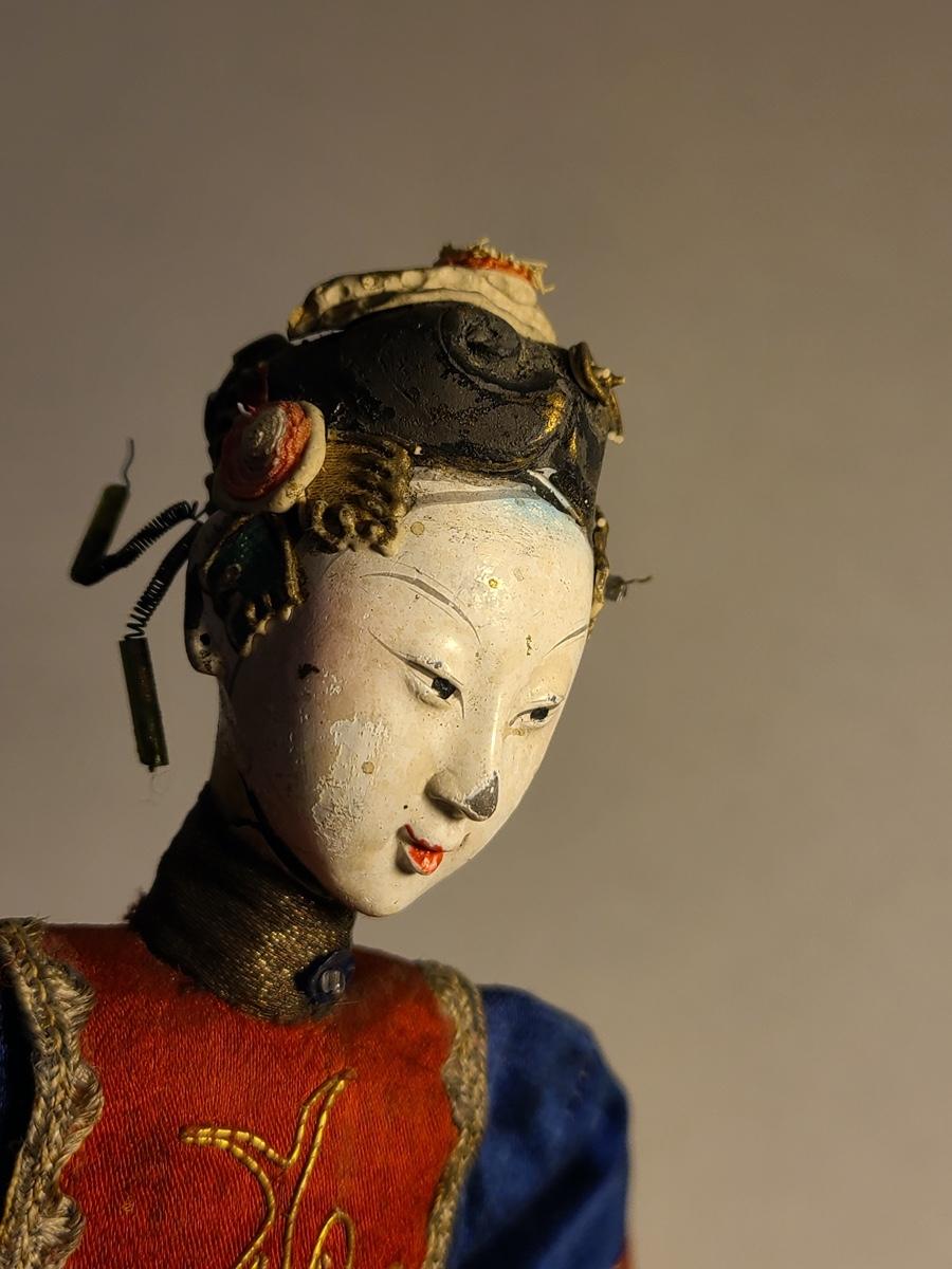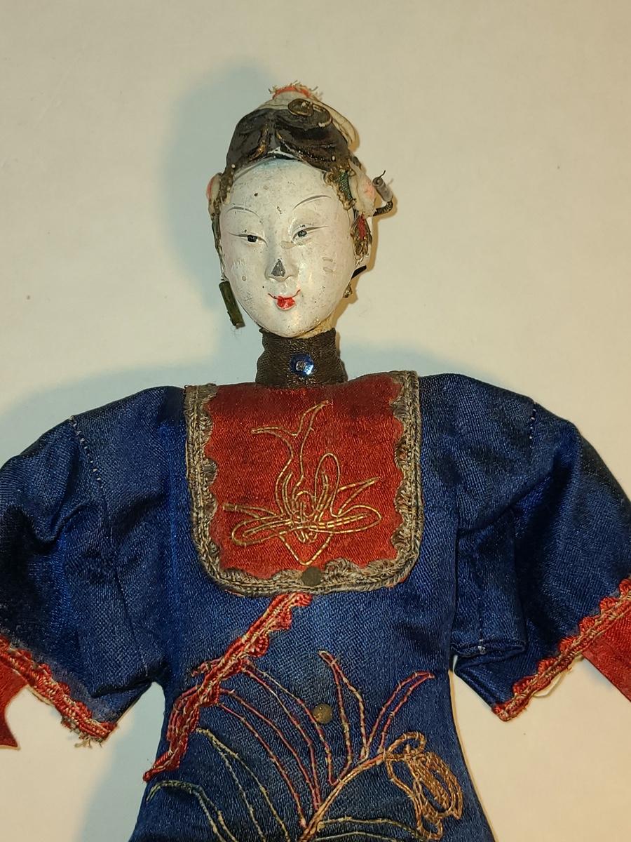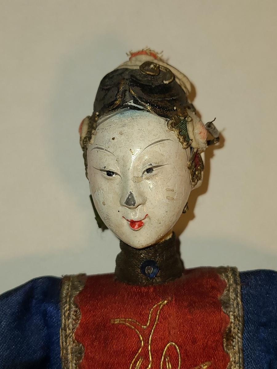 During its height of popularity in the Qing Dynasty, when one went to the opera, souvenir dolls were often purchased. This doll is most likely over 100 years old. Her face is wood and hand painted with beaded detailing through hair. She has elongated fingers that look to be wood with a wood frame, her arms feel unattached in the interior if her robe, but unsure because we did not remove clothes to keep integrity of her silk embroidered robes. Amazing piece to add to a collection! Please see all pictures as they are the best representation of the items. The pictures show condition, measurements if taken, and what is included in the lot. Due to the large amount that we photograph and the time frame, we are not always able to take measurements. All items unless noted, are pre-owned and have been used. If you purchased furniture, you must bring help. We do not allow one person to carry large furniture out on their own. Bring help, tools and a truck for the safety of our client’s homes, and your personal safety. Company policy. Thank you.