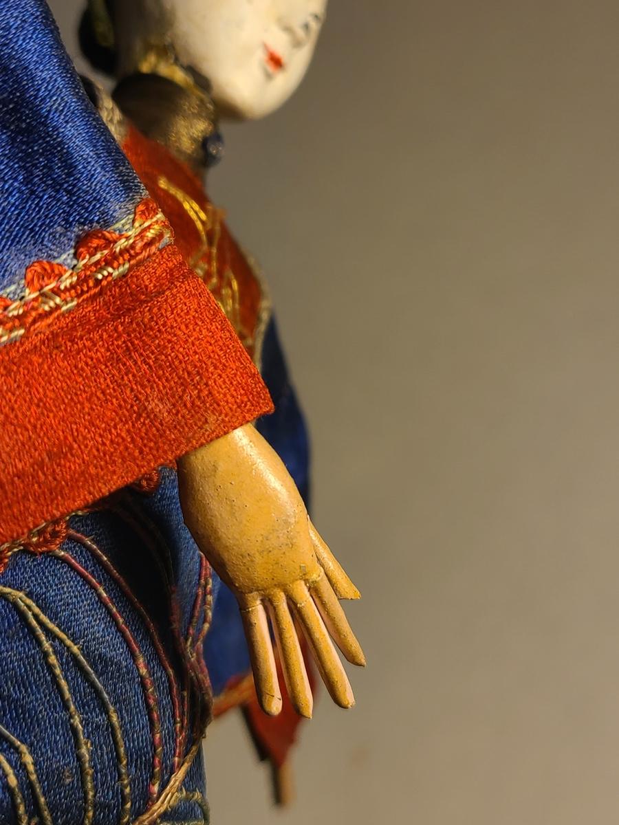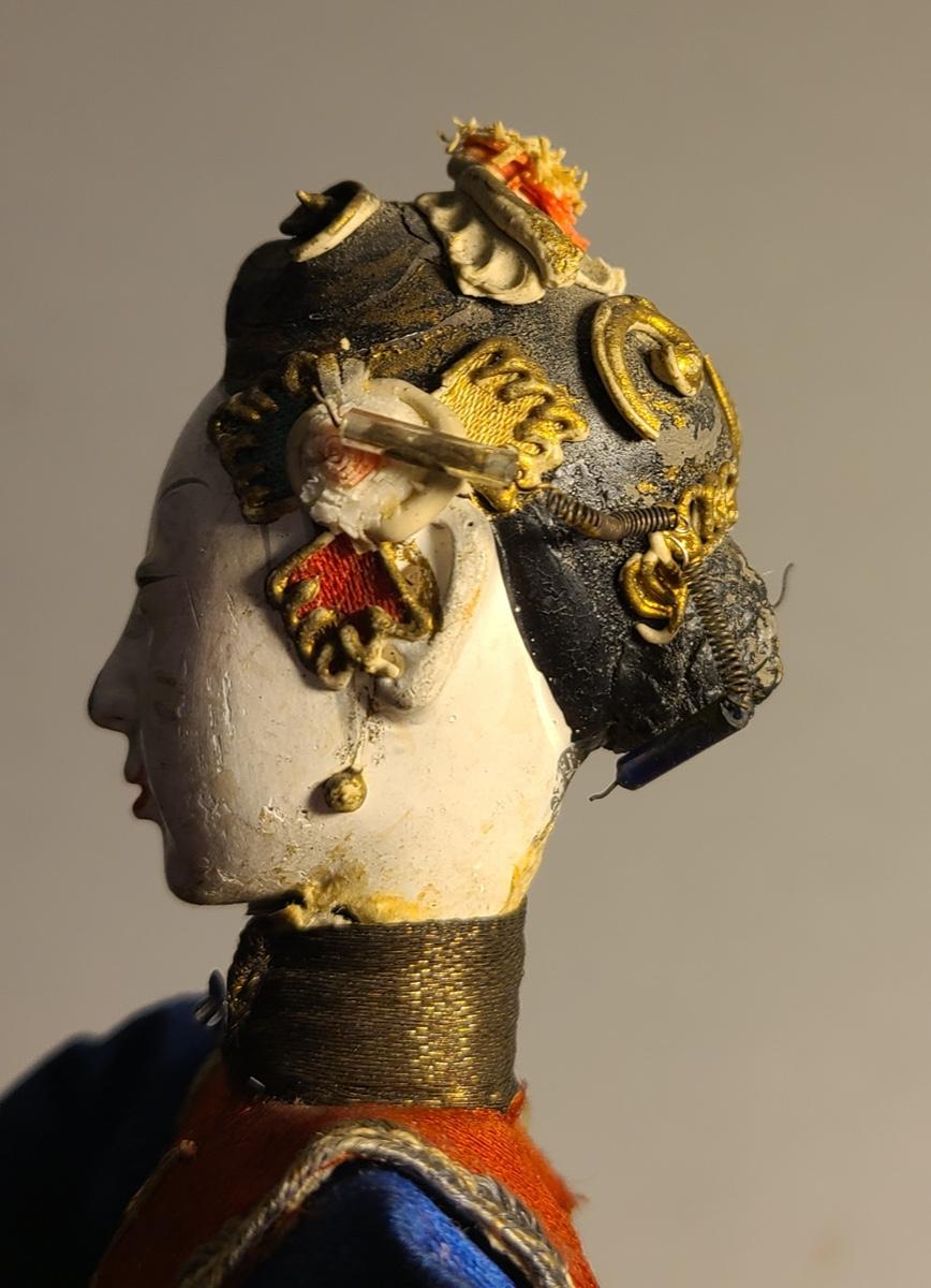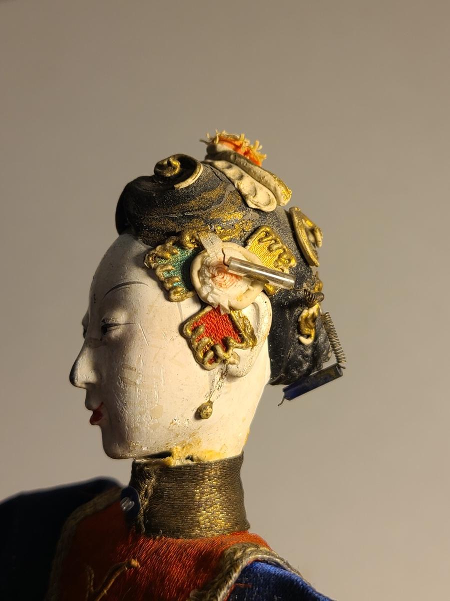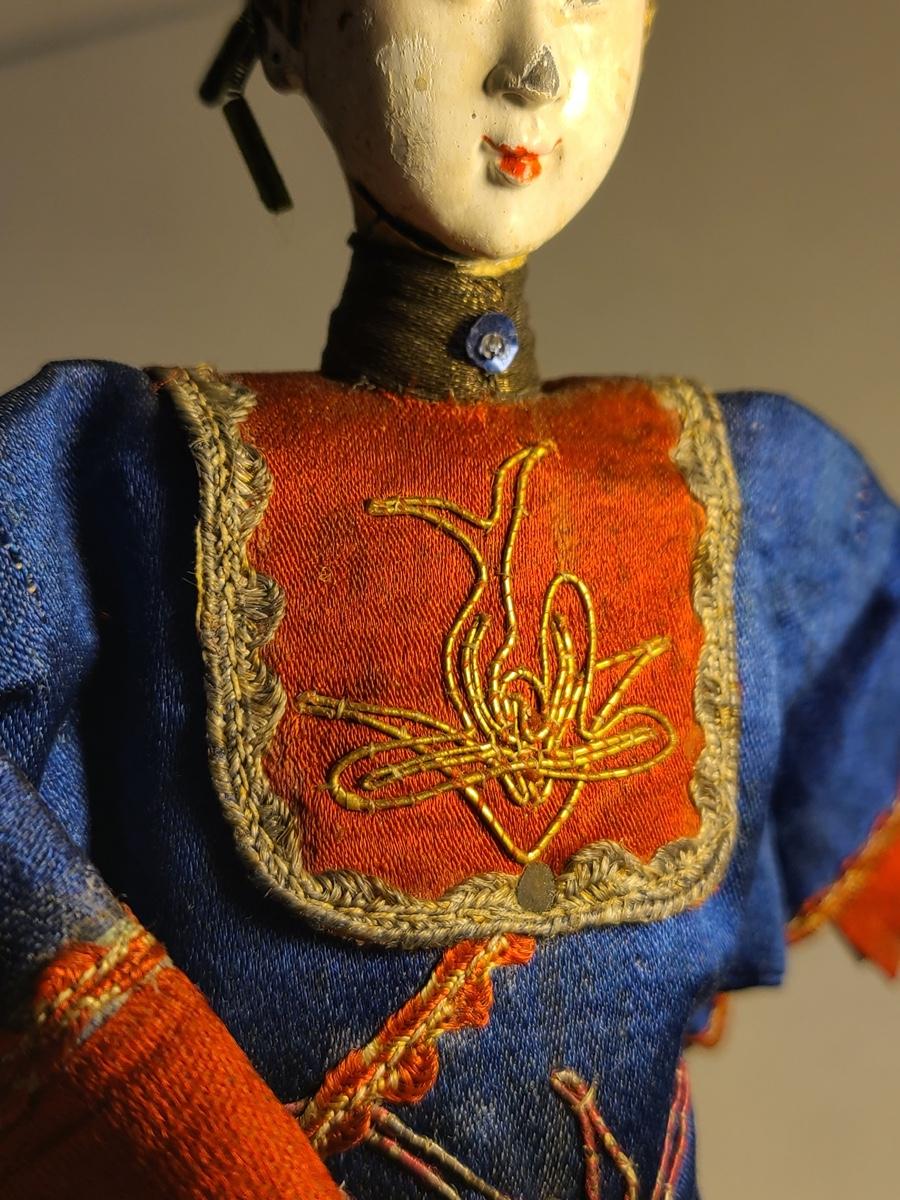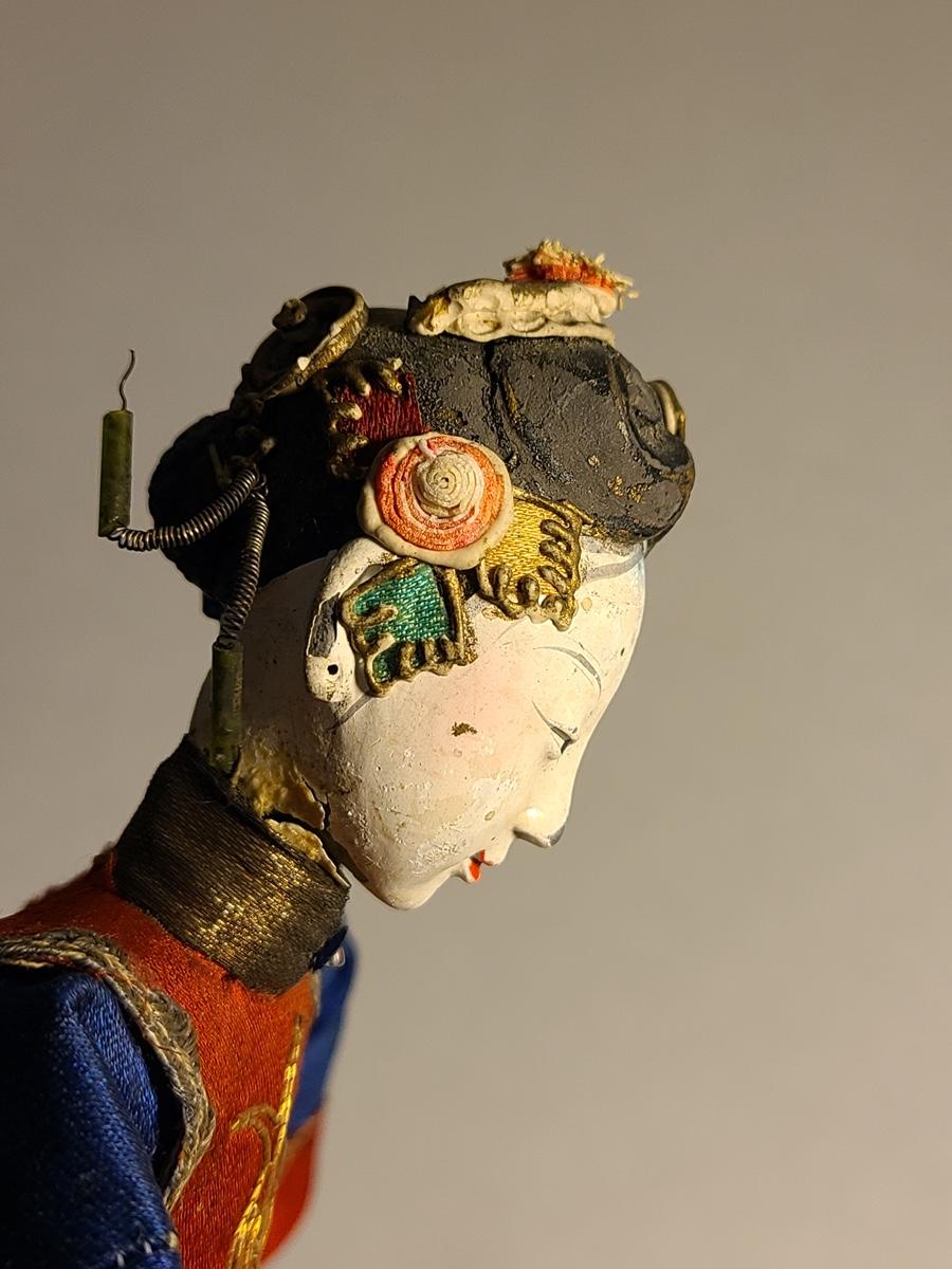During its height of popularity in the Qing Dynasty, when one went to the opera, souvenir dolls were often purchased. This doll is most likely over 100 years old. Her face is wood and hand painted with beaded detailing through hair. She has elongated fingers that look to be wood with a wood frame, her arms feel unattached in the interior if her robe, but unsure because we did not remove clothes to keep integrity of her silk embroidered robes. Amazing piece to add to a collection! Please see all pictures as they are the best representation of the items. The pictures show condition, measurements if taken, and what is included in the lot. Due to the large amount that we photograph and the time frame, we are not always able to take measurements. All items unless noted, are pre-owned and have been used. If you purchased furniture, you must bring help. We do not allow one person to carry large furniture out on their own. Bring help, tools and a truck for the safety of our client’s homes, and your personal safety. Company policy. Thank you.