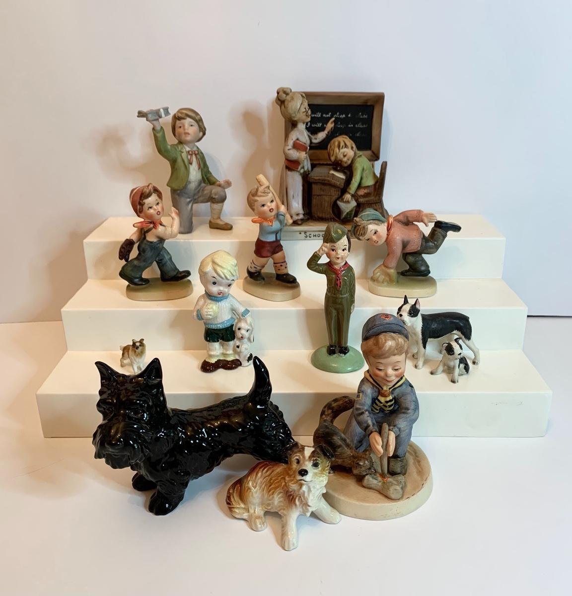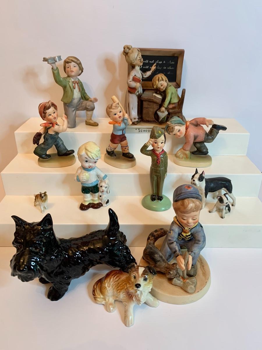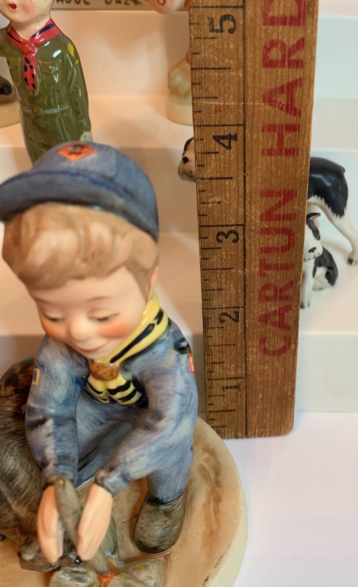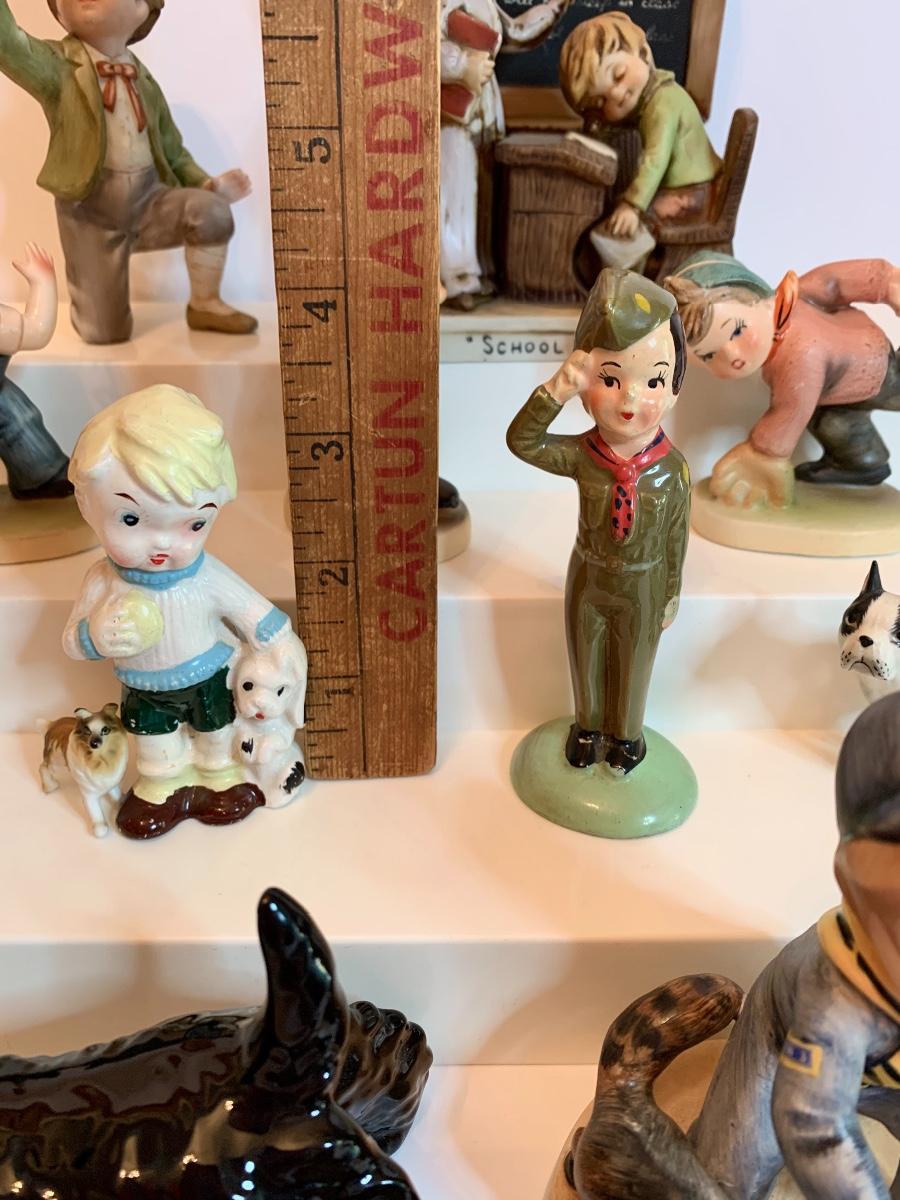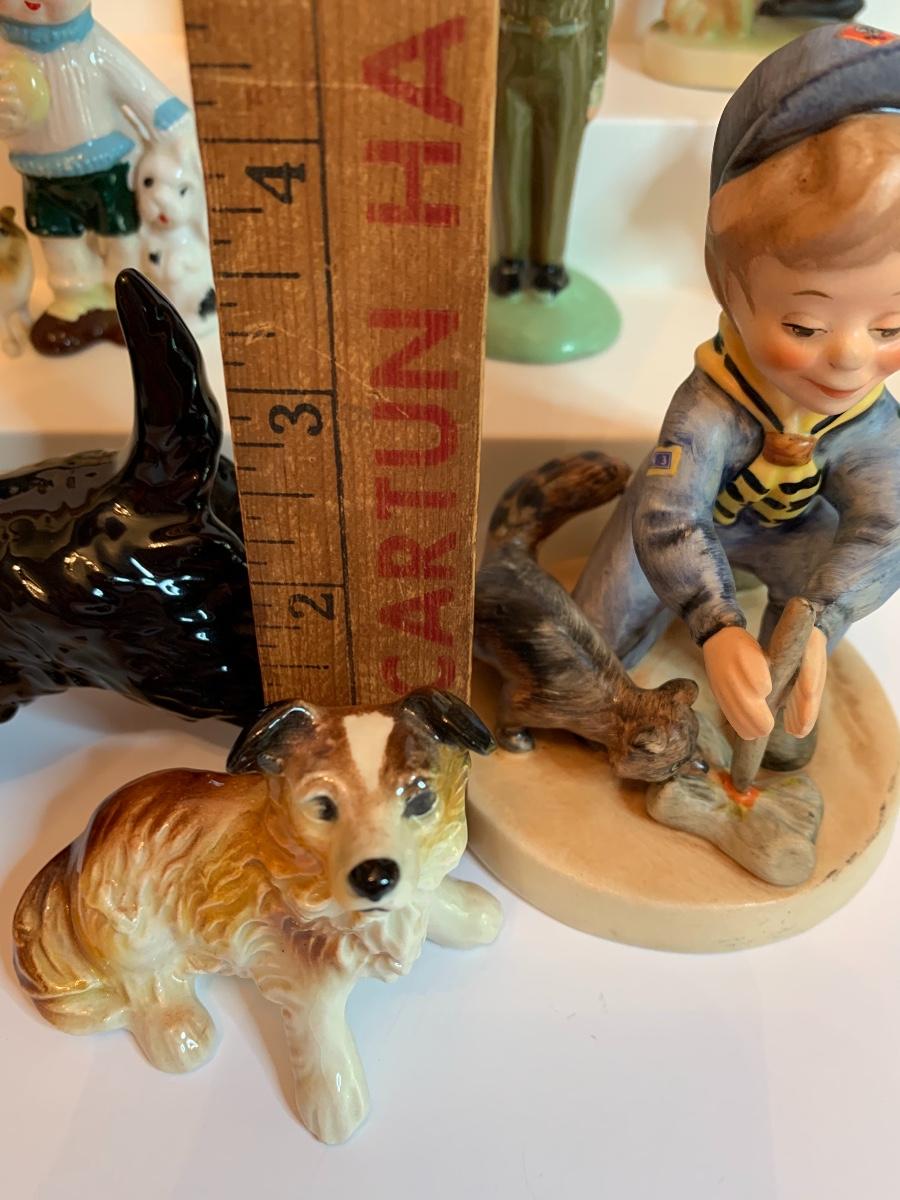 Beautiful Goebel boy scout trying to start a fire with his little four legged friend. Also included is a Goebel Scottie Dog, Boxer Miniatures, Royal Crown Child Life Figure and Enesco Figures.