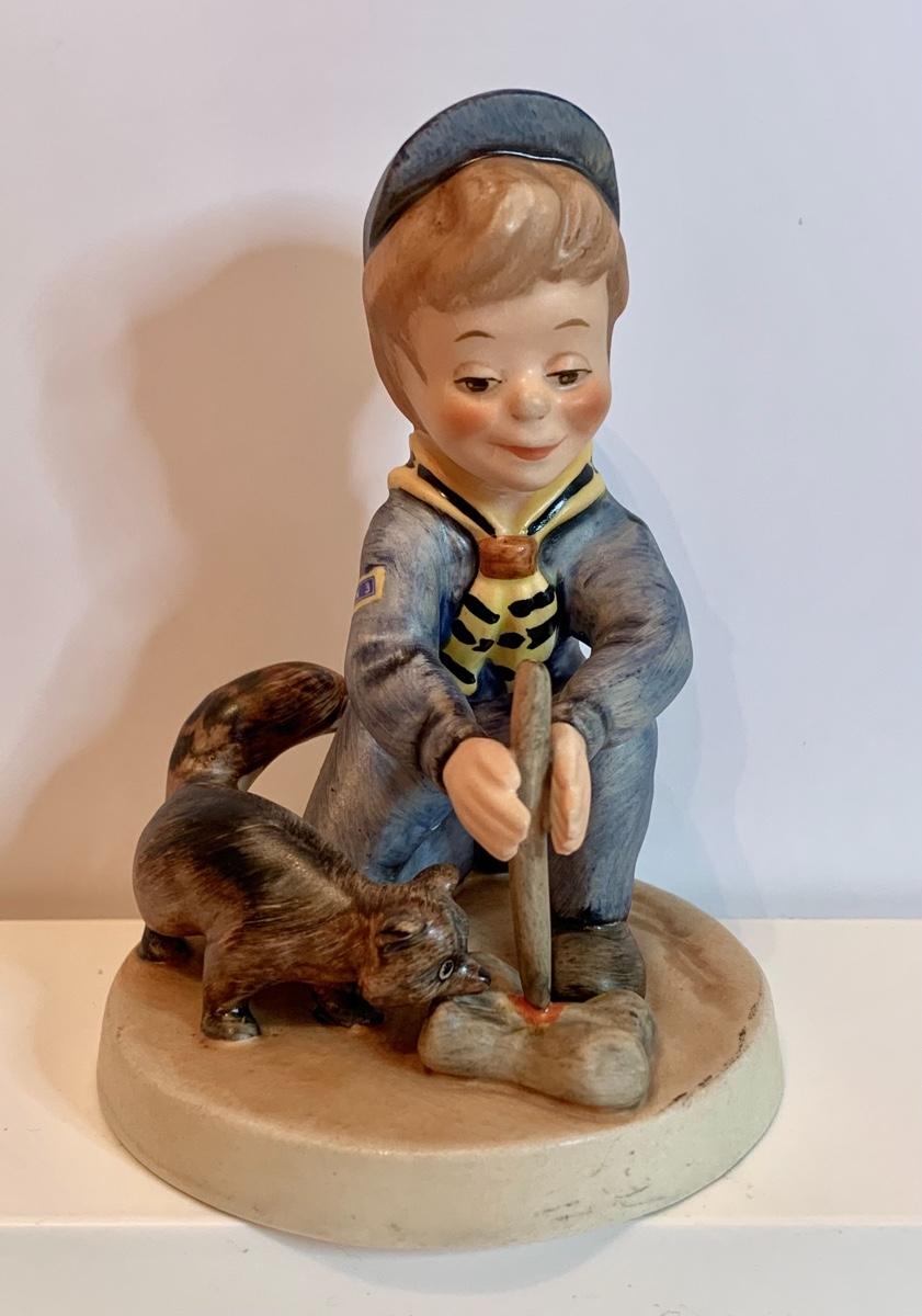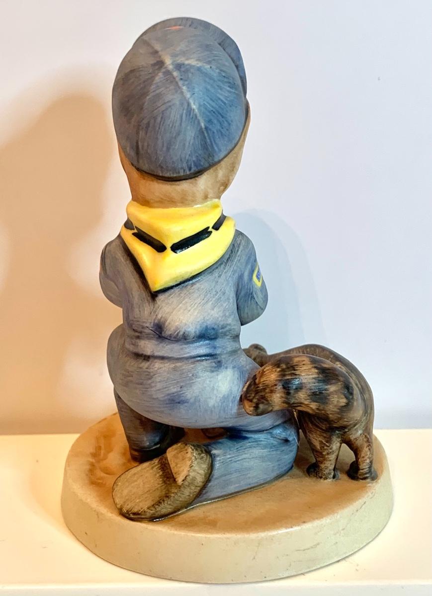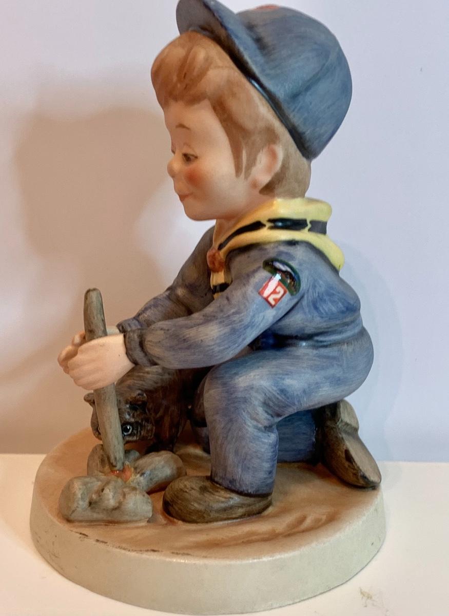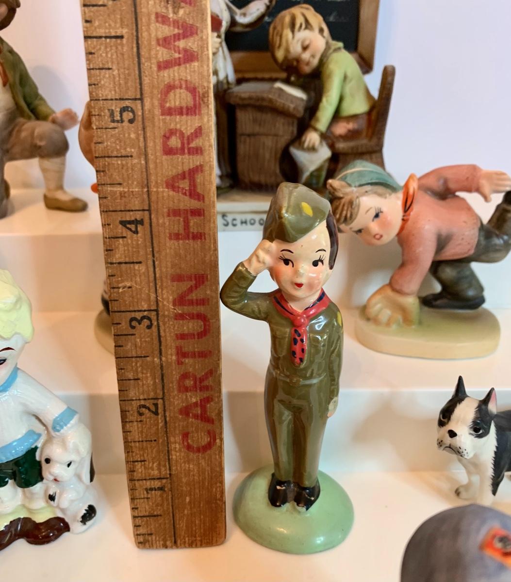 Beautiful Goebel boy scout trying to start a fire with his little four legged friend. Also included is a Goebel Scottie Dog, Boxer Miniatures, Royal Crown Child Life Figure and Enesco Figures.