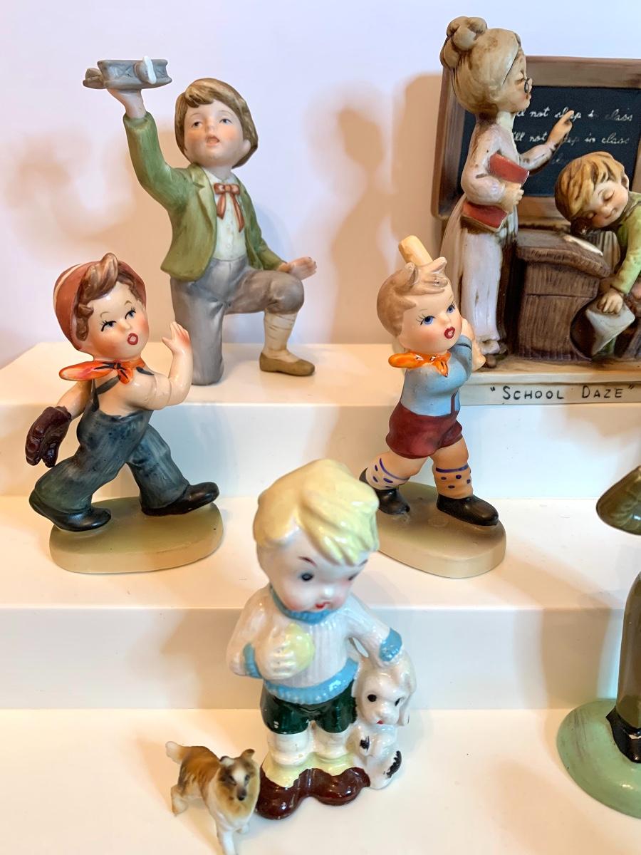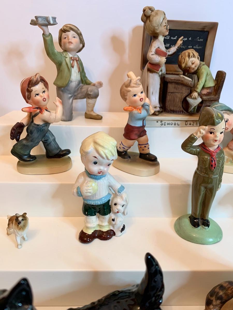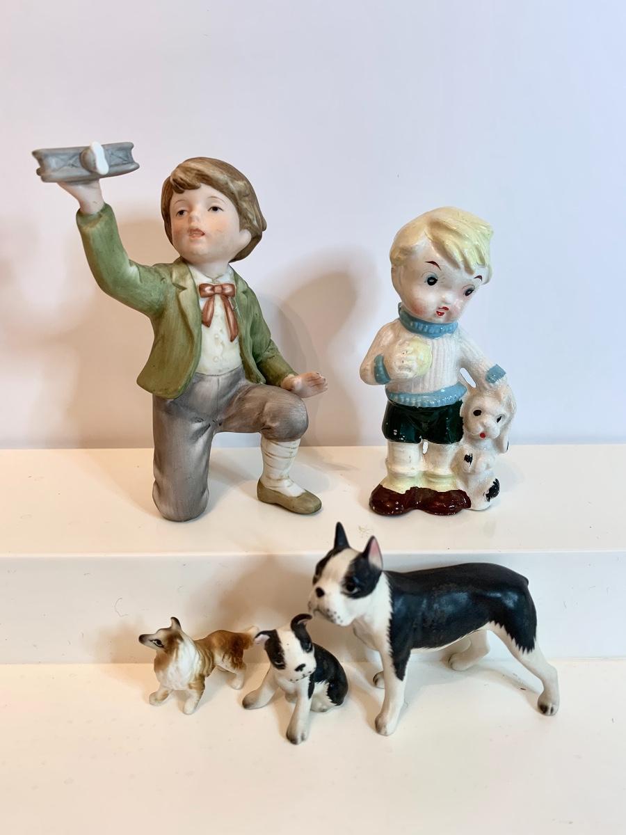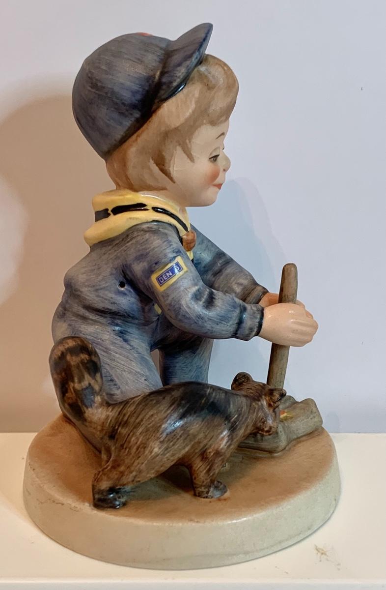 Beautiful Goebel boy scout trying to start a fire with his little four legged friend. Also included is a Goebel Scottie Dog, Boxer Miniatures, Royal Crown Child Life Figure and Enesco Figures.