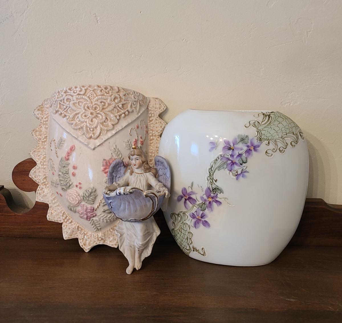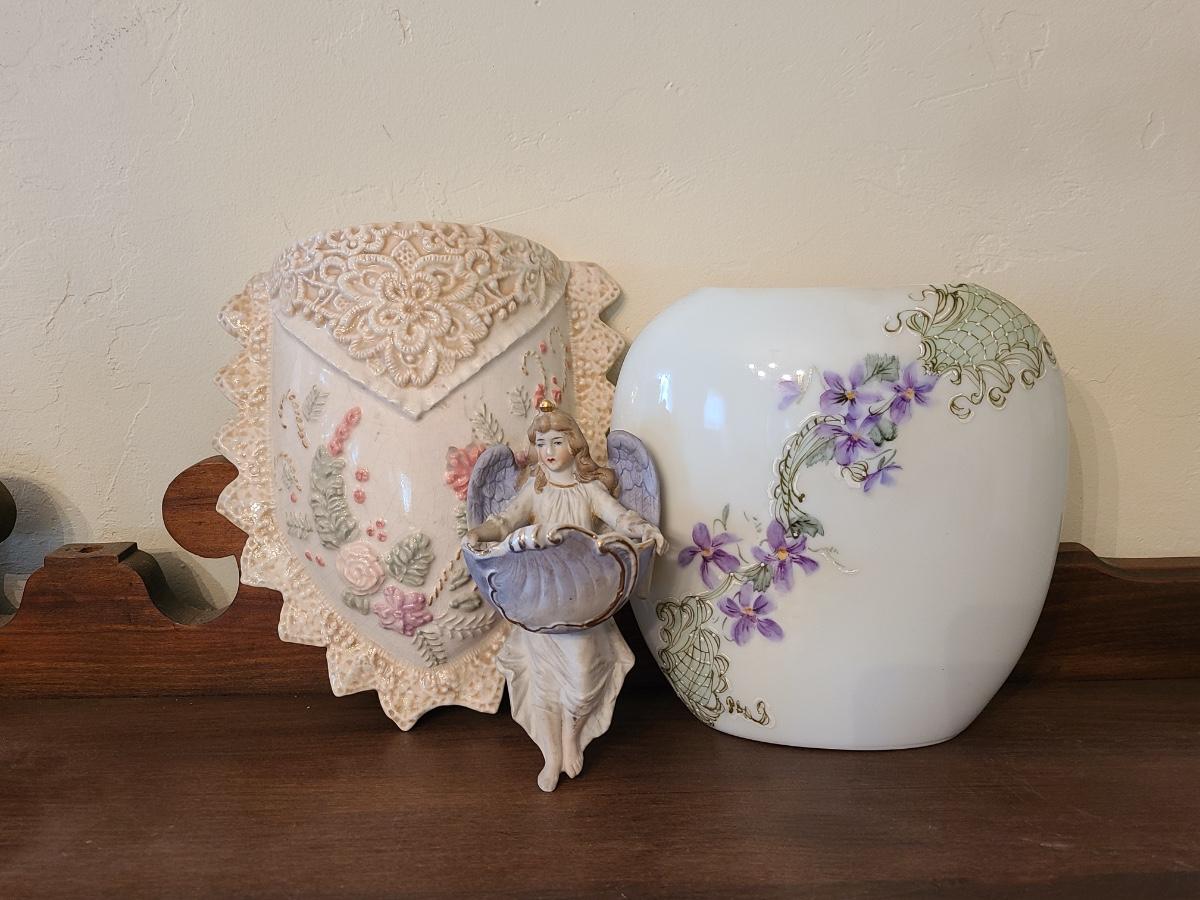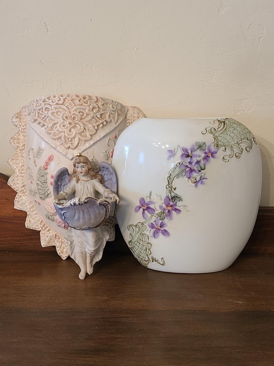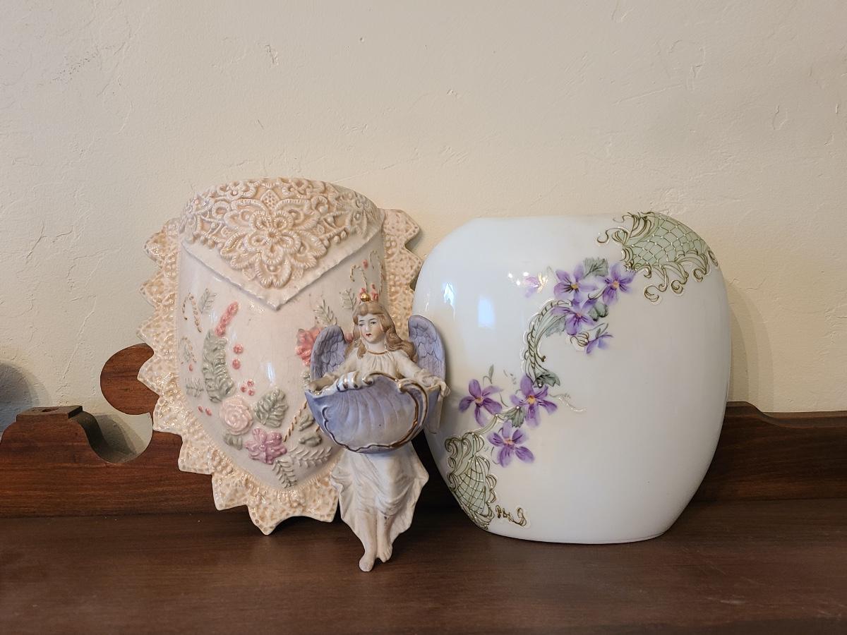 Lot 138: Pottery Floral Wall Pocket, Hand Painted Vase, and Antique Angel Wall Pocket