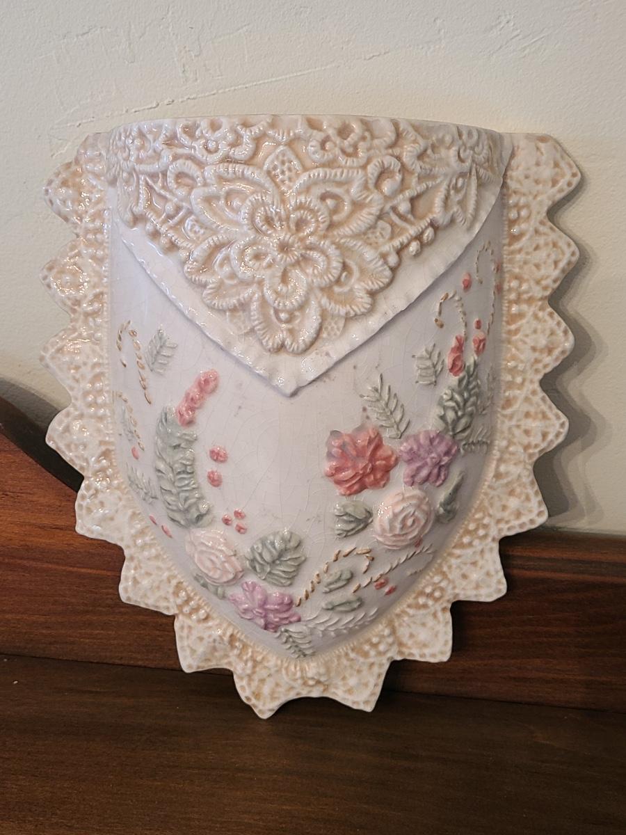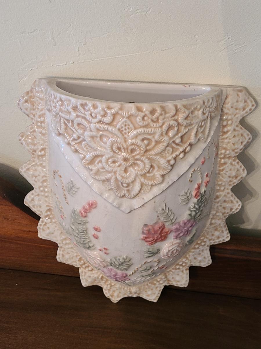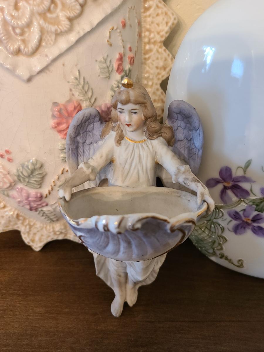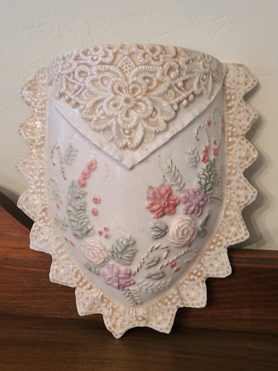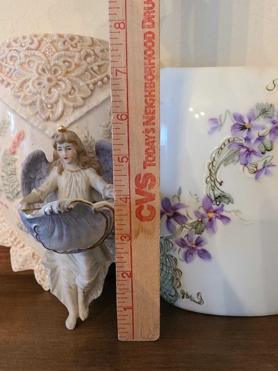 Lot 138: Pottery Floral Wall Pocket, Hand Painted Vase, and Antique Angel Wall Pocket