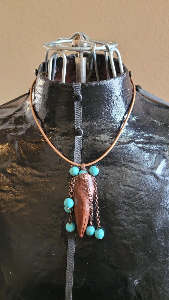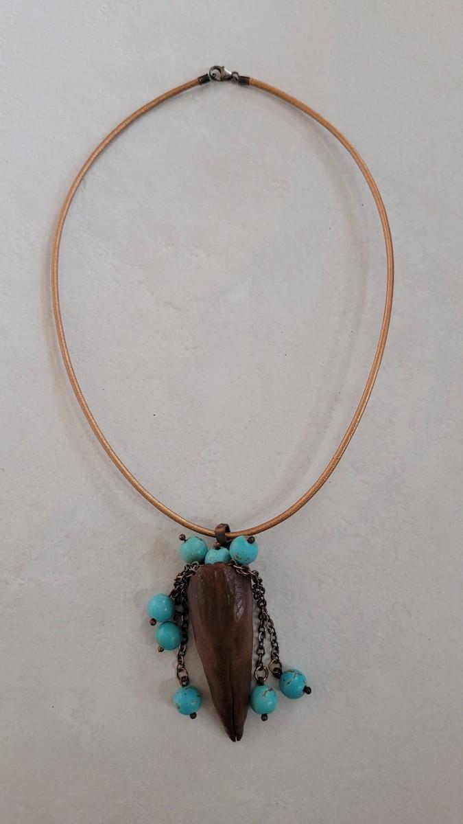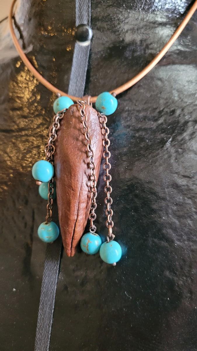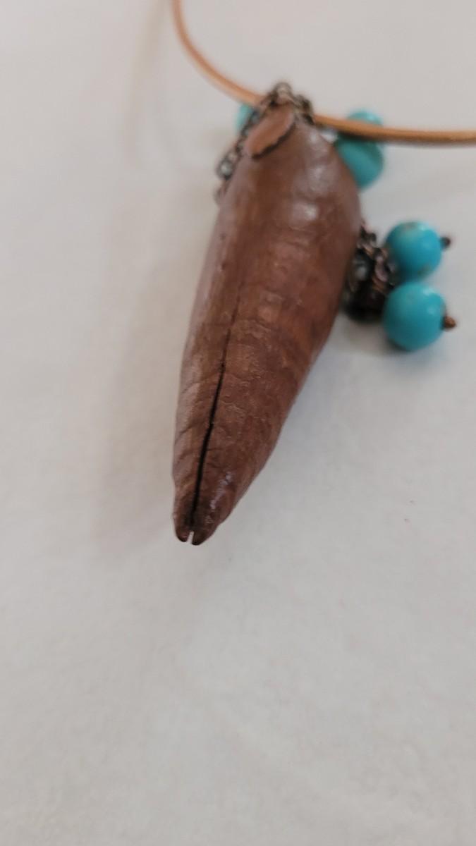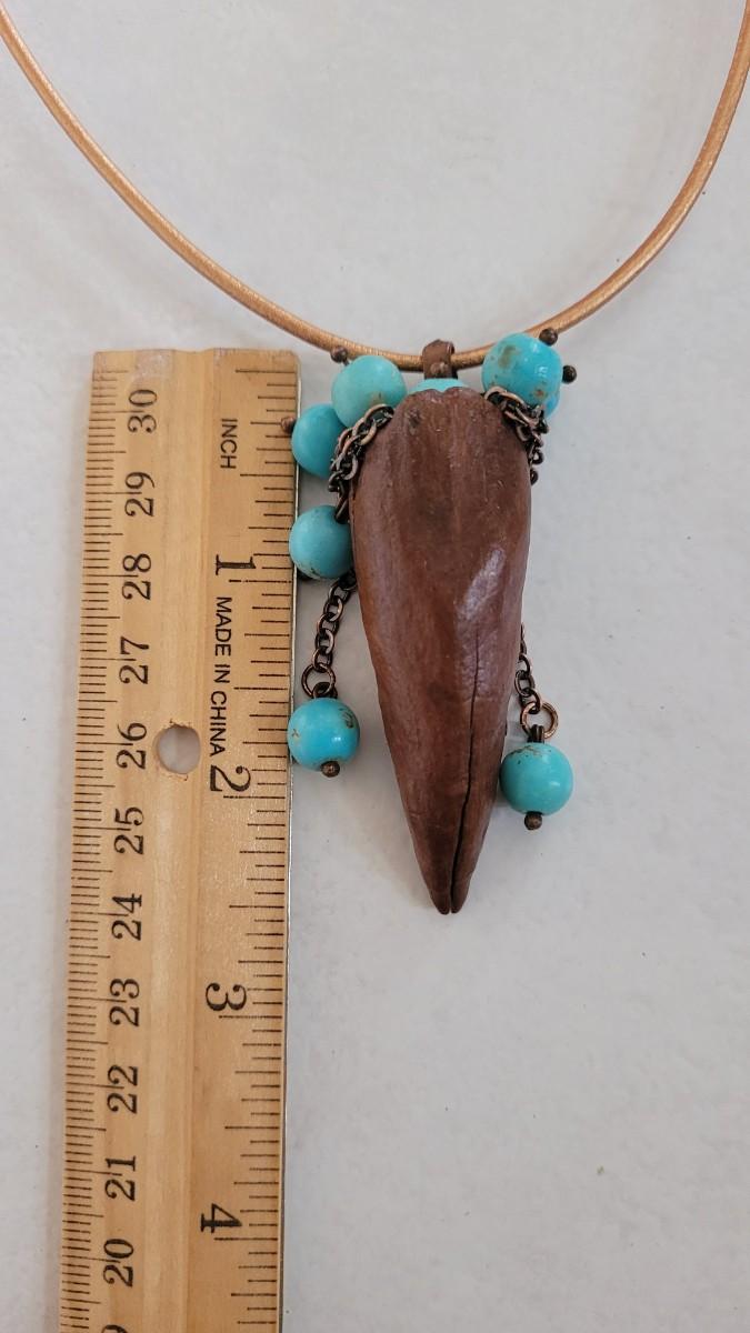 Real Seed pod with Turquoise beads overflowing from the pod. The necklace is leather cord with a clasp. Unique and beautiful.