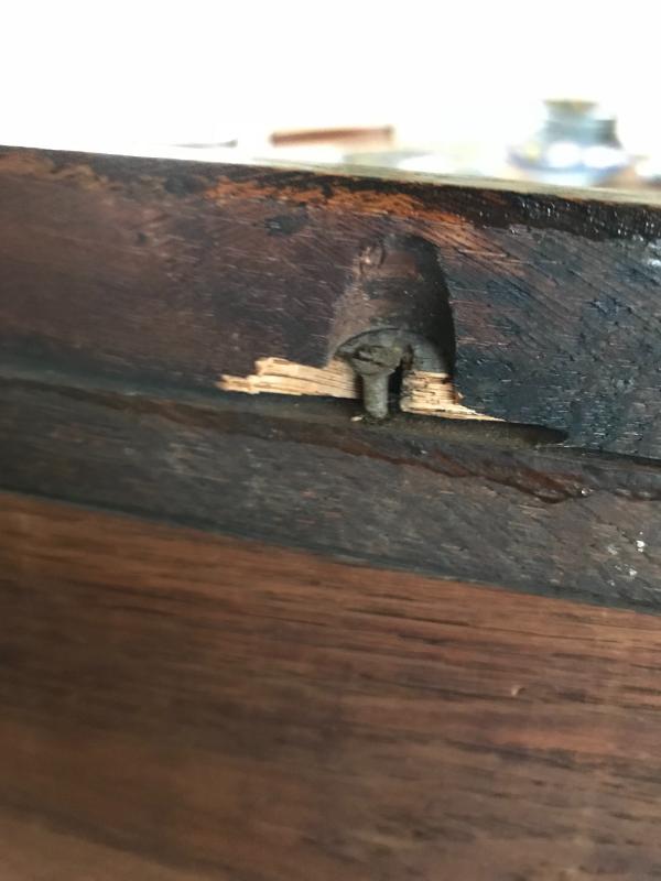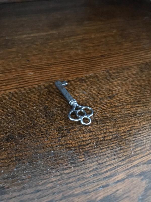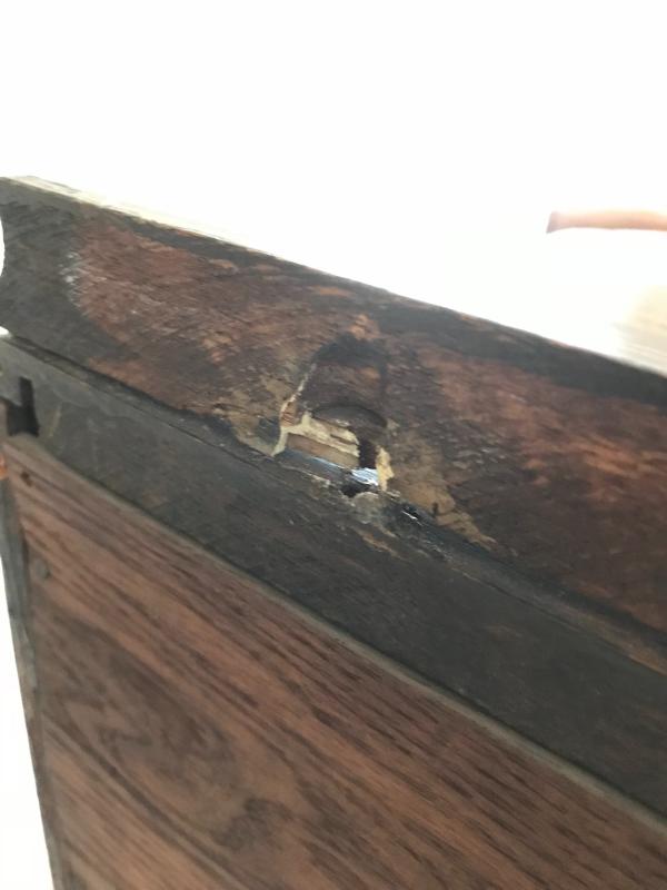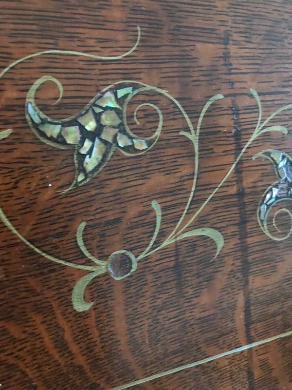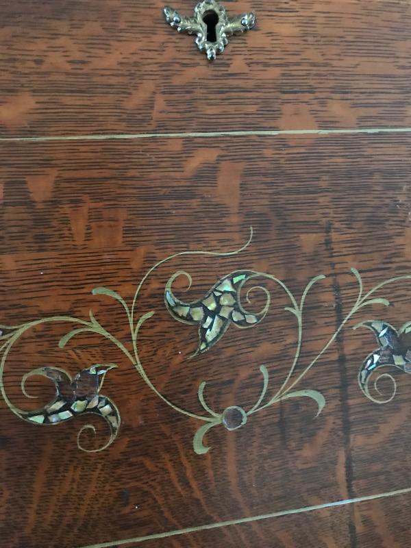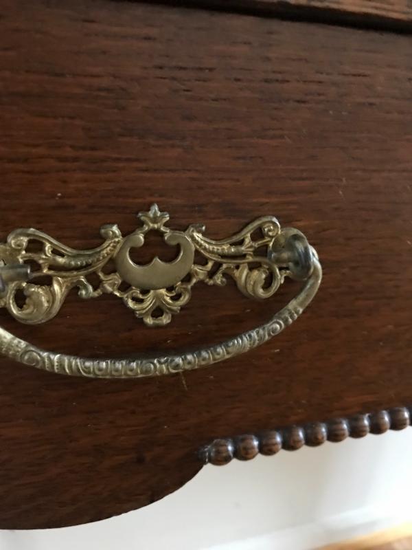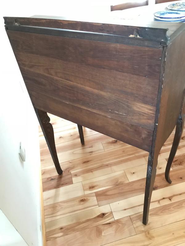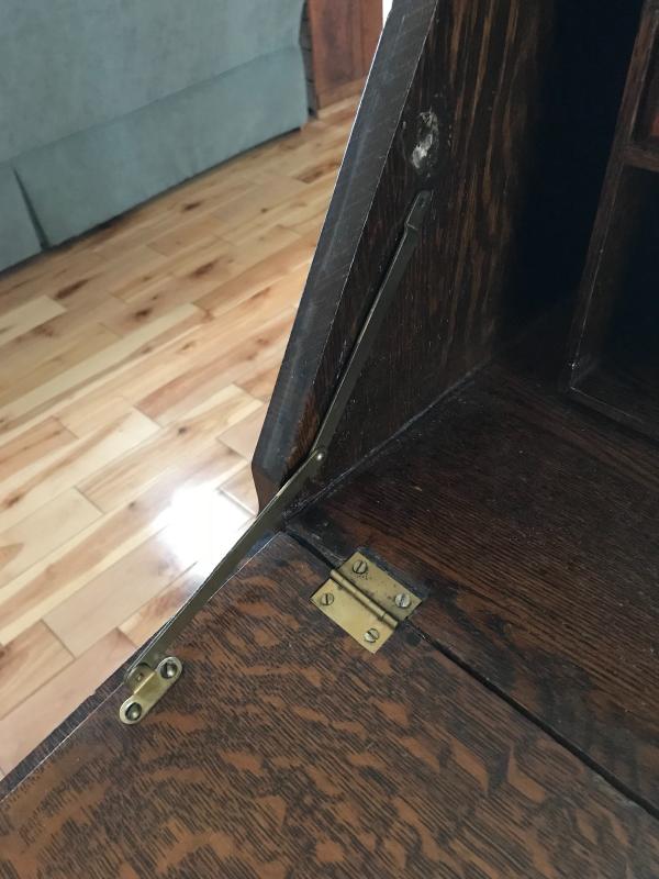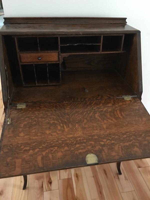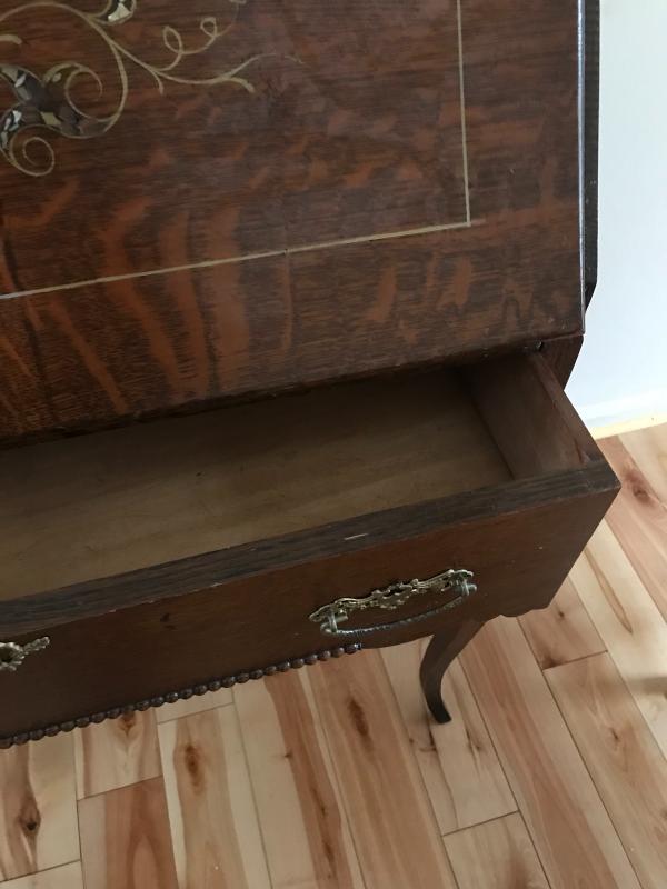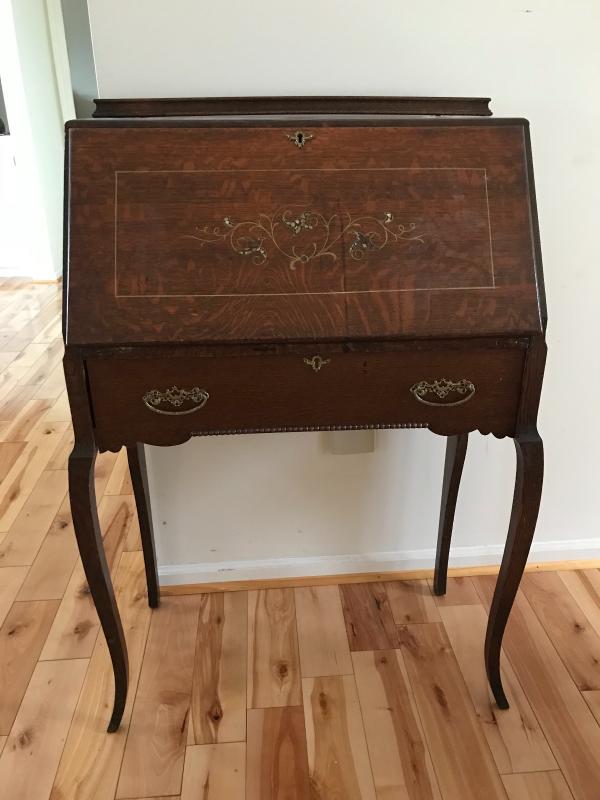 This beautiful antique drop desk is the perfect piece for a small space. Locks (and includes key), and is in good condition. Top trim piece is loose and needs reinforcing, missing hardware on brass “arm” that keeps the drop-down front from overextending. See pics. 29” l x 14”w x 42”h.