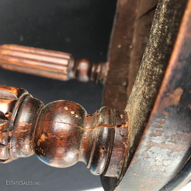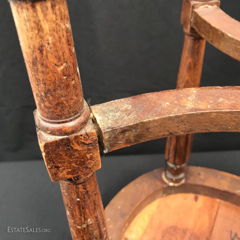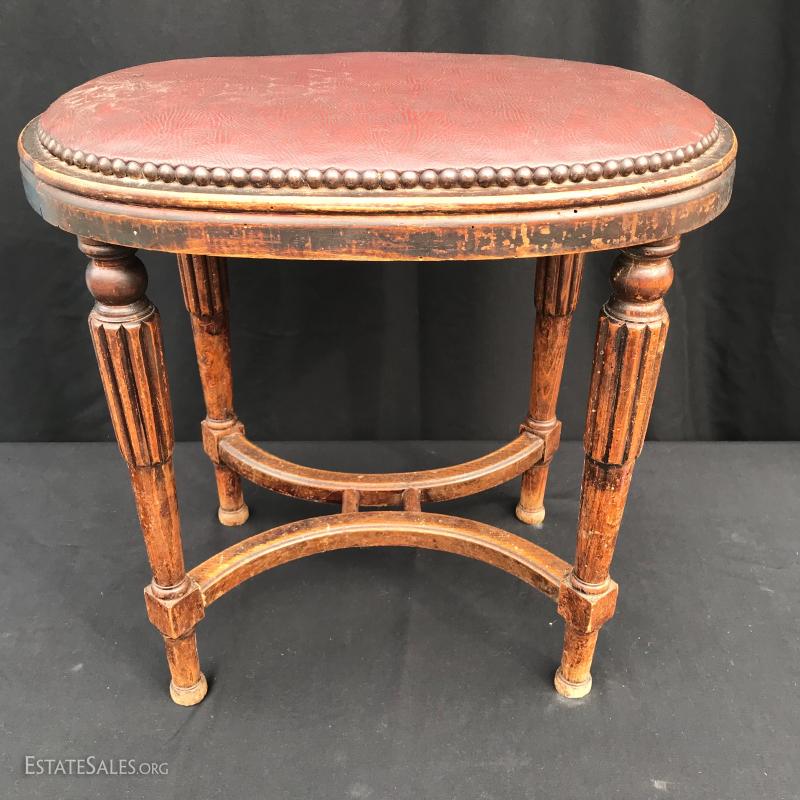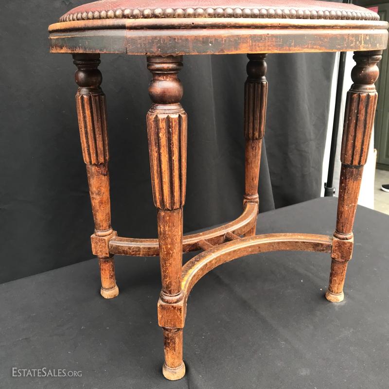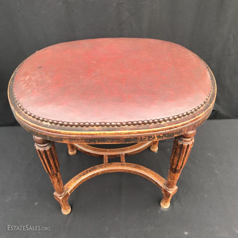 Burgundy leather and wood stool. Has some small cracks but appropriate to era. Item measures 20” x 14” x 19”. This lot is available for local pick up in Asheville, NC only.