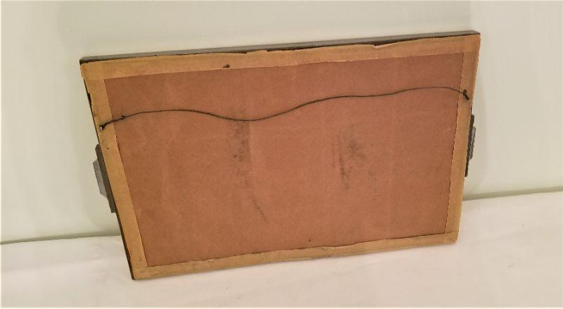Love this 1930's era serving tray (has been turned into a wall hanging, but you could remove the wire) that featured a man in a gondola serenading SOMEONE behind those windows. Great muted colors. Wooden frame. Measures 18.75" wide handle to handle, 11.6" tall. Good vintage condition.