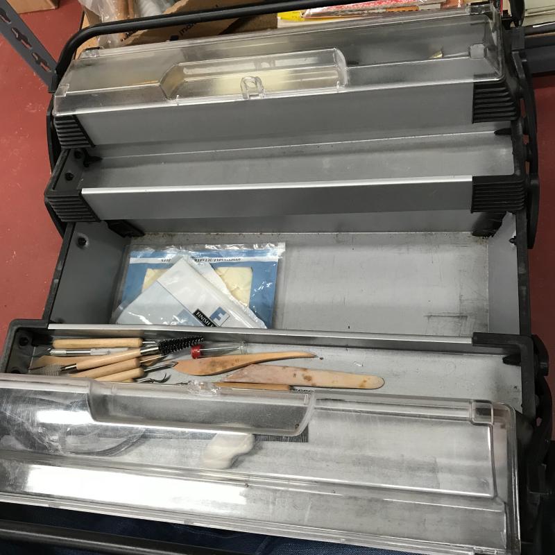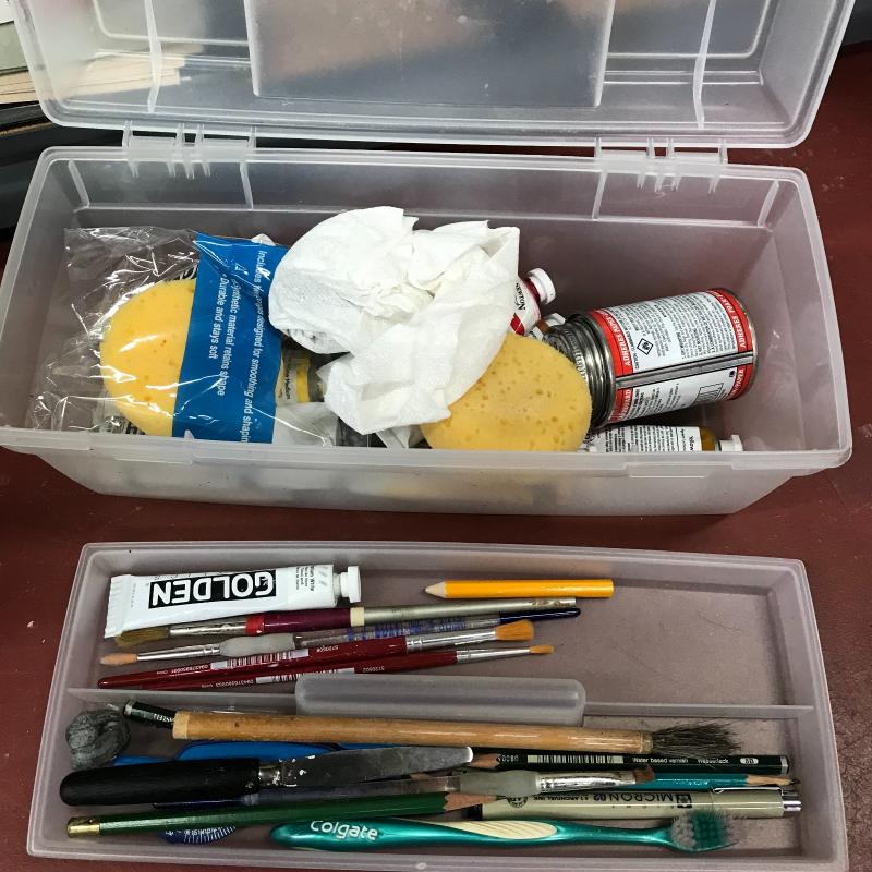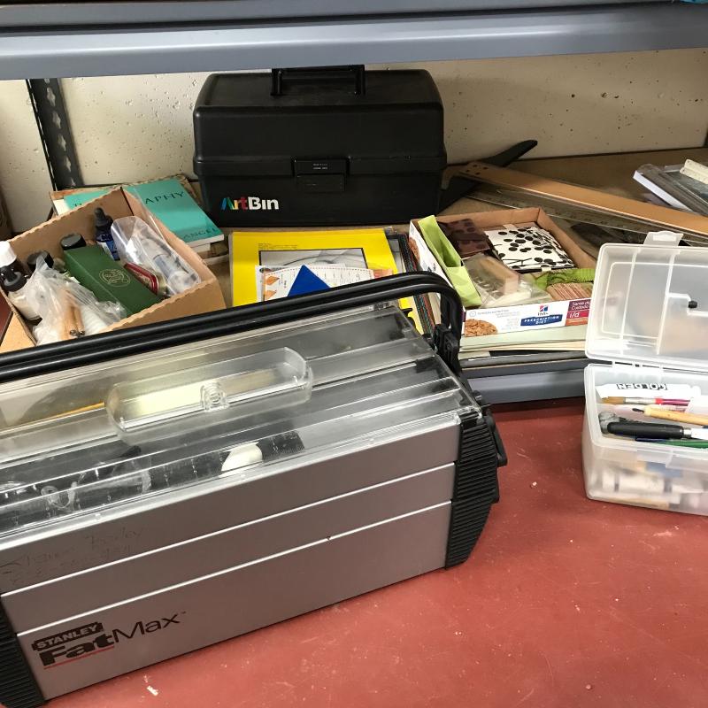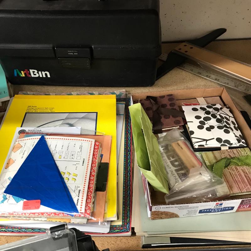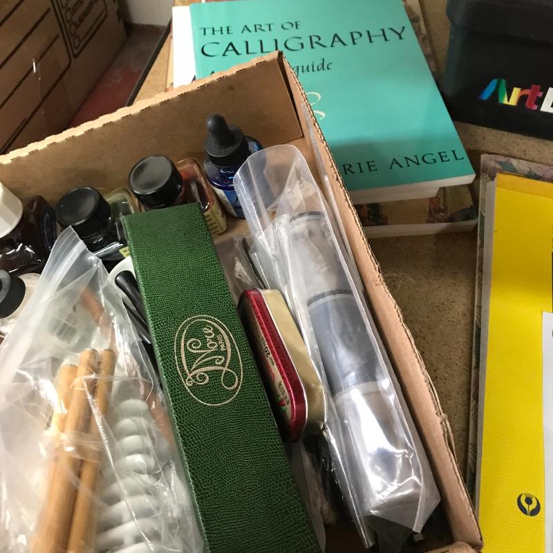 3 plastic art bins (2 have contents), calligraphy books and pens, origami paper and instruction, stencils, rulers and more. Inks and paints may or may not be in good working condition. Can not verify. Lot is available for local pick up in Asheville, NC only.