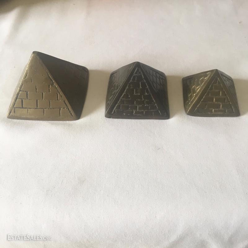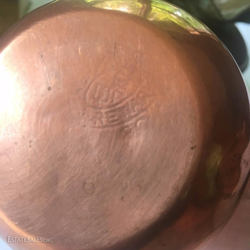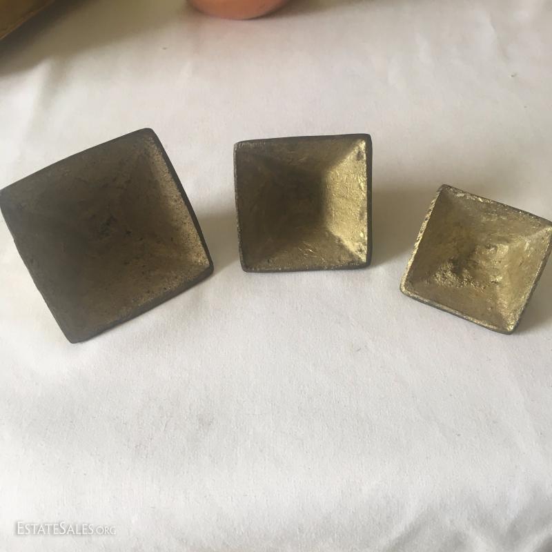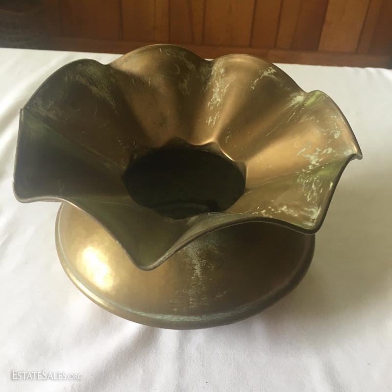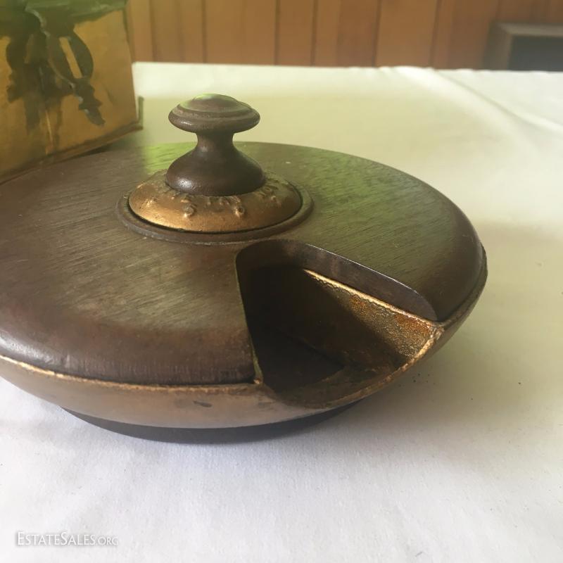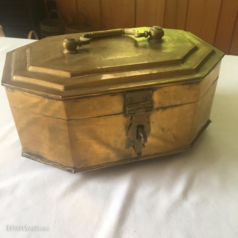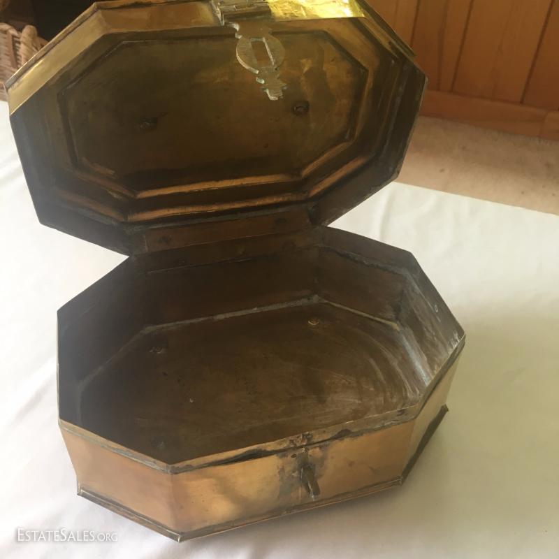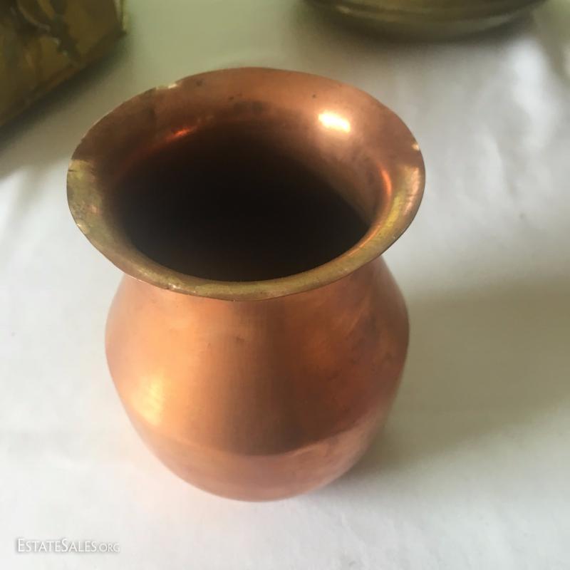 Assorted brass and copper pieces. Brass Bowl, brass Box (10"l x 7"w x 4.5"h), copper case and more. Also includes a cool vintage round wood and heavy brass box with 10 compartments. 7" diameter