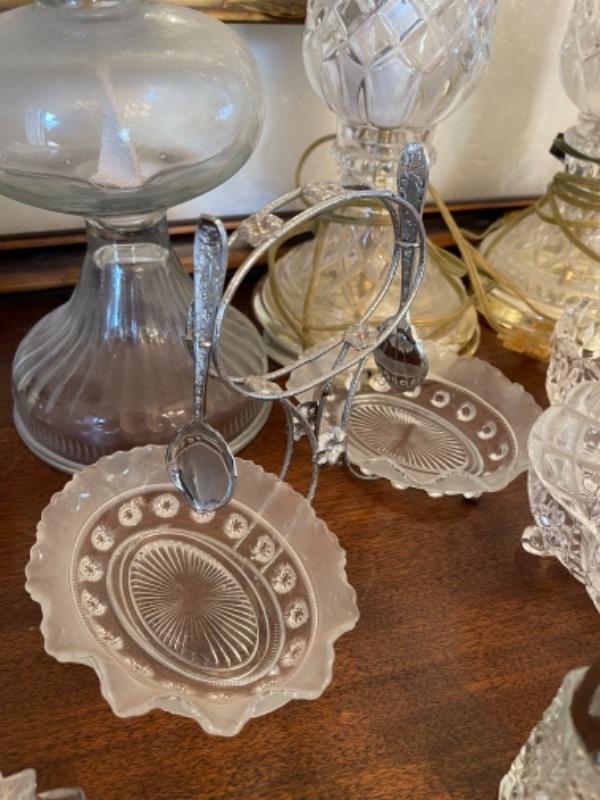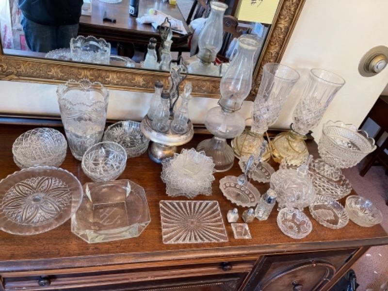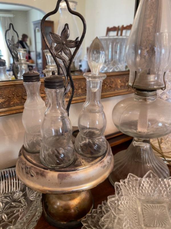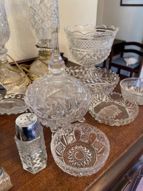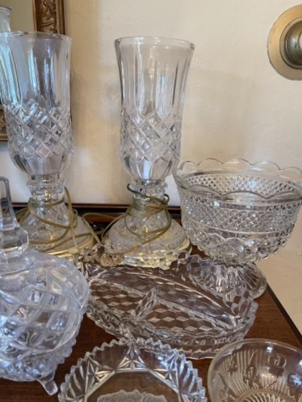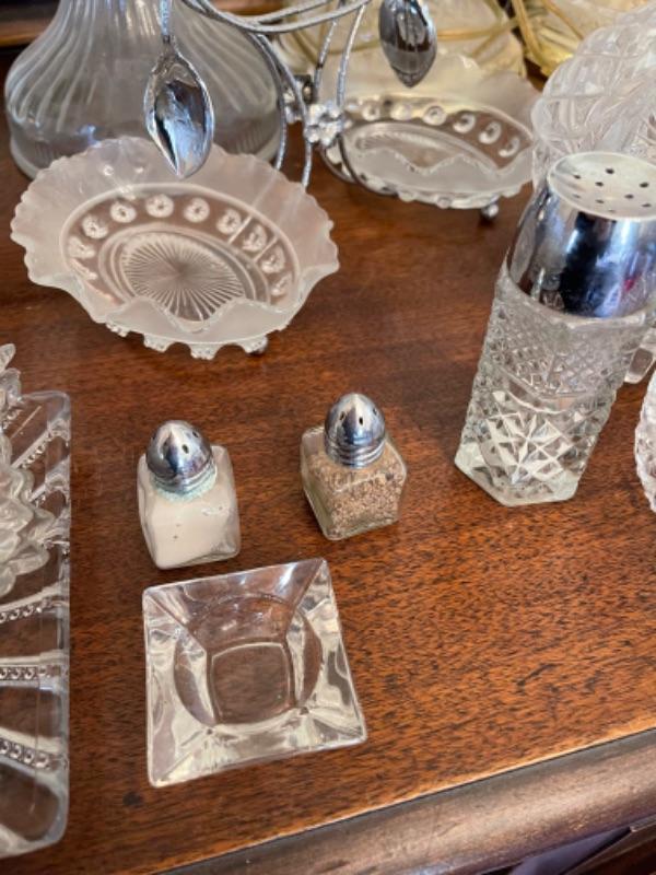 Lot 13. Assorted glassware, salt and pepper shakers, hurricane lamp, cut glass vase, cake plates, candy dish, condiment server, compote, cruet server (as is)--$25