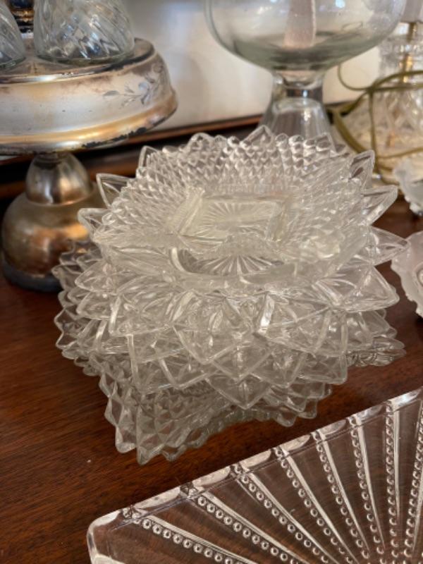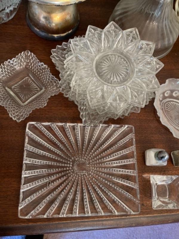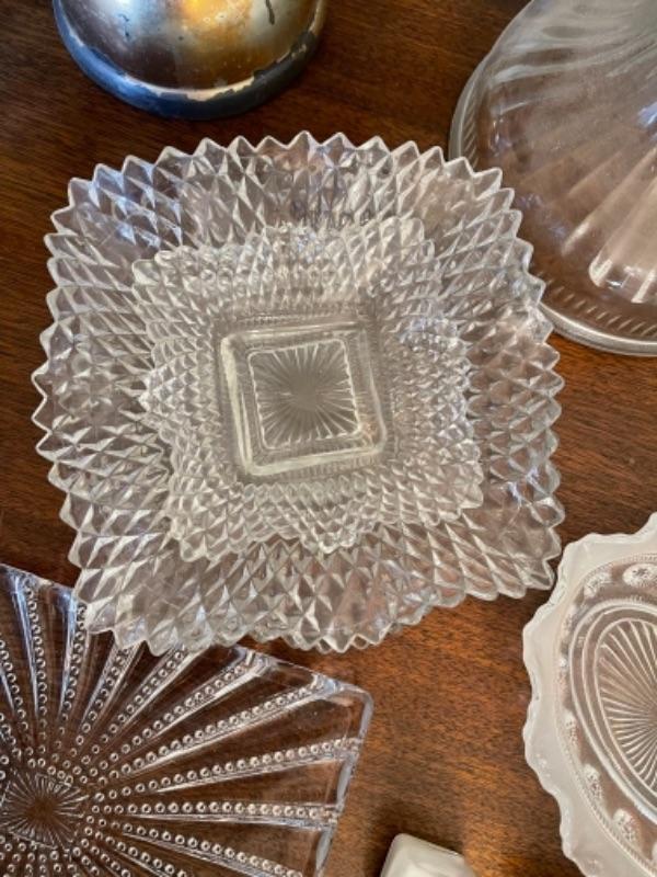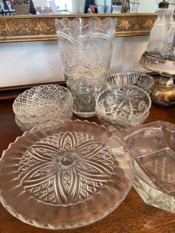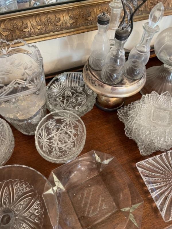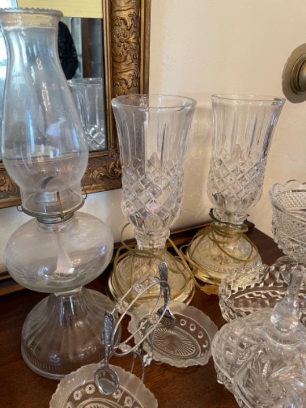 Lot 13. Assorted glassware, salt and pepper shakers, hurricane lamp, cut glass vase, cake plates, candy dish, condiment server, compote, cruet server (as is)--Was $45 - - Now $25