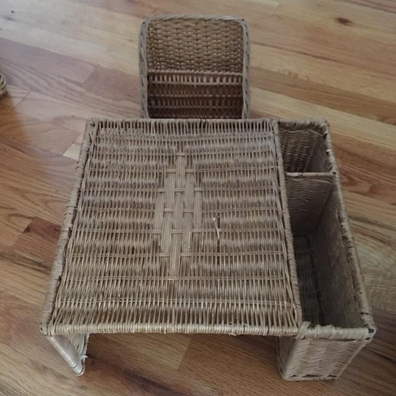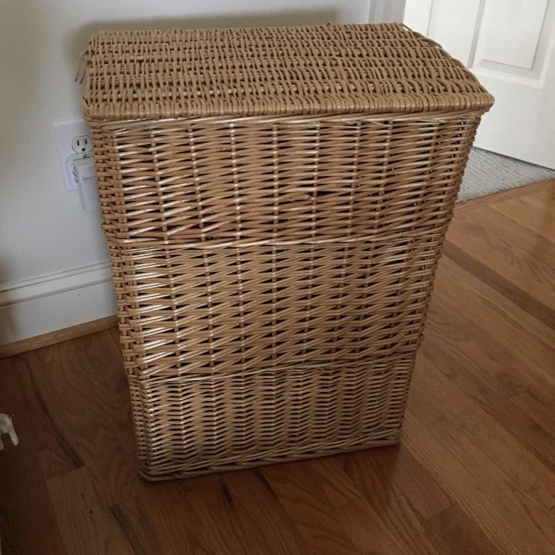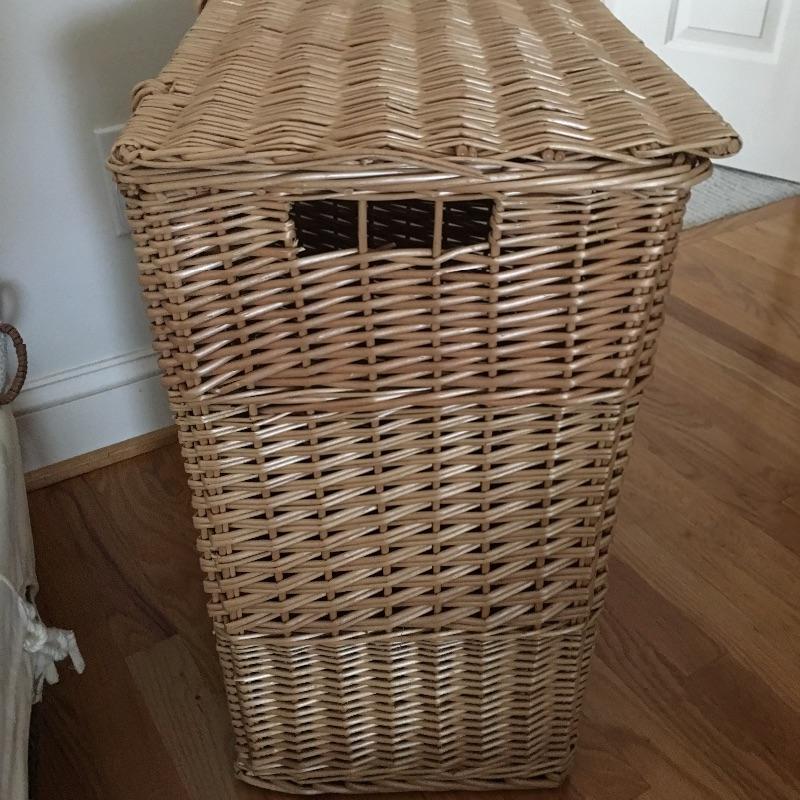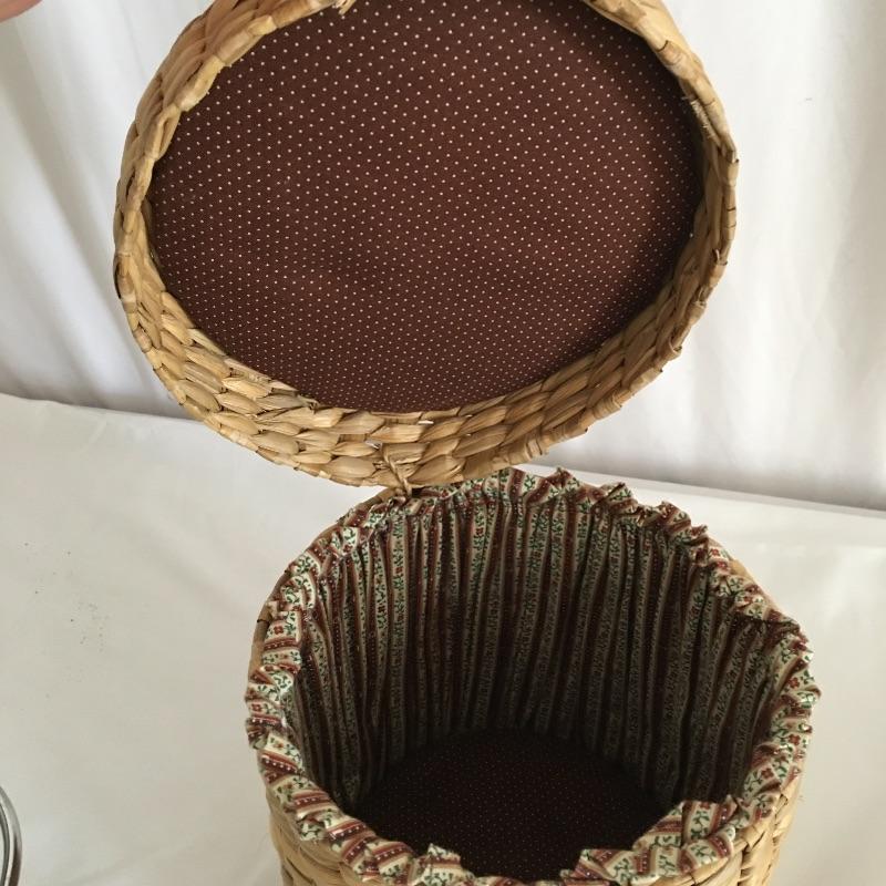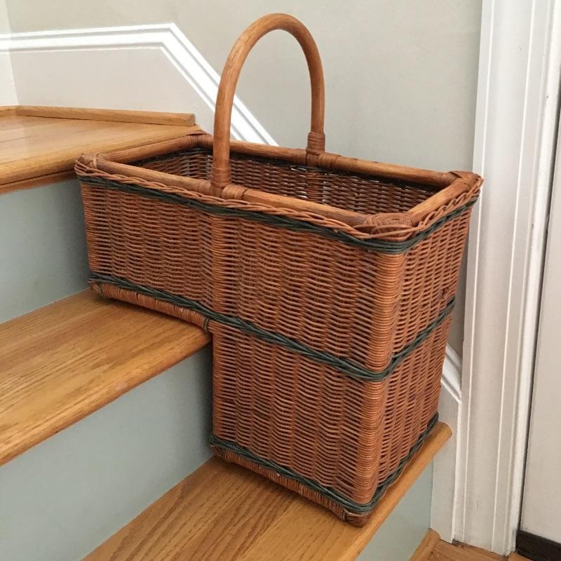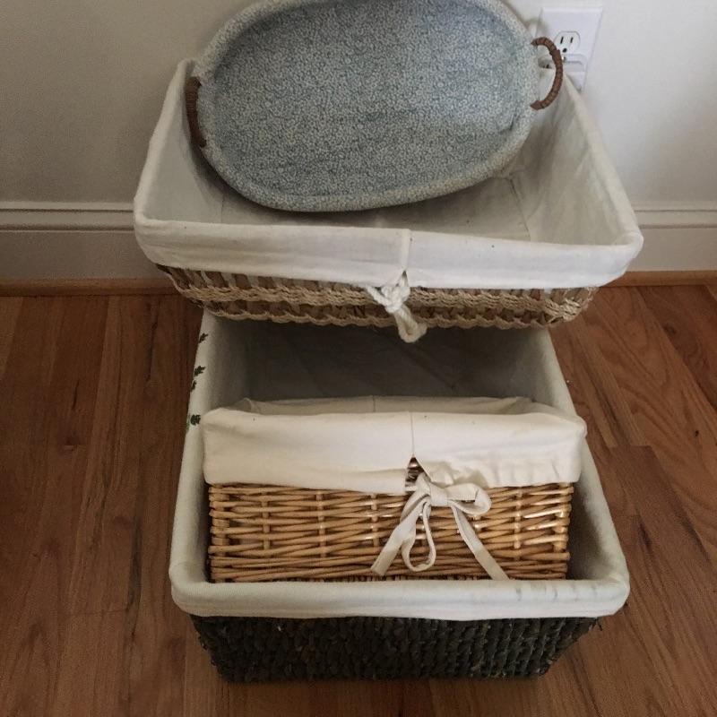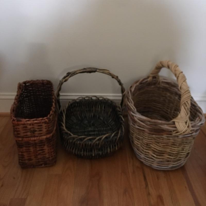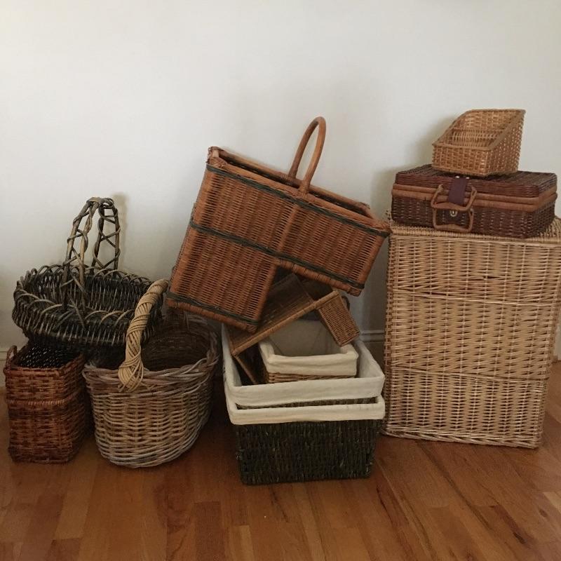 Baskets galore includes hamper, stair basket, four lined baskets, pair of baskets with handles and a few more assorted baskets.