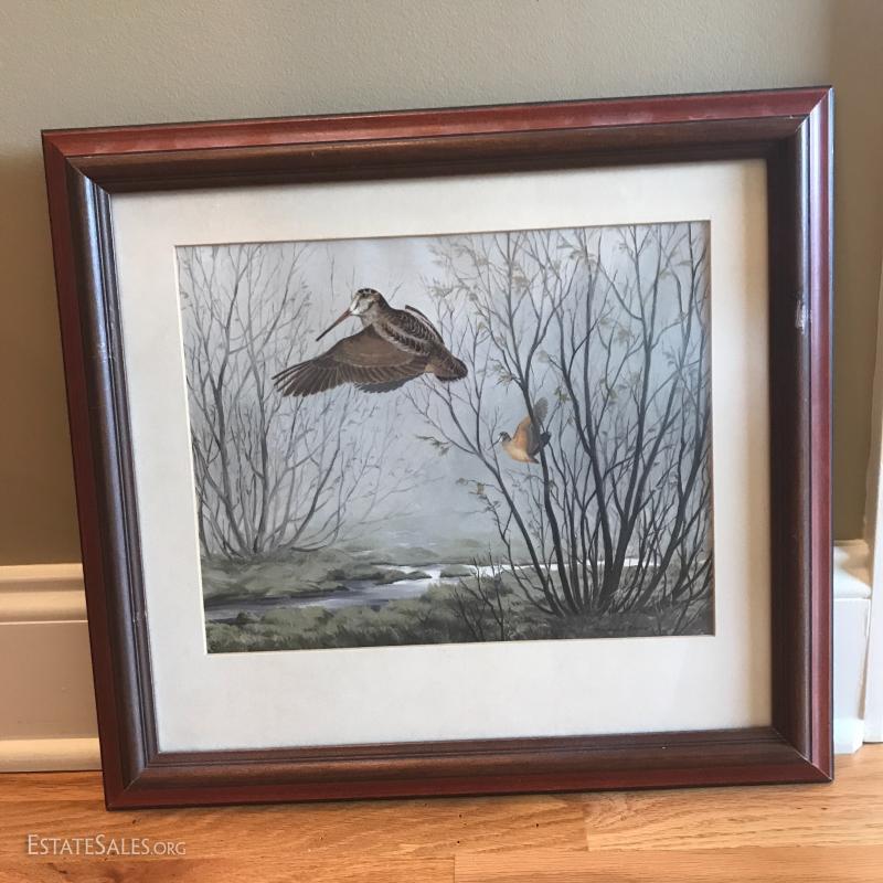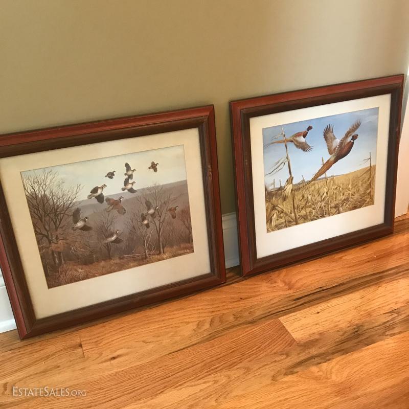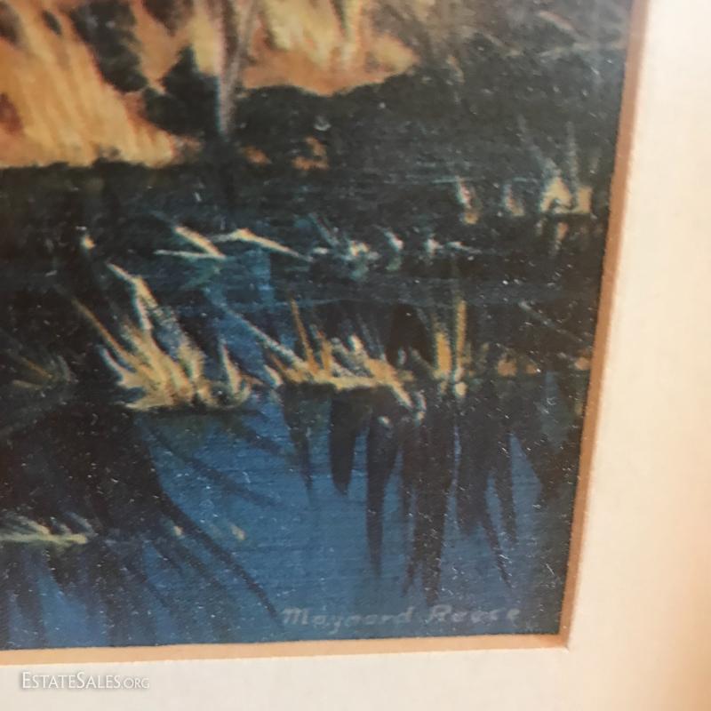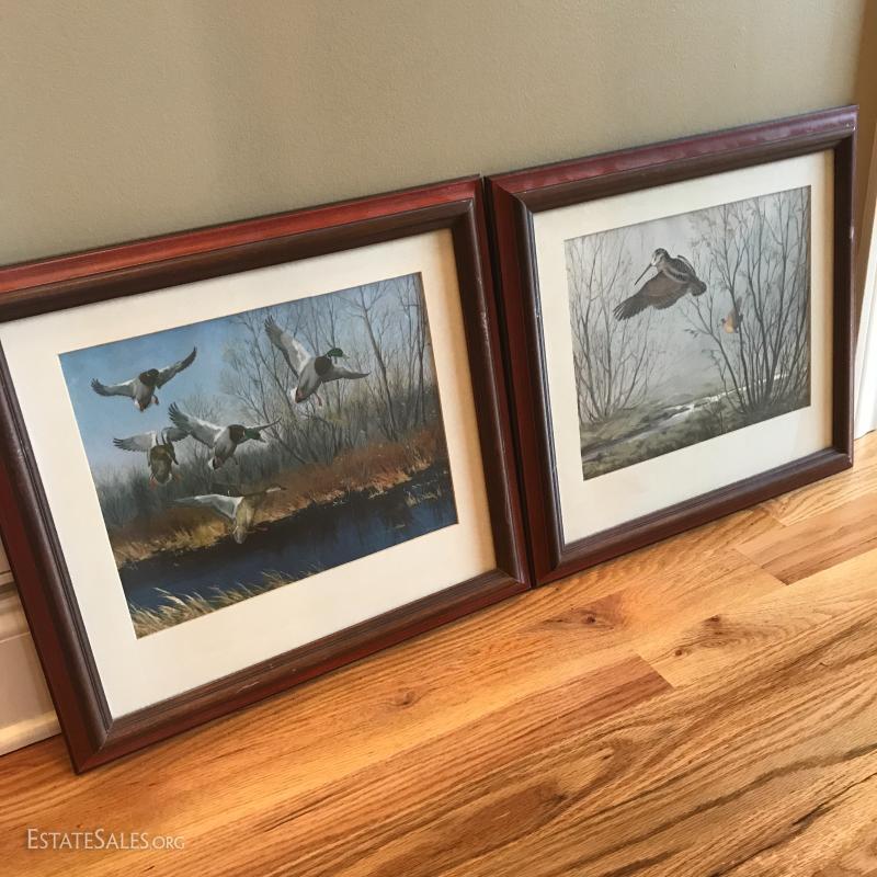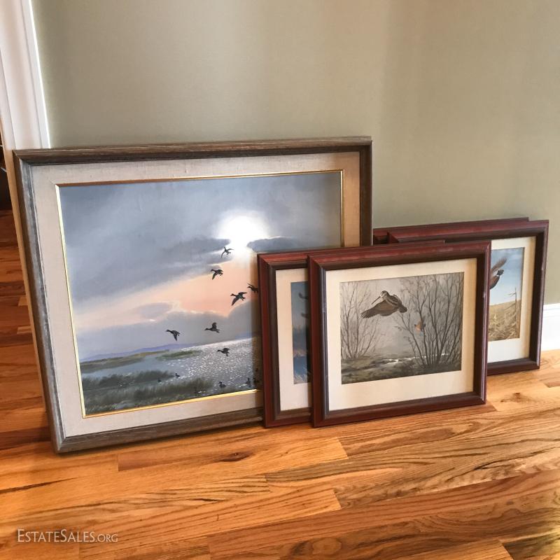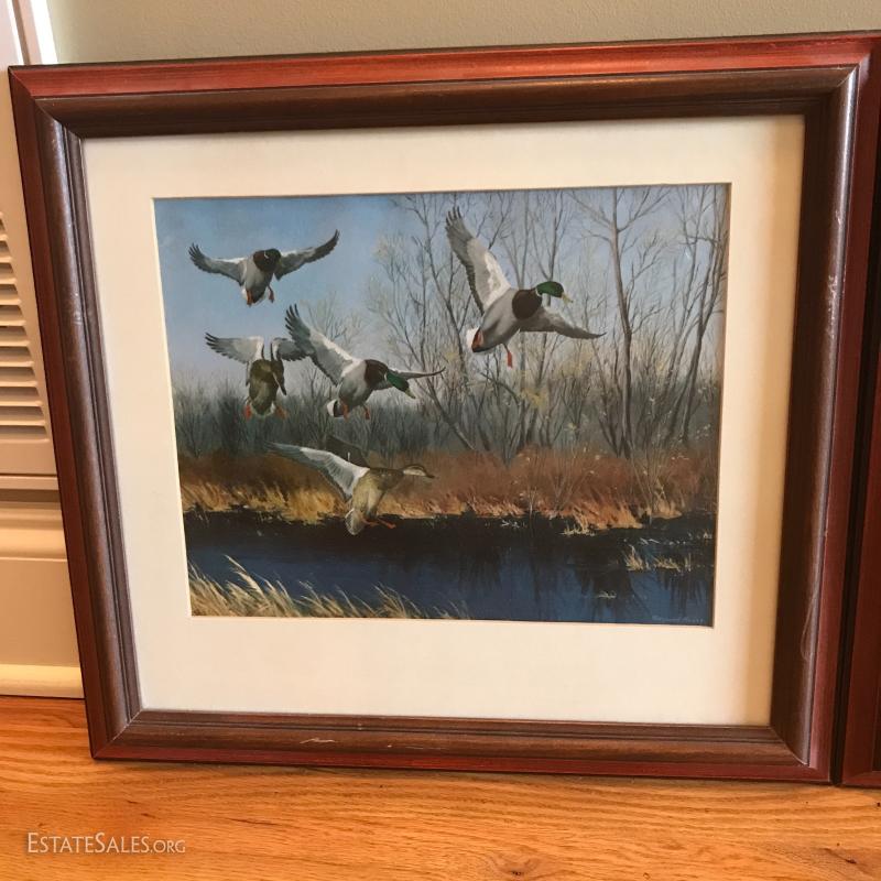 Five pieces of artwork with water fowl as the subject. One original acrylic painting by A. Matnary and four framed prints by Maynard Reece.