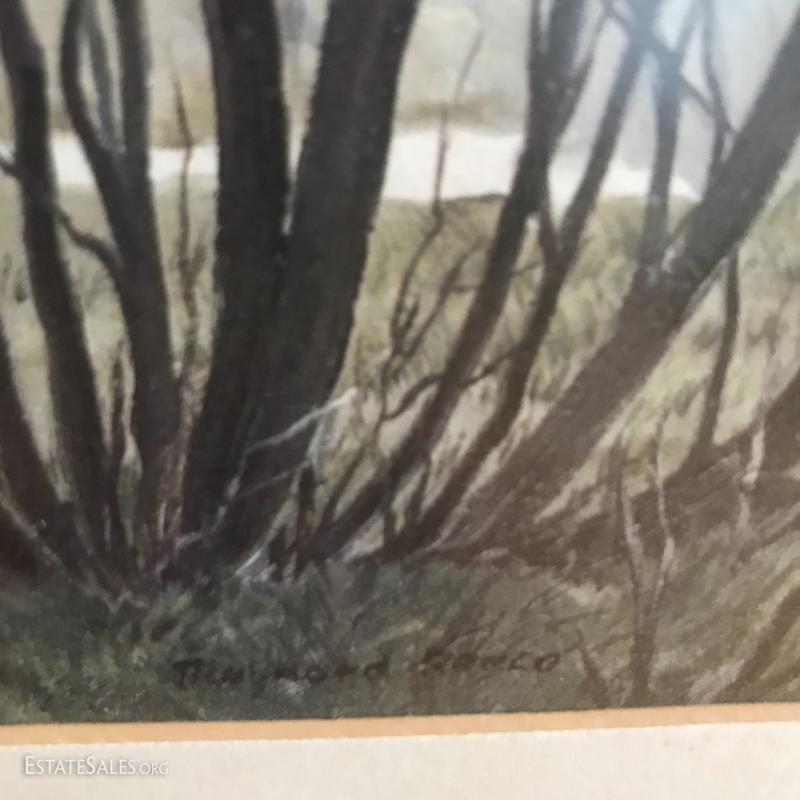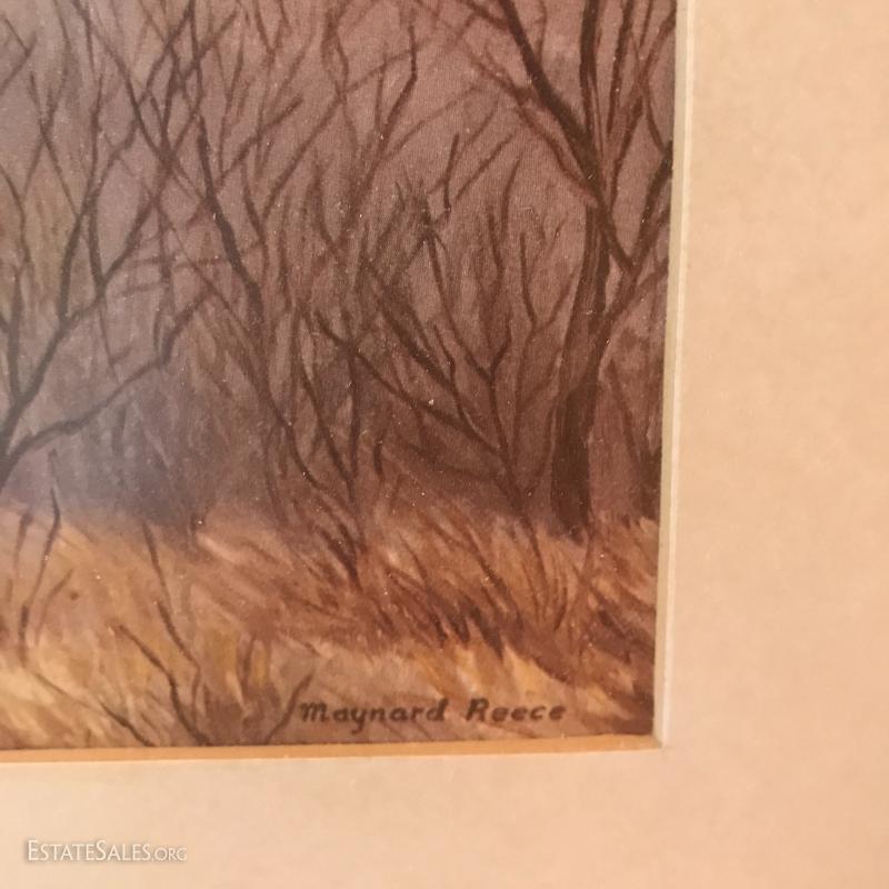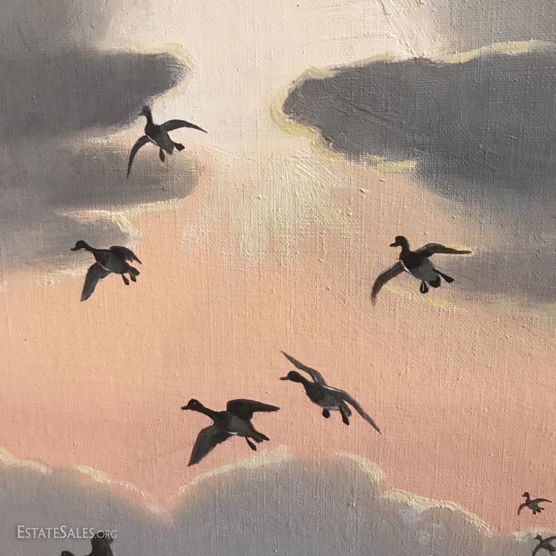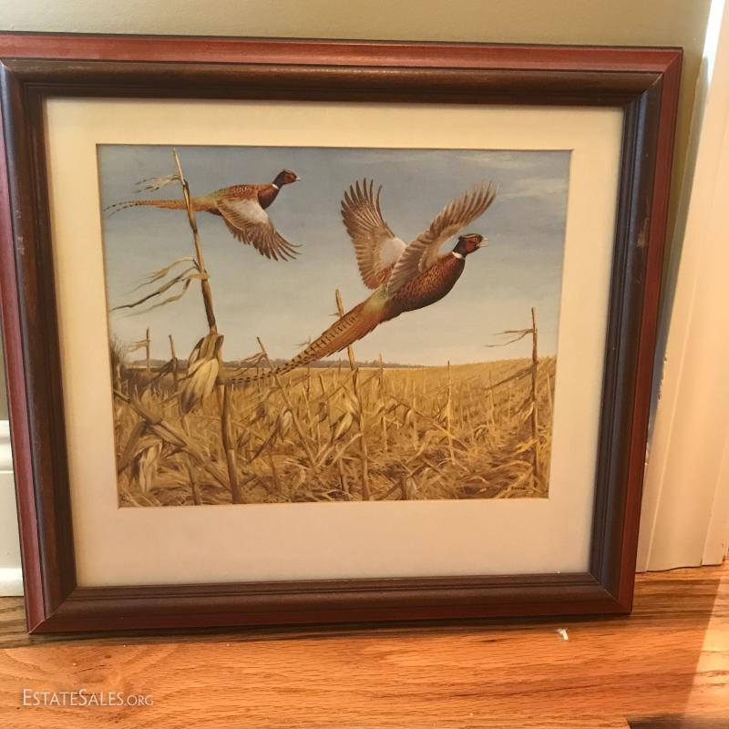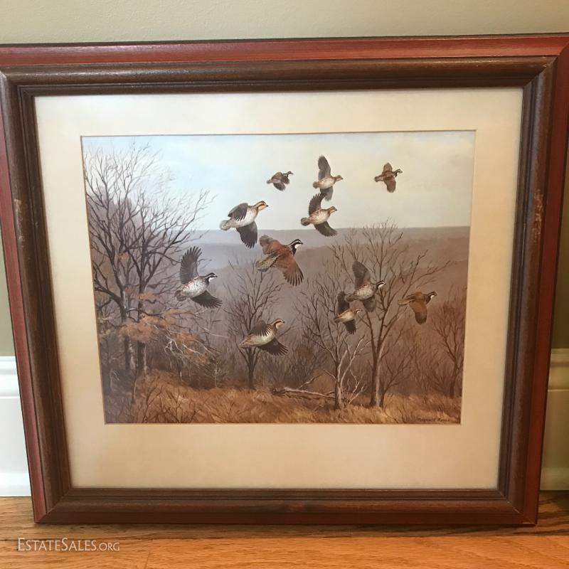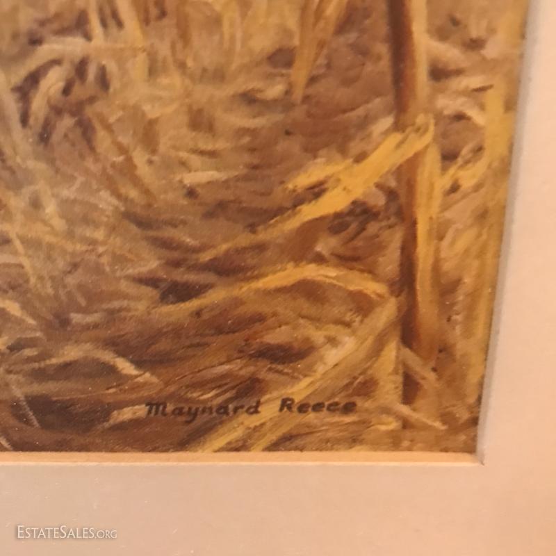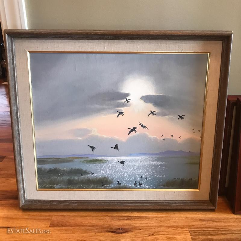 Five pieces of artwork with water fowl as the subject. One original acrylic painting by A. Matnary and four framed prints by Maynard Reece.