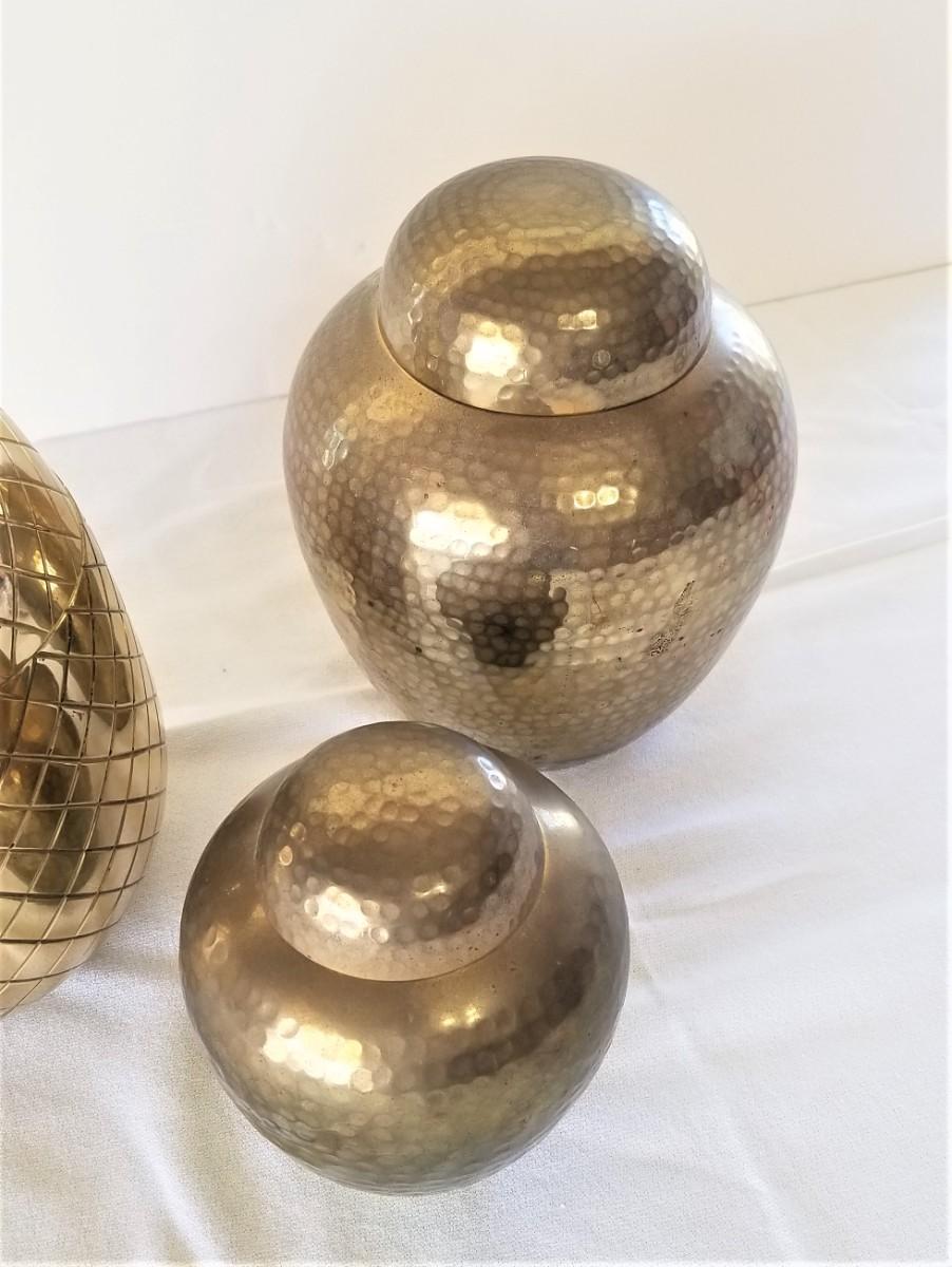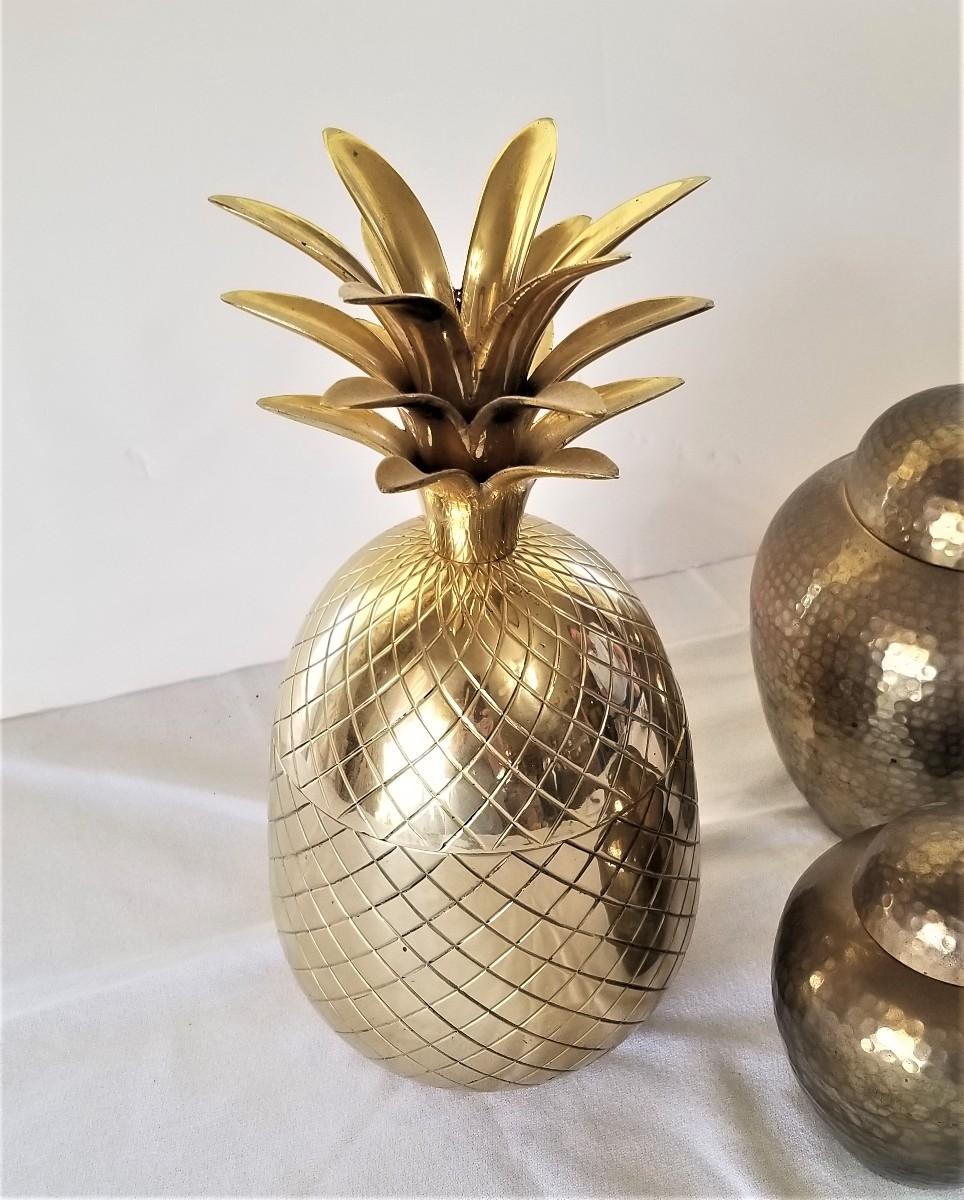 Attractive brass lot here - Great Pineapple - perfect for holidays, etc - top lifts off, 12" tall, and two brass lidded urns - the larger 7.5" tall, the smaller 5" tall. All in good gently used condition.