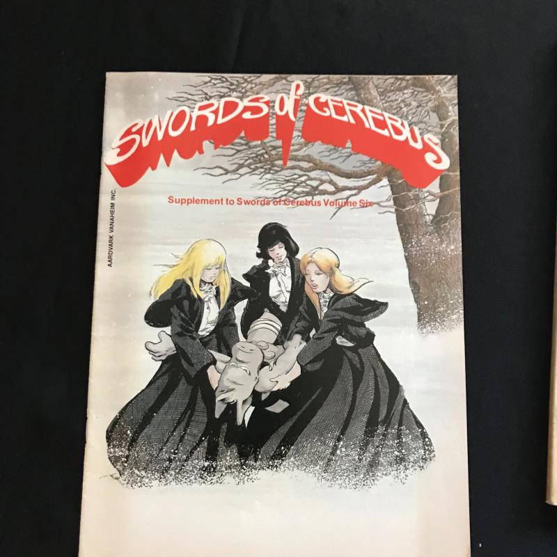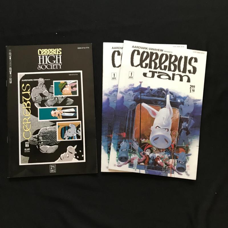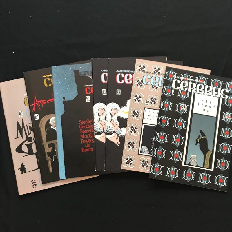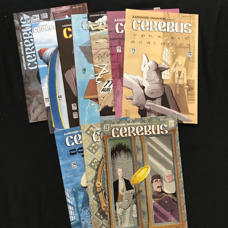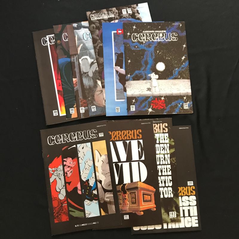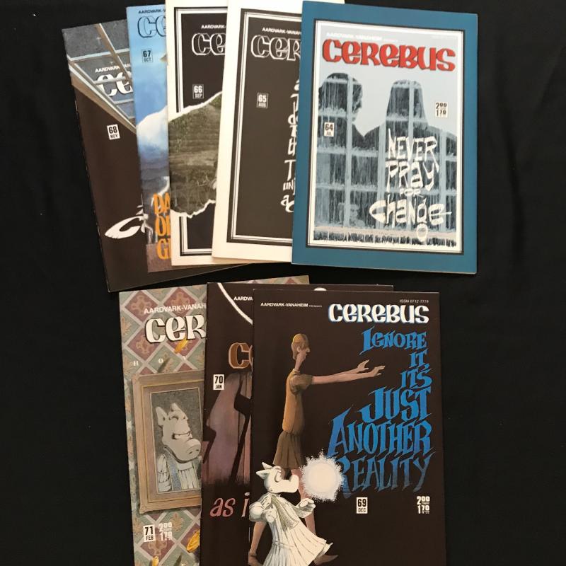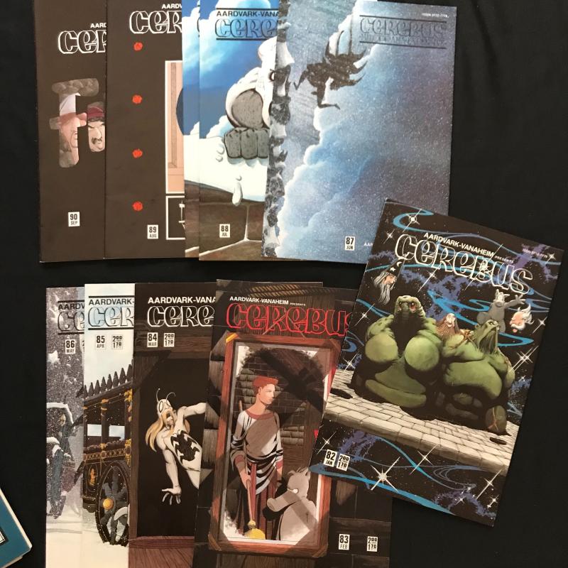 Large lot of "Cerebus" comics published by Aardvark-Vanahem Inc. See photos for issue numbers. Published in 1980s. Includes two "Swords of Cerebus." 70 total issues in this lot. Fits in one Priority Box or local pick up in Asheville, NC.