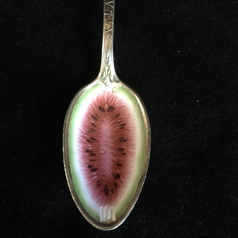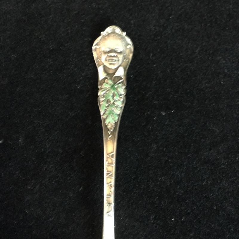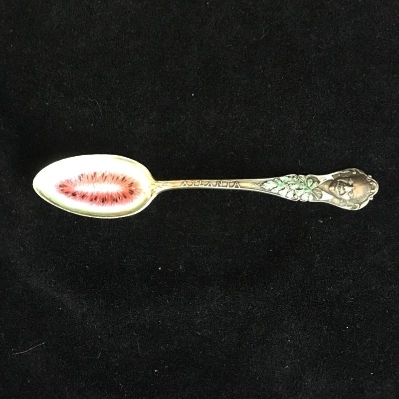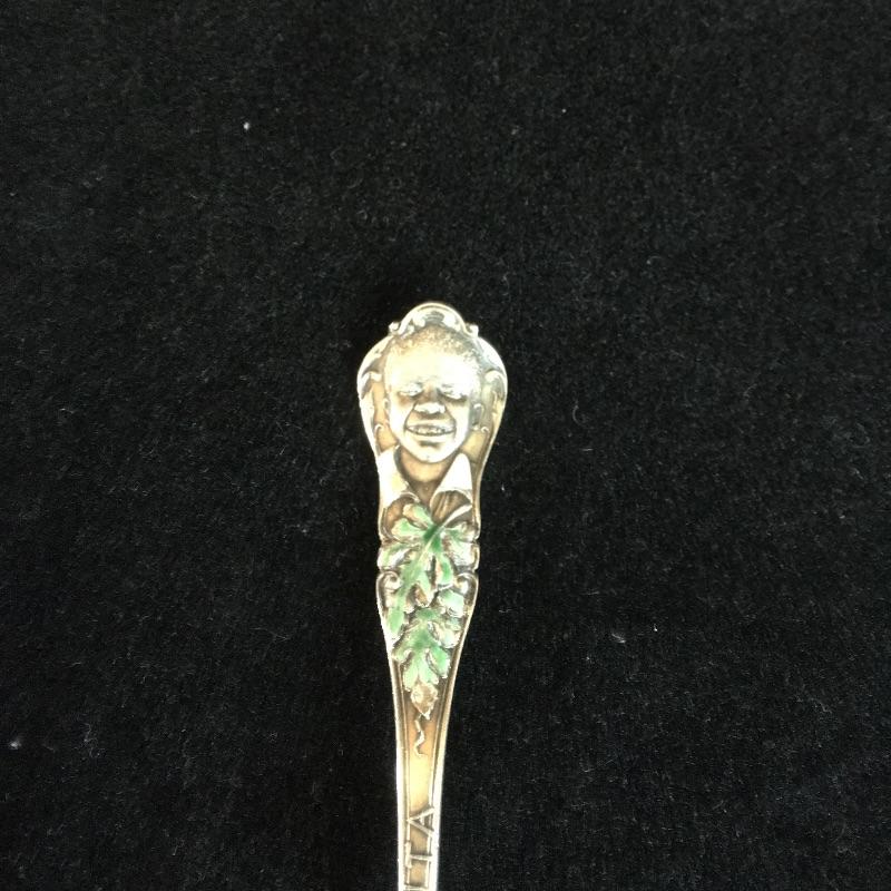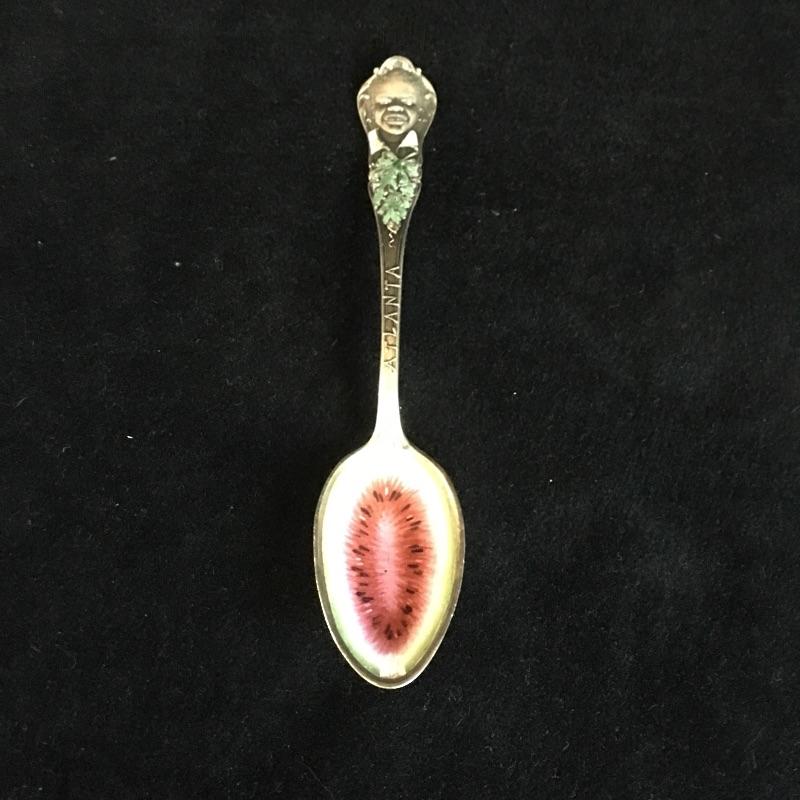 Charles W. Crankshaw 1895 Black Americana Atlanta souvenir sterling spoon. The man at the top has a white enamel collar with green leaves below and an enamel watermelon on spoon. Spoon measures 5.5” long.