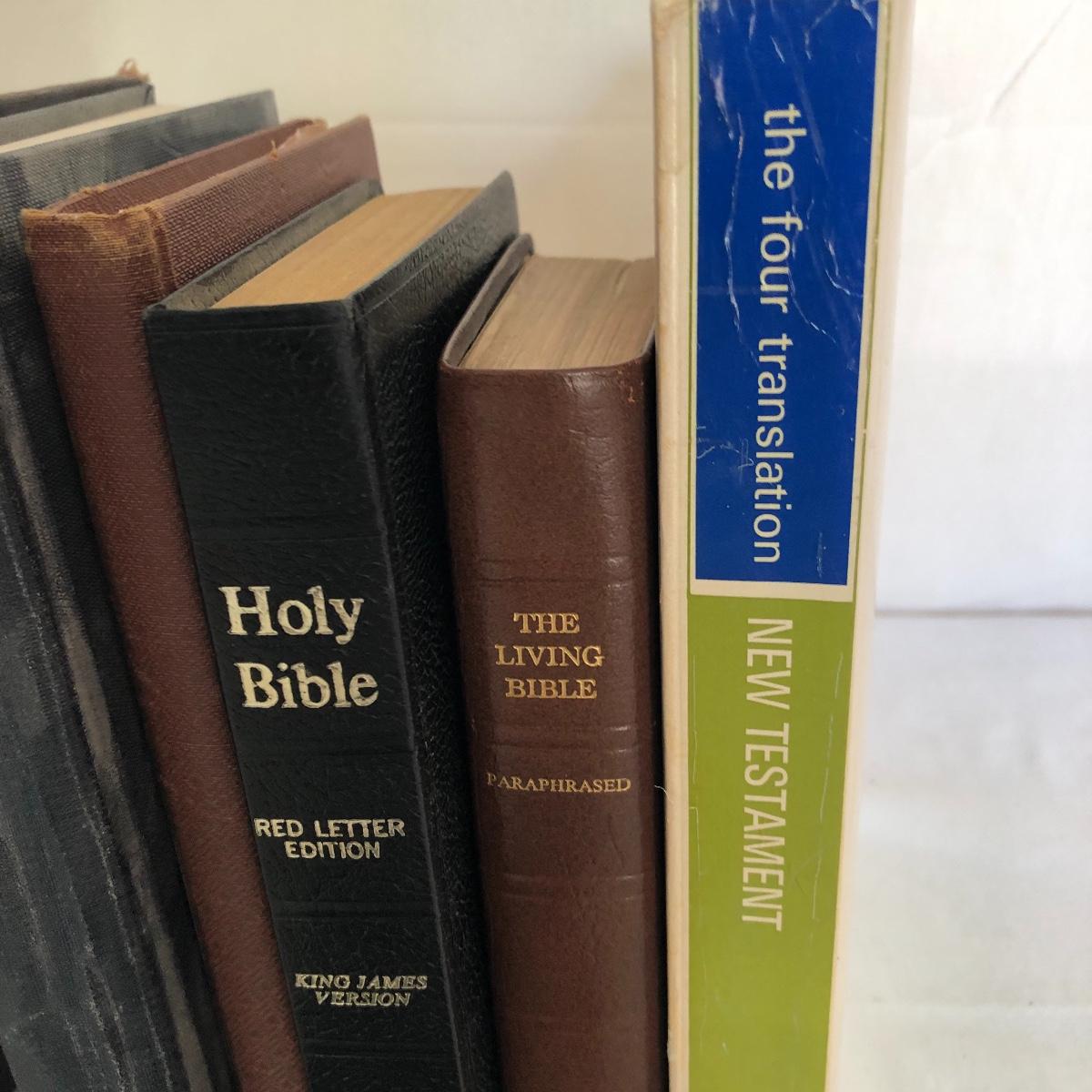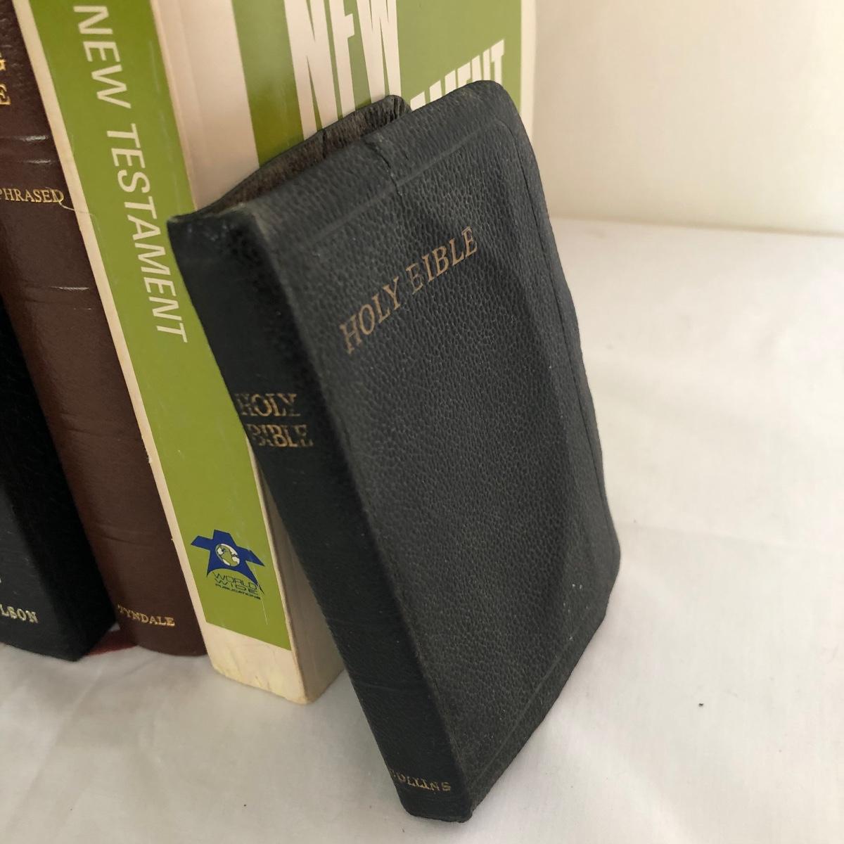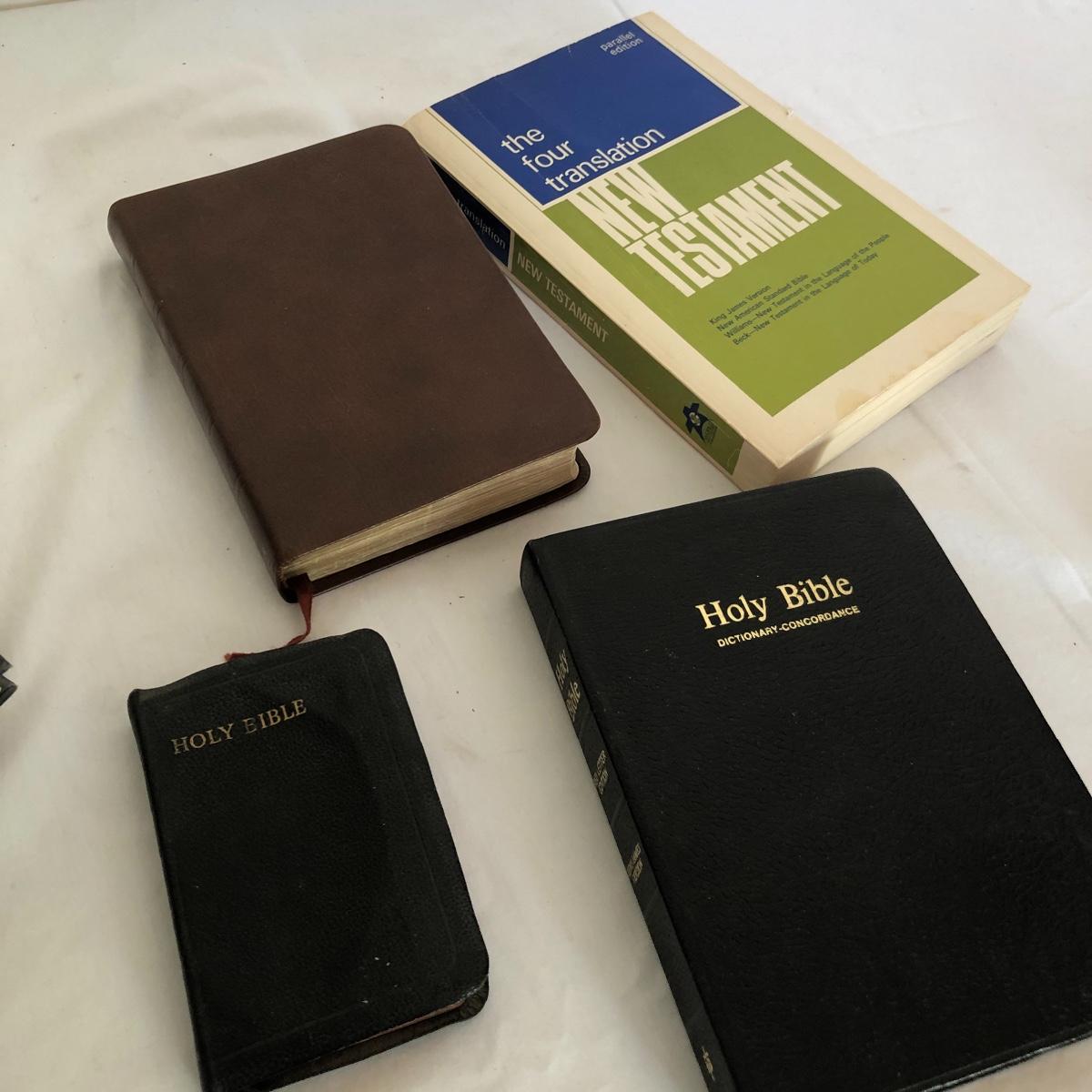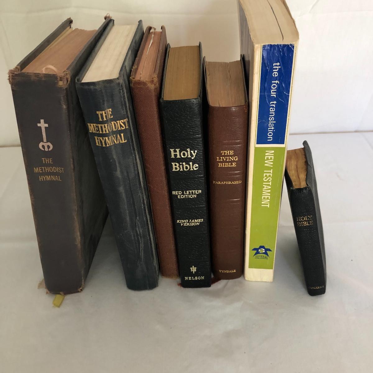 This lot includes two crosses, a wooden sign and seven books, four of which are Bibles. Shipping Available.