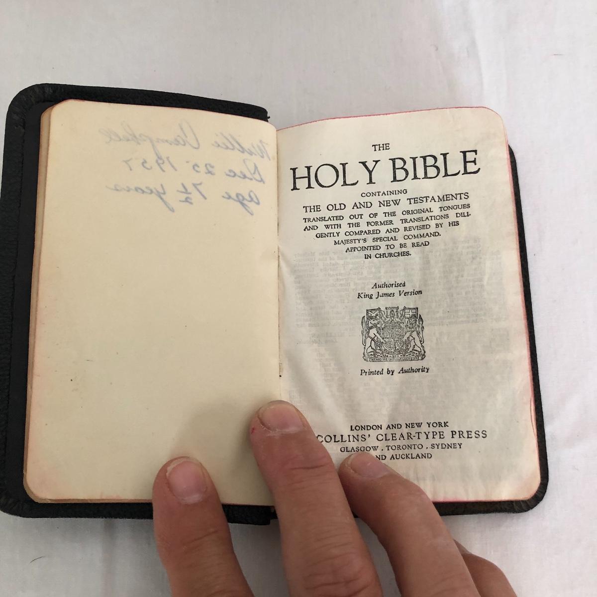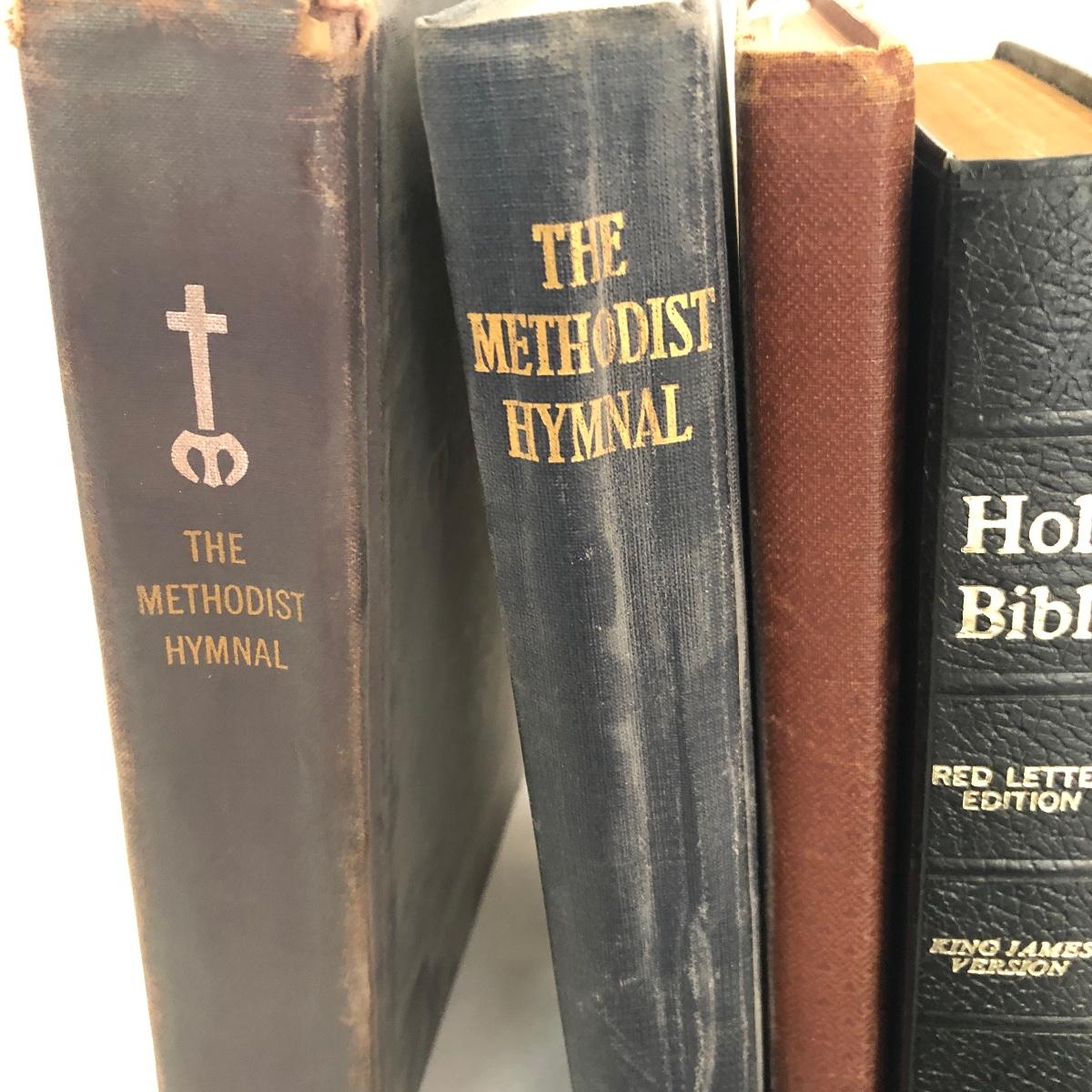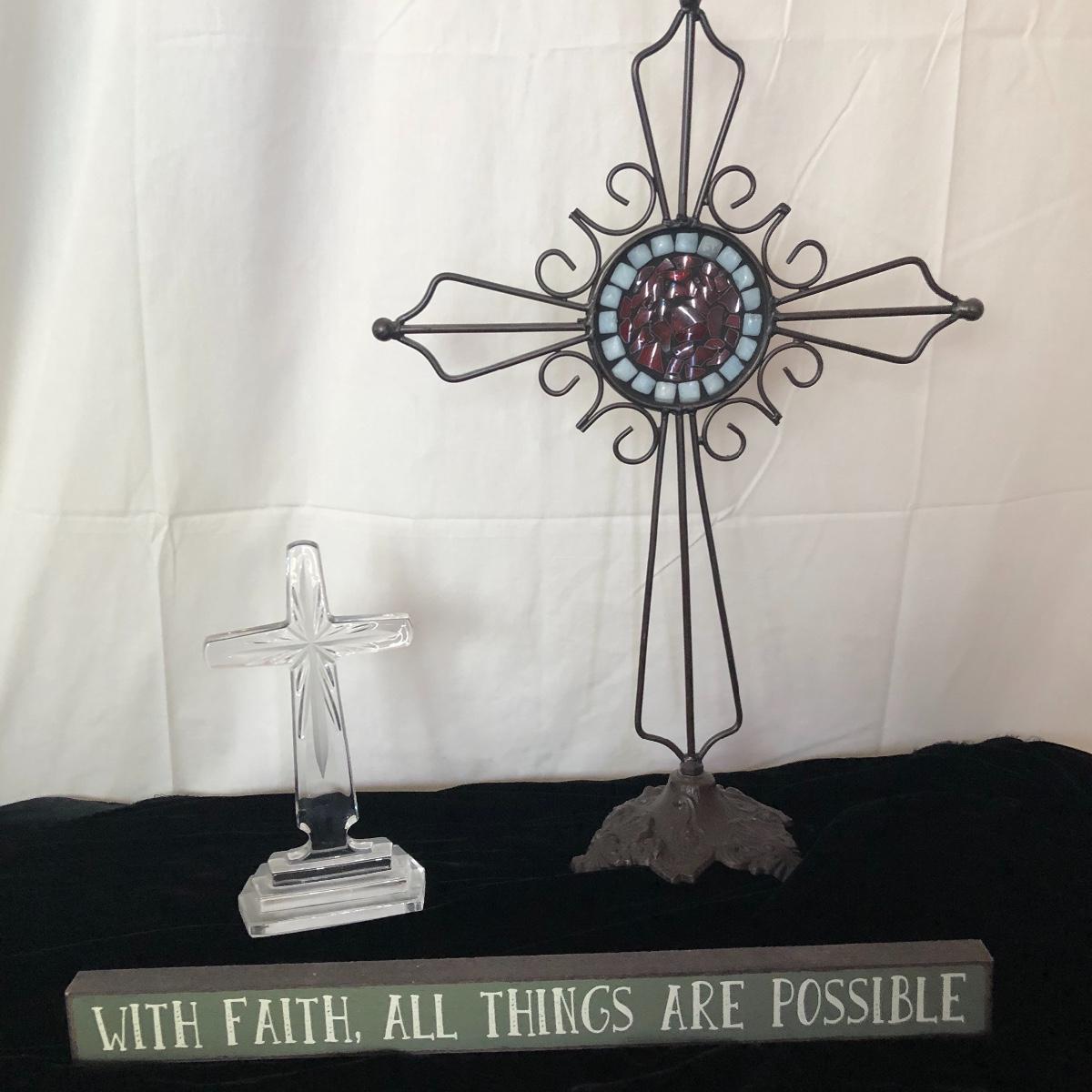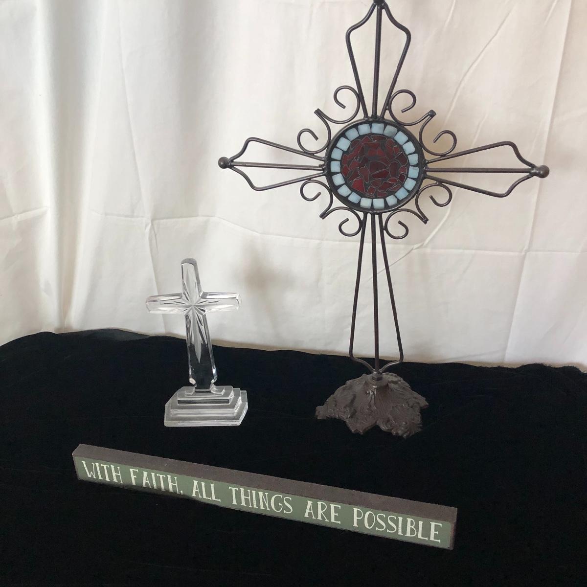 This lot includes two crosses, a wooden sign and seven books, four of which are Bibles. Shipping Available.