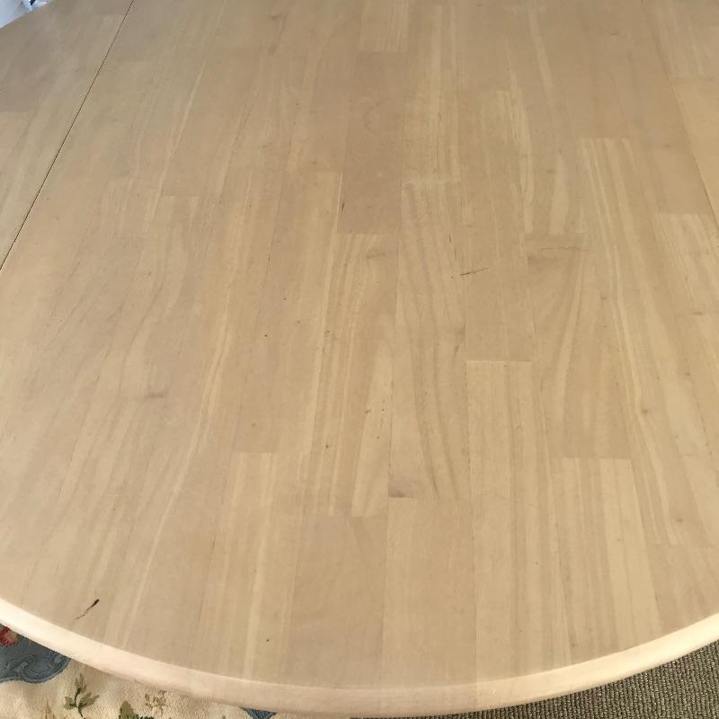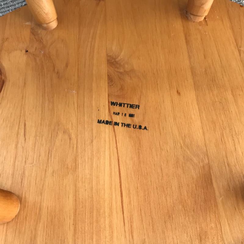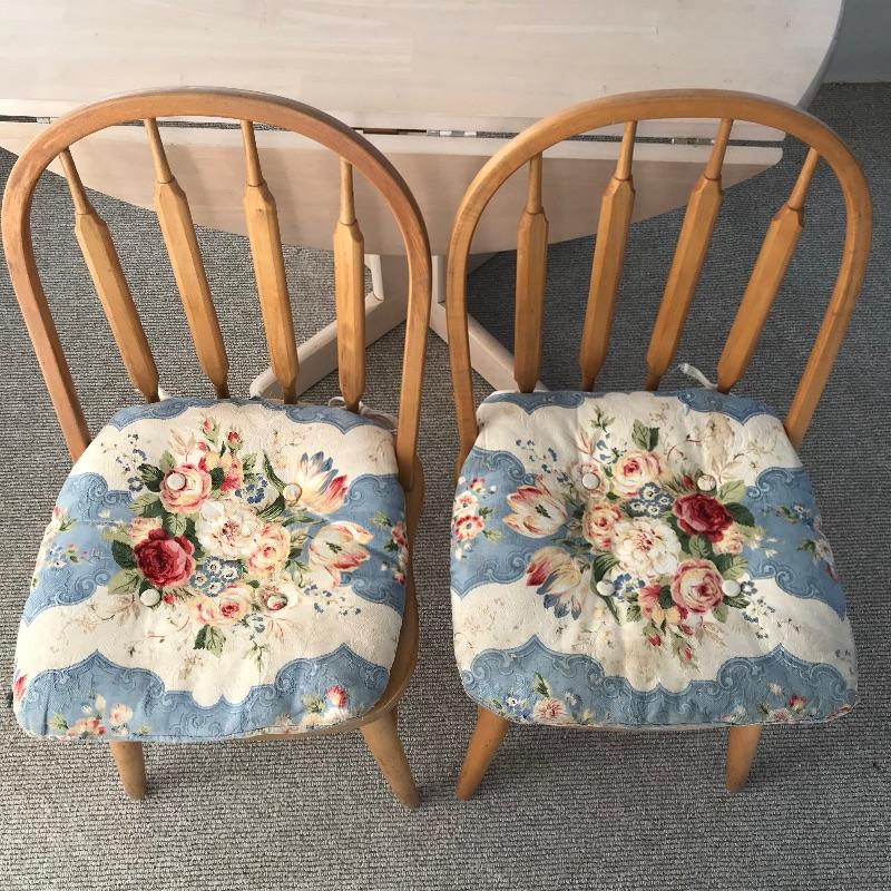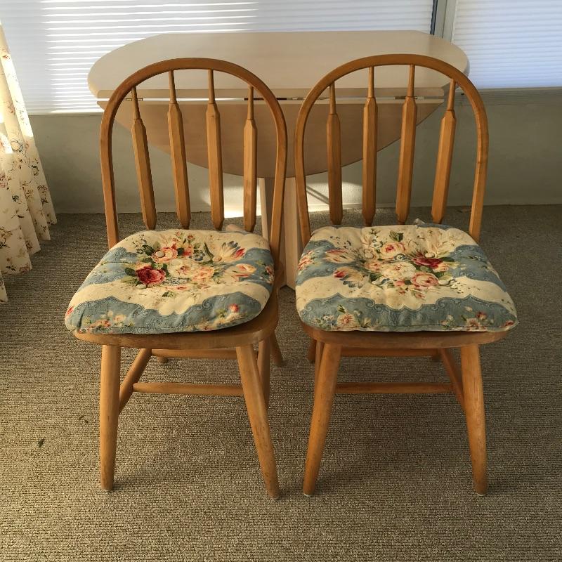 Lovely white wood drop leaf kitchenette table with two chairs. Table is perfect for smaller spaces, measuring approximately 40”d x 29.75” when open. We’ve paired two charming Whittier chairs in fine shape with rose adorned removable cushions. Chairs measure approximately 16” x 16.25” x 32.75” with a seat height at 18”. The legs all show some dirt and wear, but all furniture is in sturdy condition. See photos. No shipping.