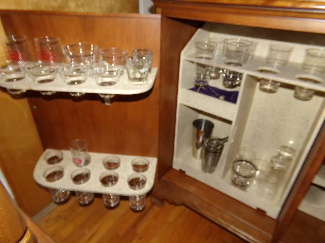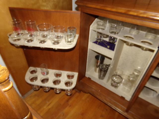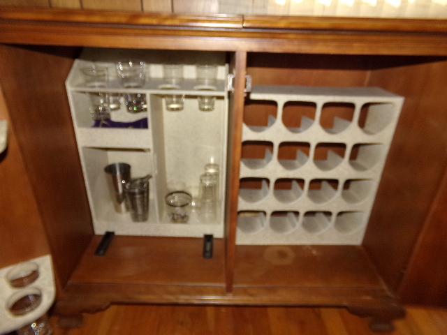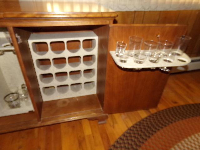 2 CABINET DOORS OPEN TO A WINE RACK ON THE RIGHT AND A SLIDING (FORWARD AND BACK) INSERT ON THE LEFT FOR GLASSES AND LIQUOR BOTTLES