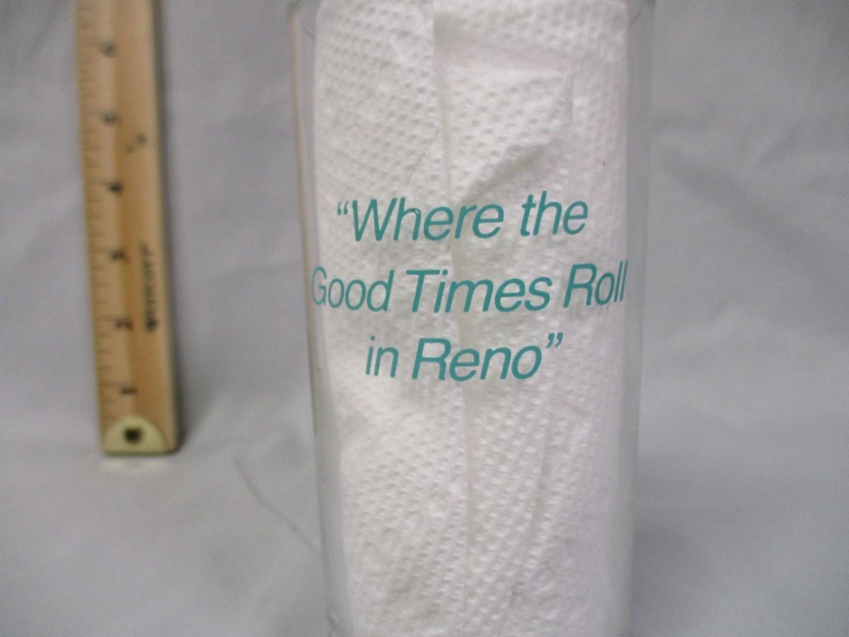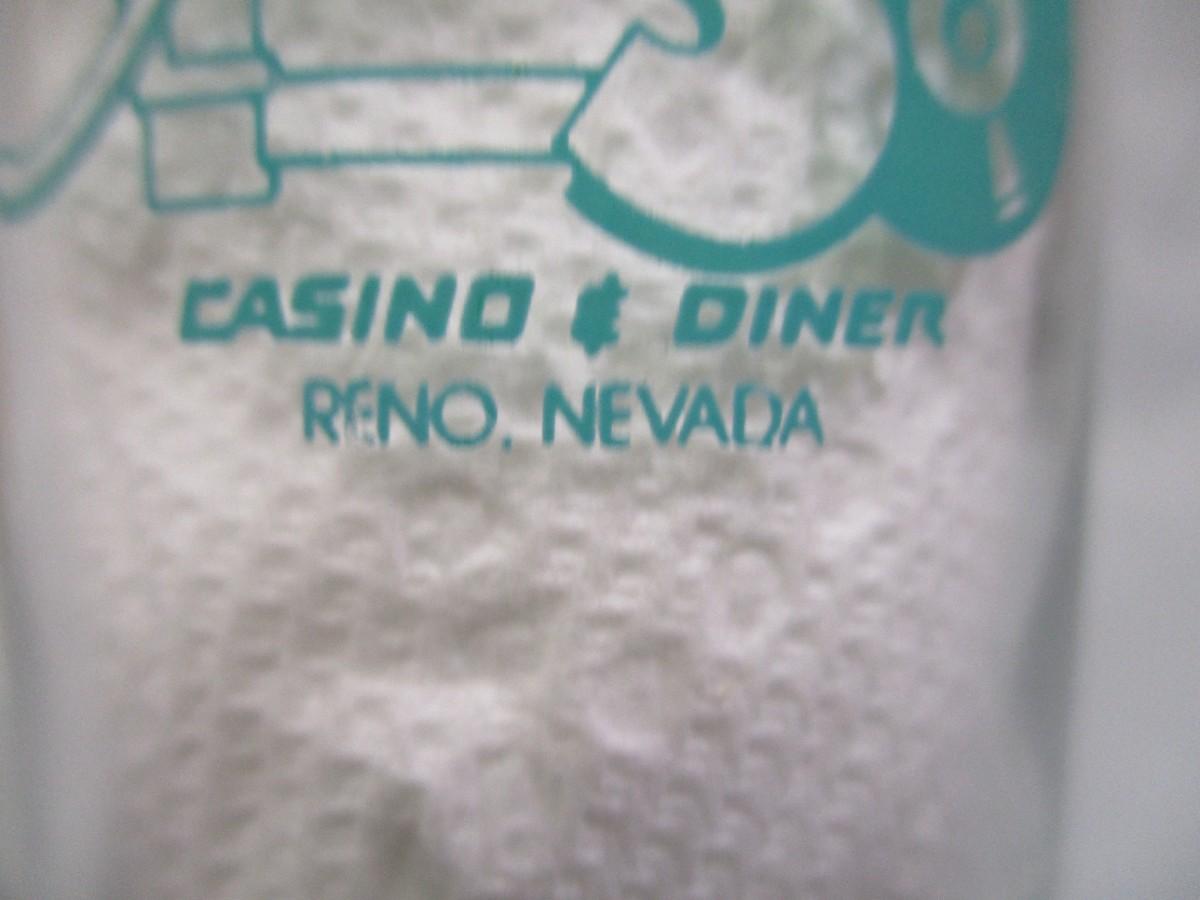 Written on the back of the glass is "Where the Good Times Roll in Reno." This glass is 4 - 1/2" tall and is in excellent condition.
