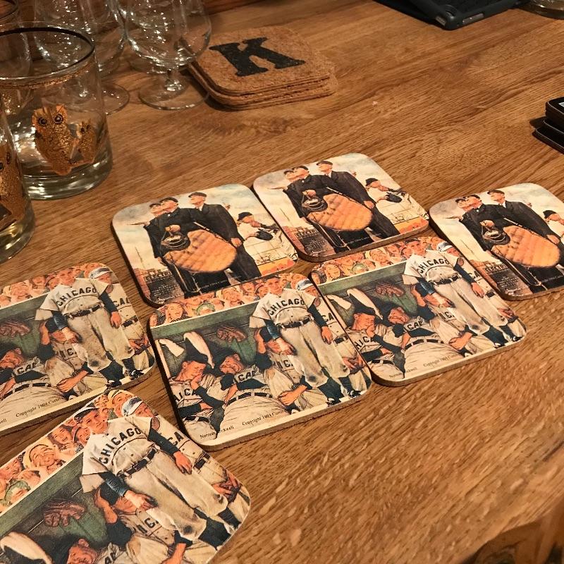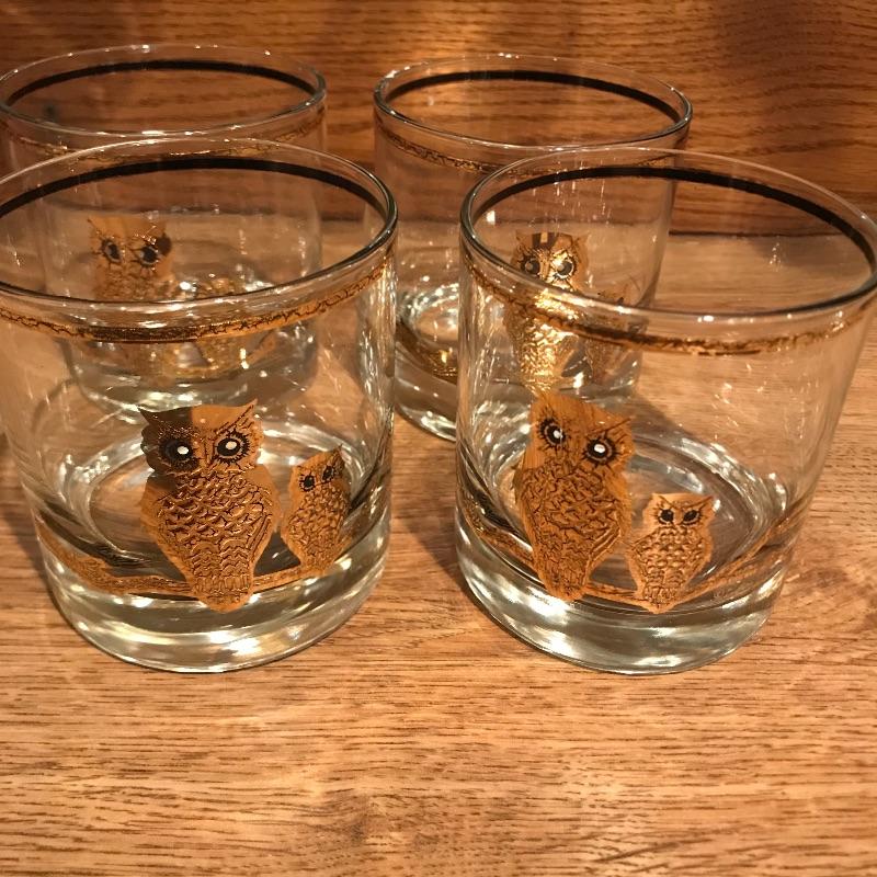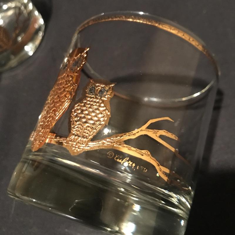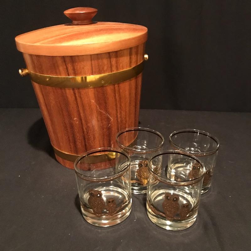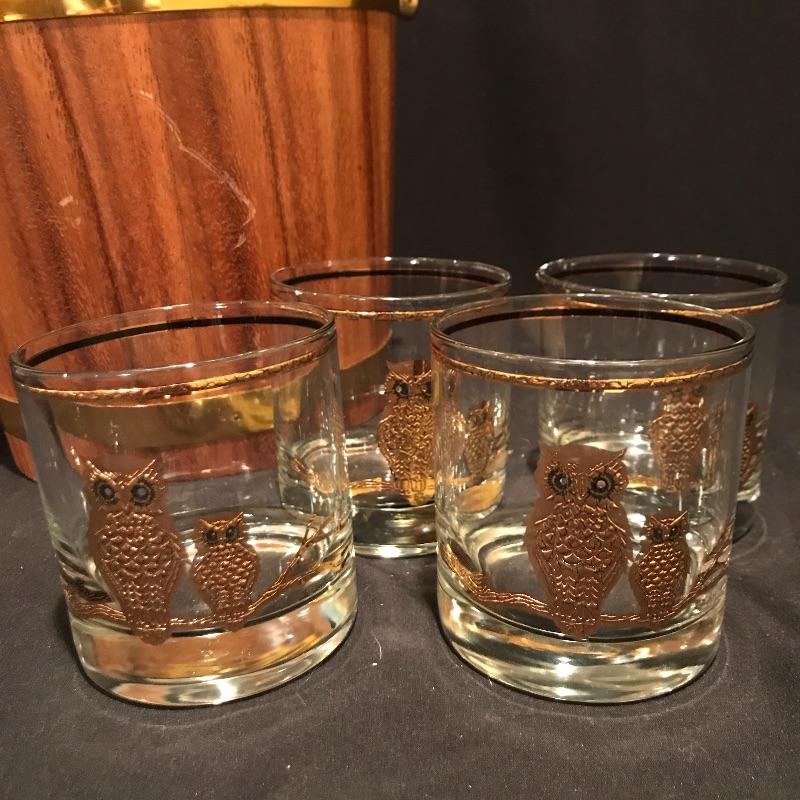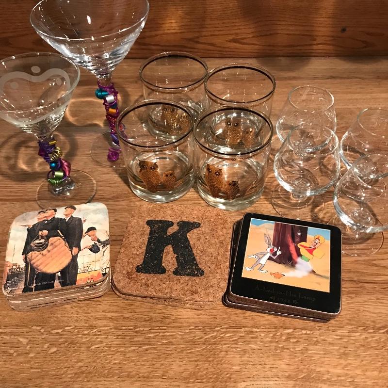 Lot includes 4 MCM Gold trimmed Owl Glasses by Culver Ltd., 2 colorful stemmed Martini glasses, 4 Cordials, Wooden Ice Bucket and three sets of coasters (one with “K” on each, one set of baseball images and one set with Bugs Bunny and Friends images). Ice bucket is missing handle and has some wear on the inside. See pics. Shipping available.
