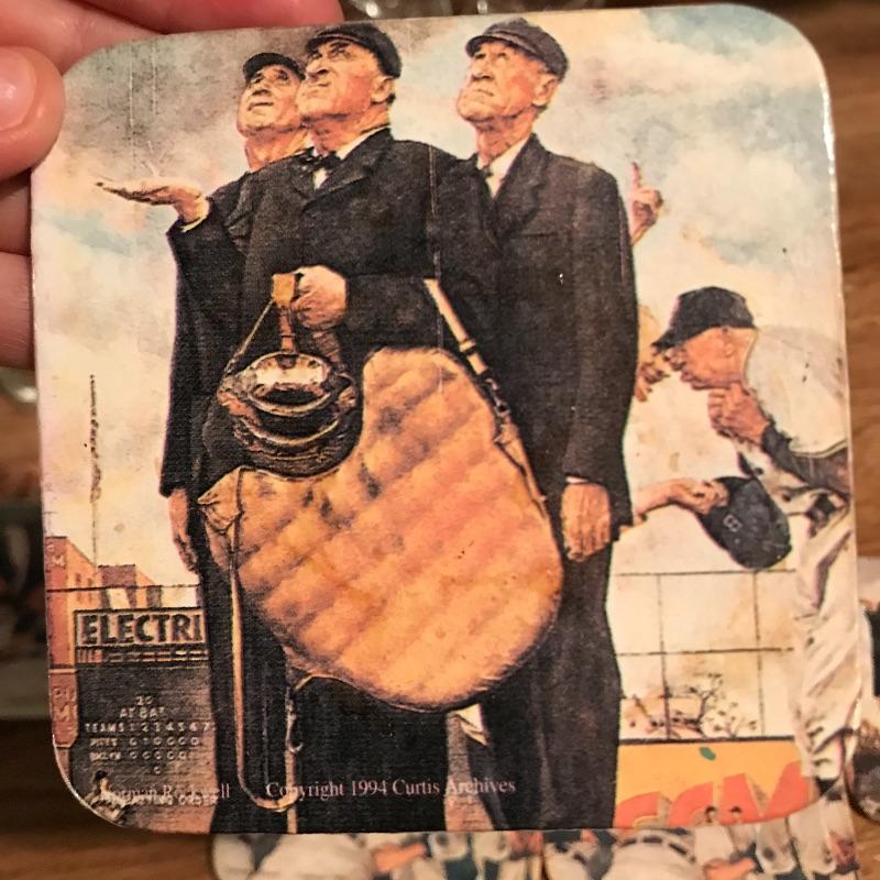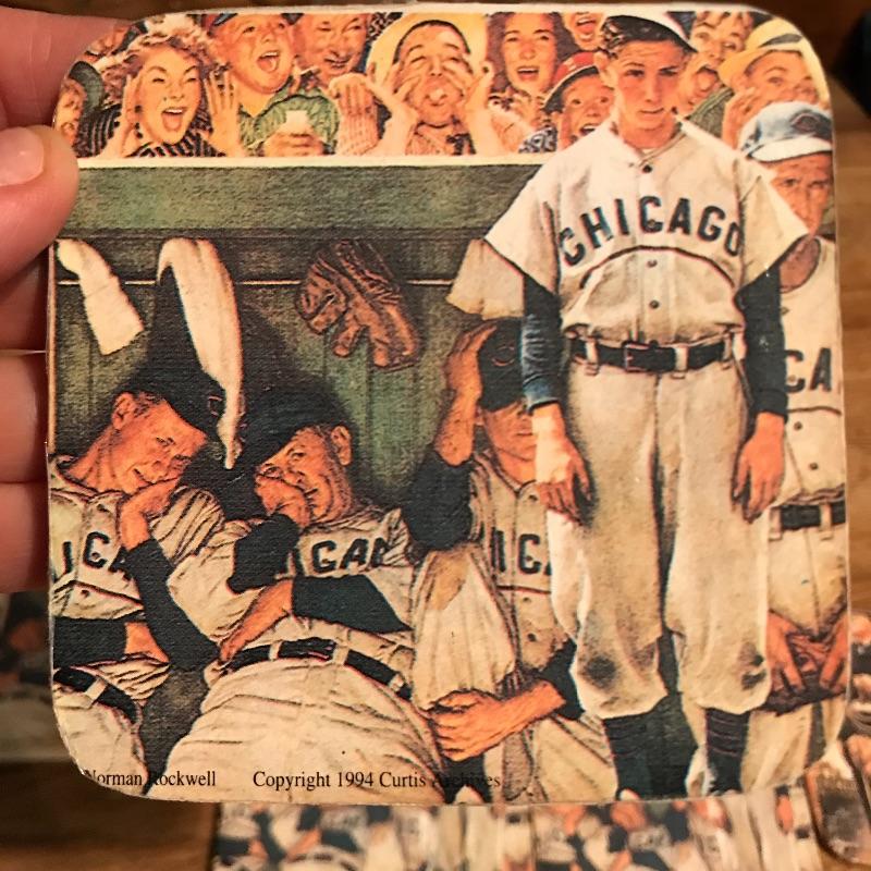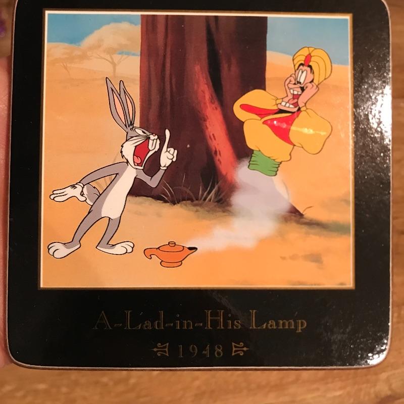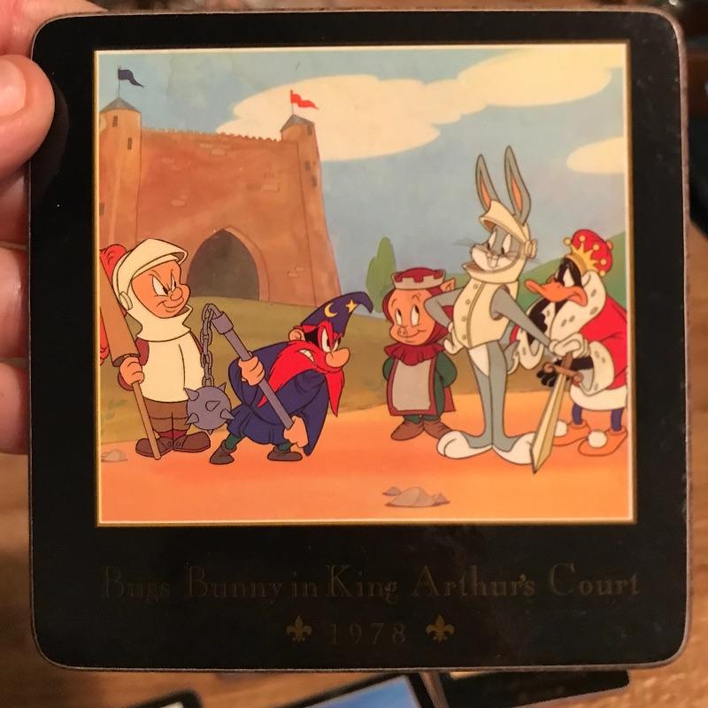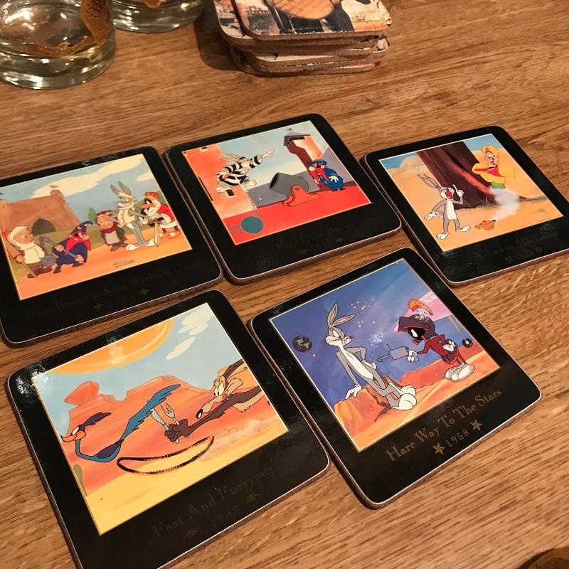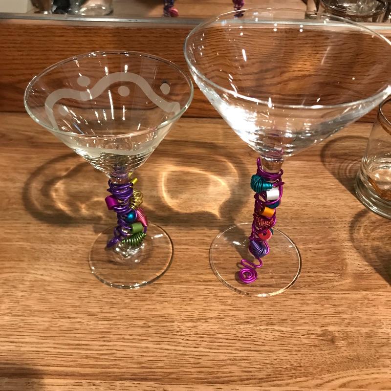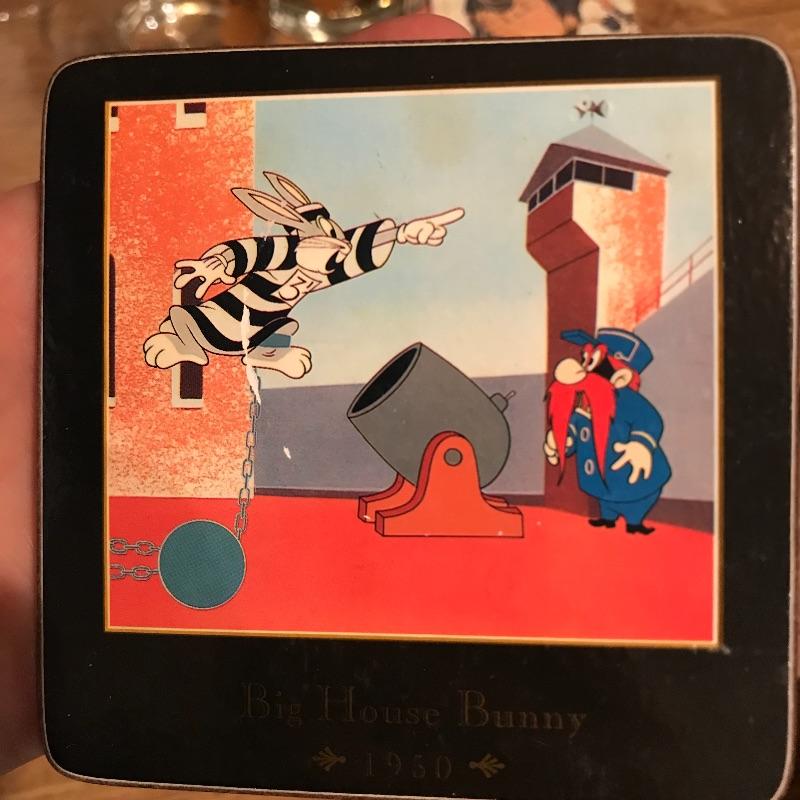 Lot includes 4 MCM Gold trimmed Owl Glasses by Culver Ltd., 2 colorful stemmed Martini glasses, 4 Cordials, Wooden Ice Bucket and three sets of coasters (one with “K” on each, one set of baseball images and one set with Bugs Bunny and Friends images). Ice bucket is missing handle and has some wear on the inside. See pics. Shipping available.