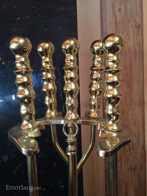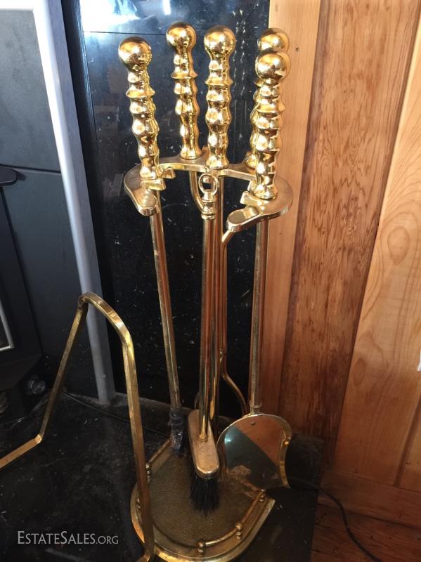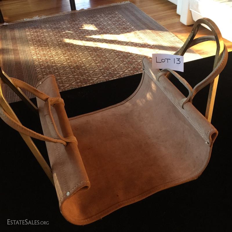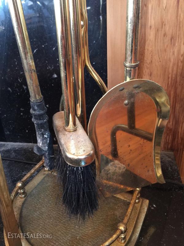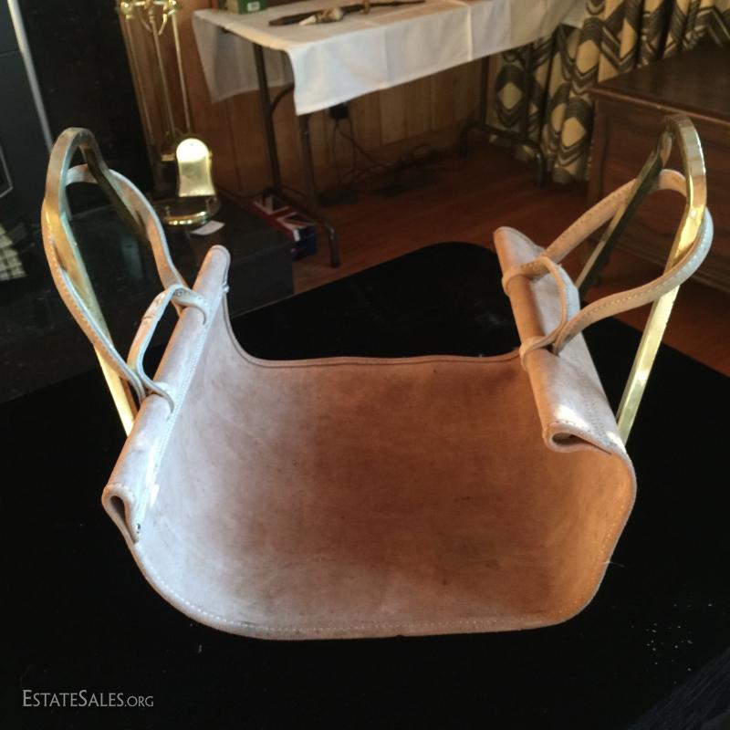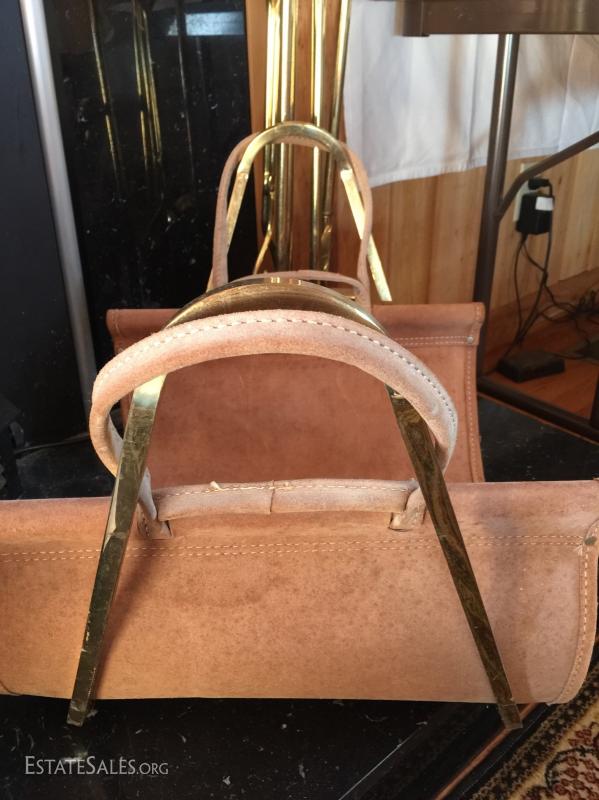 Brass and Leather firewood stand approx 16”L by 22.5”W. Leather insert is removable. Brass Tool set approx 31” tall. See photos for details. Sold as is.