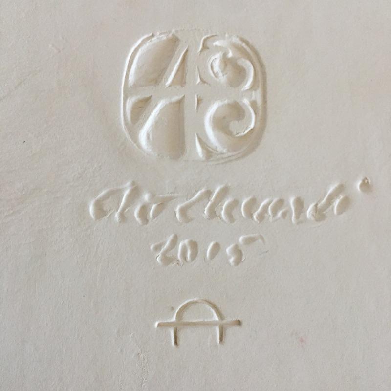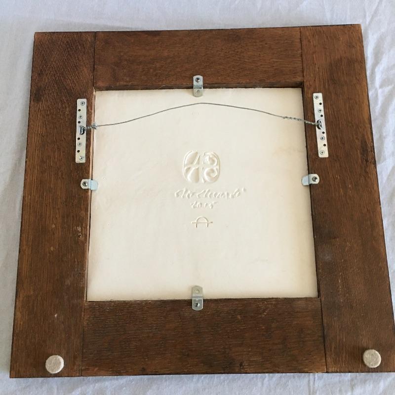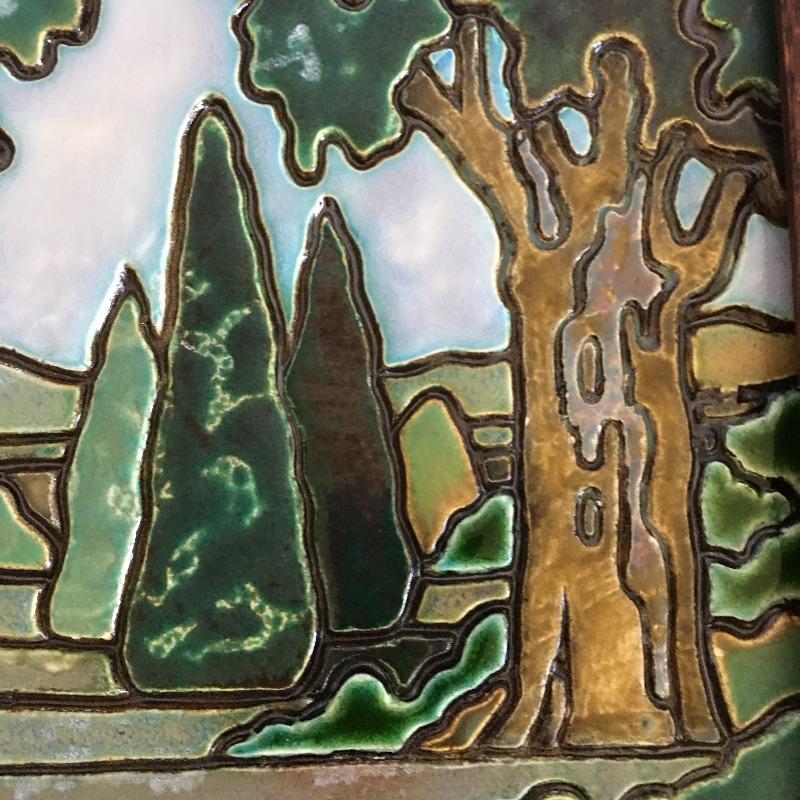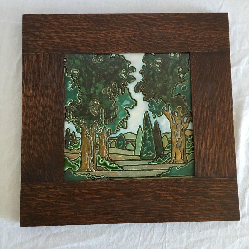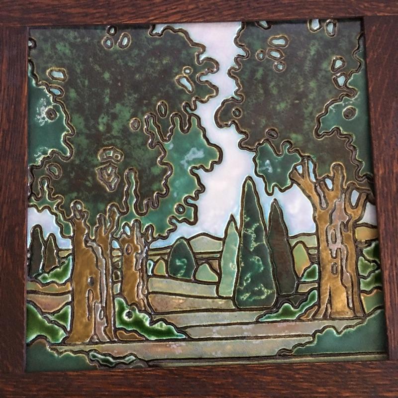 The Arts & Clay Company is dedicated to the renaissance of the arts and crafts movement in America. This 2005 tile landscape that is beautifully framed is a great contemporary piece where you can see the artist really brings nature onto it with all the intricate carving and the handsome frame. Frame measures 17.5” x 17.5” x 1”.