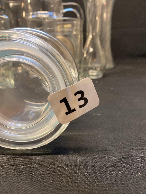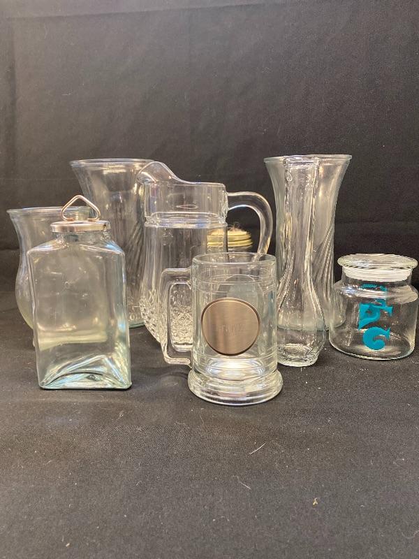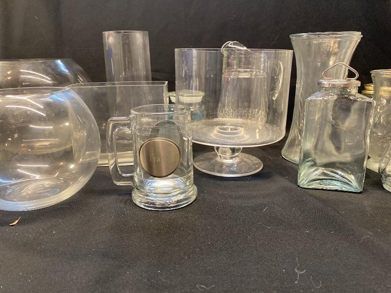 Lot 13: Trifle dish, variety of shape and different size vases, pitcher and more.