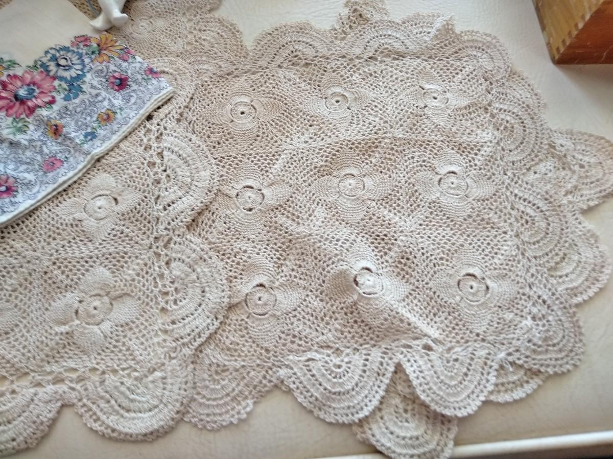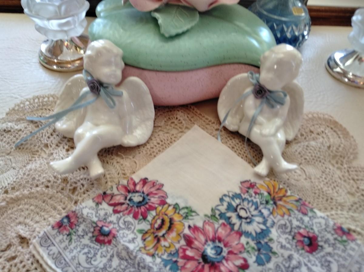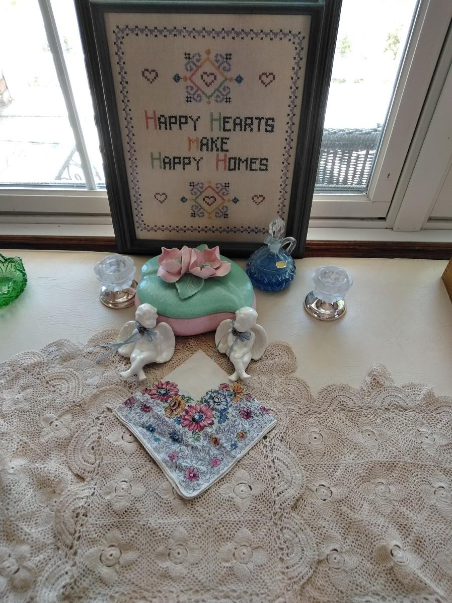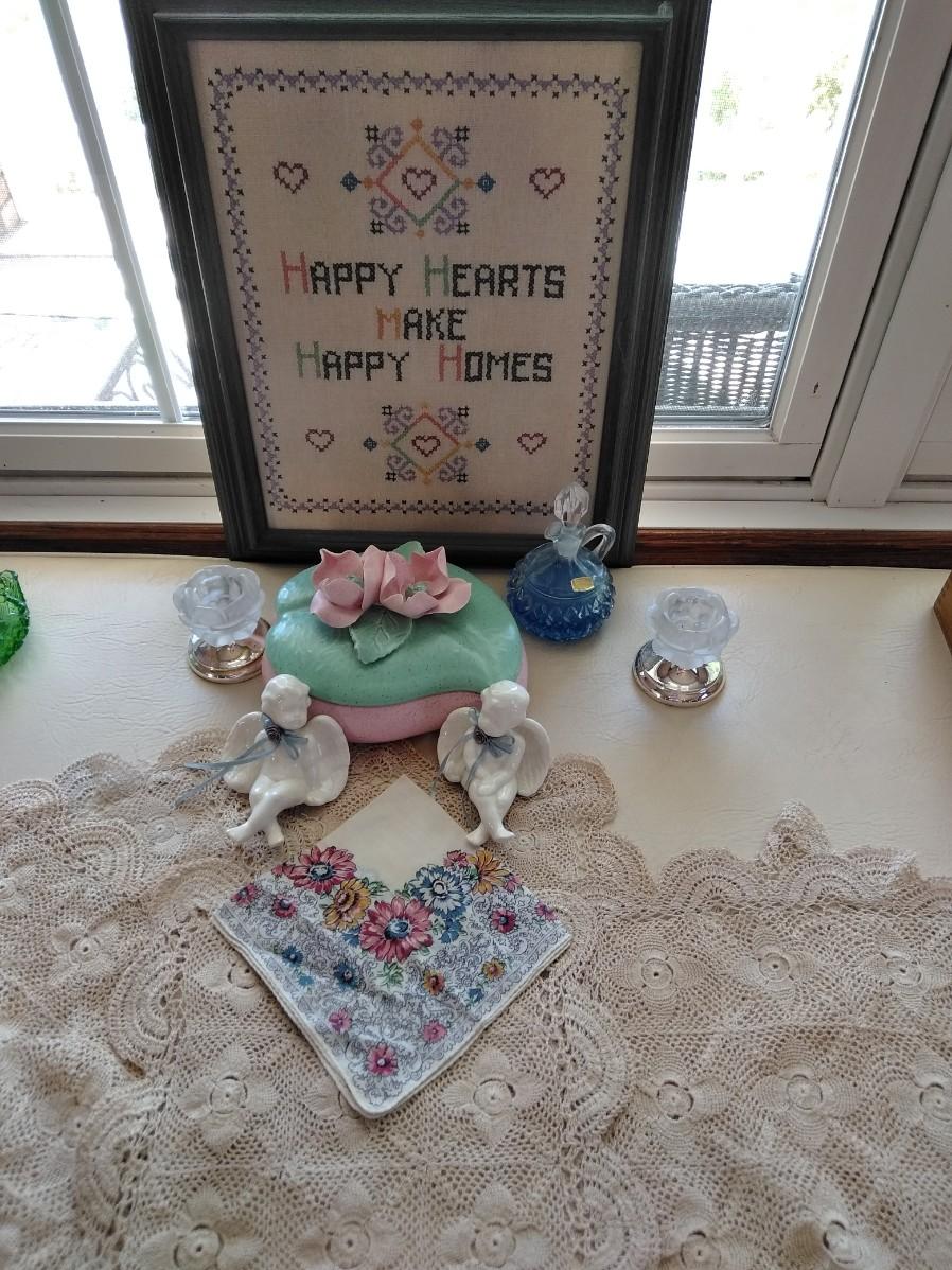 HAPPY HEARTS MAKE HAPPY HOMES FRAMED EMBROIDERED WALL HANGING, VINTAGE LIDDED USA MARKED DISH WITH FLOWERS, TWO SHELF SITTING ANGELS, PURFUME BOTTLE, ROSE CANDLE HOLDERS, AND A COLLECTION OF KNITTED DOILIES.